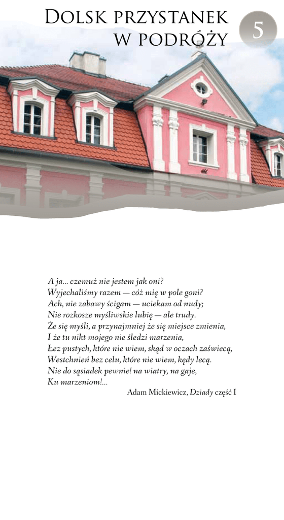 Dolsk przystanek w podróży A ja… czemuż nie jestem jak oni? Wyjechaliśmy razem — cóż mię w pole goni? Ach, nie zabawy ścigam — uciekam od nudy; Nie rozkosze myśliwskie lubię — ale trudy. Że się myśli, a przynajmniej że się miejsce zmienia, I że tu nikt mojego nie śledzi marzenia, Łez pustych, które nie wiem, skąd w oczach zaświecą, Westchnień bez celu, które nie wiem, kędy lecą. Nie do sąsiadek pewnie! na wiatry, na gaje, Ku marzeniom!… Adam Mickiewicz, Dziady część I 5 Dolsk prZystanek w podróZy Dolsk prZystanek w podróZy P odróże ku marzeniom były nieodłącznym atrybutem życia Adama Mickiewicza. Można by rzec, że poetycka droga wieszcza to jedna wielka podróż, z krótkimi przystankami, gdzie wrażenia swe przelewał na papier. Widoki z podróżnej kolaski przesuwały się jak w kalejdoskopie, ruchome obrazy syciły wyobraźnię, gdy z zakurzonych traktów wyłaniały się nagle bajkowe landszafty, gdzie przyroda do spółki z pogodą malowały barwne obrazy przesycone cynobrem zachodzącego słońca, świtu w kolorze marengo, zmierzchów w ultramarynie. Podróż, którą autor odbył w 1825 roku do Akermanu w towarzystwie Karola Marchockiego sprawiła, że powstało jedno z najwspanialszych literackich arcydzieł. Nie sposób go nie przypomnieć na szlaku Podróży z Panem Tadeuszem… Wpłynąłem na suchego przestwór oceanu, Wóz nurza się w zieloność i jak łódka brodzi, Śród fali łąk szumiących, śród kwiatów powodzi, Omijam koralowe ostrowy burzanu. Już mrok zapada, nigdzie drogi ni kurhanu; Patrzę w niebo, gwiazd szukam przewodniczek łodzi; Rzeka, Światło Tam z dala błyszczy obłok? tam jutrzenka wschodzi? To błyszczy Dniestr, to weszła lampa Akermanu. Dolsk jest położony przy historycznym trakcie konnym. Fot. arch. Gościnnej Wielkopolski Cisza, Samotność Stójmy! — Jak cicho! — Słyszę ciągnące żurawie, Których by nie dościgły źrenice sokoła; Słyszę, kędy się motyl kołysa na trawie, Kędy wąż śliską piersią dotyka się zioła. W takiéj ciszy — tak ucho natężam ciekawie, Że słyszałbym głos z Litwy. — Jedźmy, nikt nie woła! Adam Mickiewicz Stepy Akermańskie 56 PodróZe z Panem TadeusZem PodróZe z Panem TadeusZem Michał Archanioł. Patron kościoła w Dolsku 57 Dolsk prZystanek w podróZy Dolsk prZystanek w podróZy do losów Kazimierza Machcińskiego, jednego z przywódców Towarzystwa Patriotycznego w Warszawie, który spędził dziewięć lat w więzieniu i dopiero w 1829 roku wrócił do rodzinnej Wielkopolski. Znałem starych Machcińskich, uczciwa rodzina. Oni są z Wielkopolski. Słyszałem, że syna Wzięli i zamorzyli: mój kuzyn daleki! Nie widziałem go dawno. Późnobarokowa plebania z poł. XVIII w. przy kościele pw. św. Michała Sześć lat później zamienił poeta, żeglarz suchego przestwór oceanu na wzburzone pruską inwigilacją wody archipelagu Wielkopolski, gdzie każdy dwór, każdy przysiółek to wyspy rozrzucone na trasie podróży wieszcza. Od Baryczy, przez Obrę przemierzał Mickiewicz drogę do Prosny i wracał do przyjaciół, oddanych wielbicieli. Zawsze w tej podróży pozostawały tęsknoty, słowa szczęśliwej drogi, modlitwy szeptane jak zaklęcia: Wnętrze plebanii w Dolsku «Pan odjeżdżasz tak prędko?… Ja panu na drogę Dam podarunek mały i także przestrogę: Niechaj pan zawsze z sobą relikwije nosi I ten obrazek, a niech pamięta o Zosi. Niech pana Pan Bóg w zdrowiu i szczęściu prowadzi, I niech prędko szczęśliwie do nas odprowadzi». Pan Tadeusz Księga X Jedną z takich rodzin, które odwiedził był poeta w swej wielkopolskiej podróży, byli Machcińscy z Rusocina. Jej tragiczne losy odmalował w rękopisie III części „Dziadów”. Nawiązał 58 PodróZe z Panem TadeusZem Z Kopaszewa do Rusocina droga wiodła przez Dolsk, dalej do Nowego Miasta, Żerkowa i Śmiełowa. To najlepsza trasa z Zachodu na wschód Wielkopolski. Stary trakt, zwany dziś „Wielka drogą”, niczym korytarz prowadził do Dolska, gdzie na straży stał z jednej strony monumentalny klasztor benedyktynów w Lubiniu z drugiej zaś kościół Michała ArchanioSzlak konny do Dolska ła. Można dziś dokładnie oglądać malowniczy krajobraz, który otaczał podróżującego Mickiewicza. Nawet potoczne nazwy nie zmieniły się od tamtego czasu. Ksiądz Jan Jabczyński, który dwadzieścia z górą lat później (w 1857) wydawał Rys historyczny miasta Dolska i jego okolic tak pisał o Dolsku: Co się zaś tyczy nazwiska wsi rzeczonéj, łatwo pojąć, że wzięte zostało z niskiego, czyli dolnego jéj położenia. Zbliżającemu Kapliczka przy drodze z Lubinia ufundowana przez Jana Miecznikiewicza XIX w. PodróZe z Panem TadeusZem 59 Dolsk prZystanek w podróZy Ołtarz kościoła pw. św. Michała Archanioła się przechodniowi do tegoż miejsca z południa lub z północy, wpada nagle w oczy głęboki wąwóz zalany wodami tak, że łatwo przyjdzie nazwę d o l i s k a czyli przez skrócenie Dolska; i to téż nazwisko przeszło na miasto tamże założone, ile, że istotnie i w wiekach późniejszych, zamulone już ślamem i ziemią z gór przyległych tak zwane „Małe Jeziorko”, które zapewne niezadługo zajdzie zupełnie, miało nazwisko Dolska, gdy tymczasem dzisiejsze jezioro „Wielkiém” zwane, może dla przyległej mu dawniej wsi Bąnia, której jedyny ślad stanowi dzisiaj zapewne kościół Ś. Wawrzyńca „Bąniem” nazywano. Dolsk królowi Kazimierzowi Wielkiemu zawdzięcza swoją miejskość i przywileje. Kościół pw. św. Michała Archanioła i dzwonnica 60 PodróZe z Panem TadeusZem Dolsk prZystanek w podróZy Do rzędu miast Wi e l k o p o l s k i c h wzniesiony został Dolsk dopiero w roku 1359, czyli od czasów Kazimierza W., przedtém albowiem był on tylko wsią, może jedynie swém przejemném Z dawnego dworu bp Czartoryskiego pozostała jedynie położeniem, dobreoficyna. Dziś szkoła podstawowa im. Jan