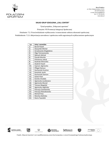 SKŁAD GRUP SZKOLENIA „CALL CENTER” Tytuł projektu: „Połączeni sportem” Priorytet: VII Promocja Integracji Społecznej Działanie: 7.2. Przeciwdziałanie wykluczeniu i wzmocnienie sektora ekonomii społecznej Poddziałanie: 7.2.1 Aktywizacja zawodowa i społeczna osób zagrożonych wykluczeniem społecznym l.p. 1) 2) 3) 4) 5) 6) 7) 8) 9) 10) 11) 12) 13) 14) 15) 16) 17) 18) 19) 20) 21) 22) 23) 24) 25) Imię i nazwisko Burak Paweł Daszyński Michał Grzybowska Magdalena Olga Tomaszewska Nidrych Michał Paszak Monika Piśmienny Jakub Rudniak Weronika Stadnik Paweł Szprync Agnieszka Pflegel Dariusz Kochaniak Krystian Kamiński Jacek Kochaniak Damian Goleń Piotr Kamila Chodała Agnieszka Juszkiewicz Agnieszka Musiał Tomasz Biegalski Agnieszka Jaglińska Patrycja Zawiślańska Patrycja Nowakowska Michał Fitas Monika Zielińska Daria Twardzik