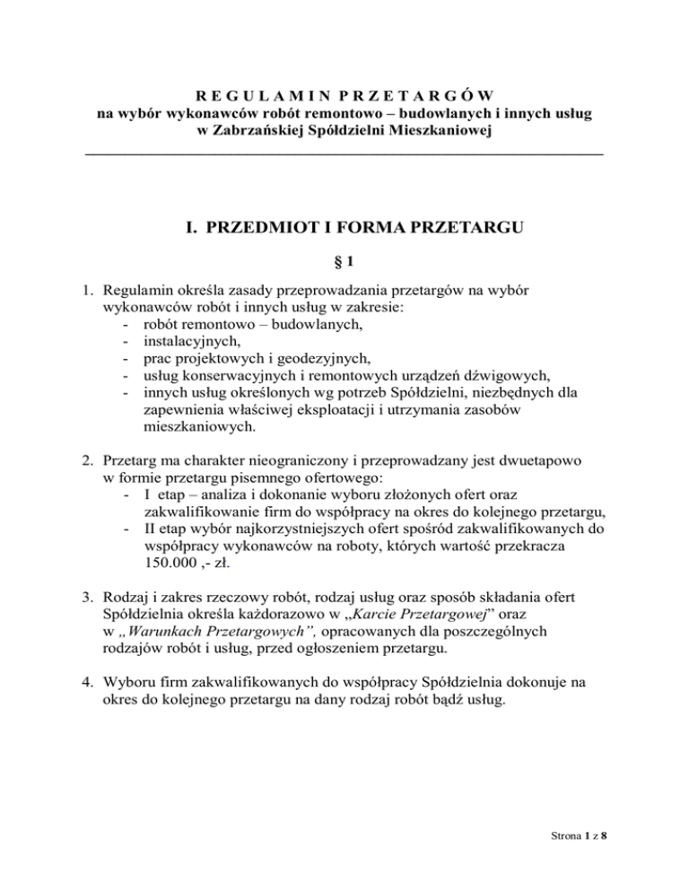 REGULAMIN PRZETARGÓW na wybór wykonawców robót remontowo – budowlanych i innych usług w Zabrzańskiej Spółdzielni Mieszkaniowej ________________________________________________________________ I. PRZEDMIOT I FORMA PRZETARGU §1 1. Regulamin określa zasady przeprowadzania przetargów na wybór wykonawców robót i innych usług w zakresie: - robót remontowo – budowlanych, - instalacyjnych, - prac projektowych i geodezyjnych, - usług konserwacyjnych i remontowych urządzeń dźwigowych, - innych usług określonych wg potrzeb Spółdzielni, niezbędnych dla zapewnienia właściwej eksploatacji i utrzymania zasobów mieszkaniowych. 2. Przetarg ma charakter nieograniczony i przeprowadzany jest dwuetapowo w formie przetargu pisemnego ofertowego: - I etap – analiza i dokonanie wyboru złożonych ofert oraz zakwalifikowanie firm do współpracy na okres do kolejnego przetargu, - II etap wybór najkorzystniejszych ofert spośród zakwalifikowanych do współpracy wykonawców na roboty, których wartość przekracza 150.000 ,- zł. 3. Rodzaj i zakres rzeczowy robót, rodzaj usług oraz sposób składania ofert Spółdzielnia określa każdorazowo w „Karcie Przetargowej” oraz w „Warunkach Przetargowych”, opracowanych dla poszczególnych rodzajów robót i usług, przed ogłoszeniem przetargu. 4. Wyboru firm zakwalifikowanych do współpracy Spółdzielnia dokonuje na okres do kolejnego przetargu na dany rodzaj robót bądź usług. Strona 1 z 8 II. ZASADY DOPUSZCZENIA DO UDZIAŁU W PRZETARGU §2 1. W przetargu mogą brać udział wyłącznie wykonawcy i usługodawcy, mający siedzibę na terenie Rzeczpospolitej Polskiej. 2. Do przetargu nie mogą przystępować: 1) członkowie Rady Nadzorczej i Zarządu Spółdzielni oraz Komisji Przetargowej, 2) pracownicy Spółdzielni, 3) krewni w linii prostej osób wymienionych w punktach 1) i 2), 4) wykonawcy i usługodawcy, którzy w ciągu ostatnich 3 lat przed kolejnym przetargiem wyrządzili Spółdzielni szkodę nie wykonując zleconych zadań lub wykonali je z nienależytą starannością, 5) przedsiębiorcy, wobec których toczy się postępowanie upadłościowe lub układowe bądź będący w stanie likwidacji, 6) przedsiębiorcy, którzy zalegają z uiszczeniem podatków wobec właściwego Urzędu Skarbowego oraz składek na ubezpieczenia społeczne i zdrowotne wobec ZUS, 7) podmioty nie wywiązujące się z zobowiązań wobec Spółdzielni. 3. Wykonawcy i usługodawcy zamierzający wziąć udział w przetargu winni zgłosić swoje uczestnictwo w przetargu, zgodnie z warunkami określonymi w ogłoszeniu o przetargu i nabyć Kartę przetargową oraz Warunki Przetargu, za opłatą ustaloną przez Zarząd Spółdzielni. 4. Do przetargu dopuszczeni są wykonawcy i usługodawcy, których oferty są kompletne i zostały złożone w trybie określonym w Regulaminie przetargu na wybór wykonawców robót remontowo – budowlanych i innych usług w Zabrzańskiej Spółdzielni Mieszkaniowej oraz spełniają warunki zawarte w Karcie Przetargowej. III. OGŁOSZENIE PRZETARGU §3 1. Termin ukazania się i treść ogłoszenia przetargu zatwierdza Zarząd Spółdzielni. Strona 2 z 8 2. Ogłoszenie przetargu Spółdzielnia zamieszcza w prasie, w takim terminie aby pomiędzy datą ukazania się ogłoszenia, a oznaczonym terminem do którego należało składać oferty, upłynęło co najmniej 14 dni. 3. W dniu ukazania się ogłoszenia w prasie, jego treść zamieszcza się także na tablicy ogłoszeń w siedzibie Spółdzielni oraz we wszystkich Administracjach Domów Spółdzielczych. 4. Ogłoszenie przetargu zawiera co najmniej: - nazwę i siedzibę zamawiającego, telefon, fax, - formę przetargu, - rodzaj robót i usług objętych przetargiem, - miejsce zapoznania się z treścią Regulaminu przetargu na wybór wykonawców robót remontowo – budowlanych i innych usług w Zabrzańskiej Spółdzielni Mieszkaniowej, - określenie sposobu uzyskania Karty Przetargowej i Warunków Przetargowych, - termin i miejsce składania ofert, - termin wyboru ofert, - sposób powiadomienia o wyborze oferty. IV. KOMISJA PRZETARGOWA §4 1. Przewodniczącego Komisji Przetargowej oraz jego Zastępcę powołuje Zarząd Spółdzielni. 2. Przewodniczący Komisji Przetargowej lub jego Zastępca przedstawia do zatwierdzenia Zarządowi Spółdzielni, członków wchodzących w skład Komisji Przetargowych. 3. Przewodniczący Komisji Przetargowej lub jego Zastępca każdorazowo wyznacza skład Komisji Przetargowej celem przeprowadzenia postępowania przetargowego w zakresie wyboru wykonawców i usługodawców na dany rodzaj robót i usług. 4. Komisja Przetargowa składa się z minimum 5 członków. 5. Komisja Przetargowa obraduje na posiedzeniach zwoływanych przez Przewodniczącego Komisji lub jego Zastępcę w terminach i miejscu zapewniającym sprawny przebieg prac. Strona 3 z 8 6. W ramach wykonywania funkcji nadzorczo – kontrolnej w przetargu uczestniczą w charakterze obserwatorów, bez prawa głosu, wytypowani przedstawiciele Rady Nadzorczej. 7. Przewodniczący Komisji Przetargowej na 7 dni przed rozpoczęciem przetargu, za pośrednictwem Działu Organizacyjno – Samorządowego, powiadamia pisemnie Radę Nadzorczą o dacie rozpoczęcia prac Komisji Przetargowej. IV. ZASADY WYBORU OFERT oraz PRZEBIEG PRAC KOMISJI PRZETARGOWEJ w I etapie przetargu – kwalifikacja firm do współpracy §5 1. Do zadań Komisji przetargowej w I– szym etapie należy: 1) szacunkowe ustalenie ilości wykonawców i dostawców usług w danej branży robót i usług, niezbędnej do realizacji zadań określonych w Planie Techniczno – Ekonomicznym, w zakresie utrzymania i właściwej eksploatacji zasobów mieszkaniowych Spółdzielni, 2) przeliczenie i porównanie ilości złożonych ofert z rejestrem ich wpływu do Spółdzielni, 3) dokonanie podziału i sporządzenie list złożonych ofert wg rodzaju robót lub usług będących przedmiotem przetargu, 4) otwarcie kopert z ofer