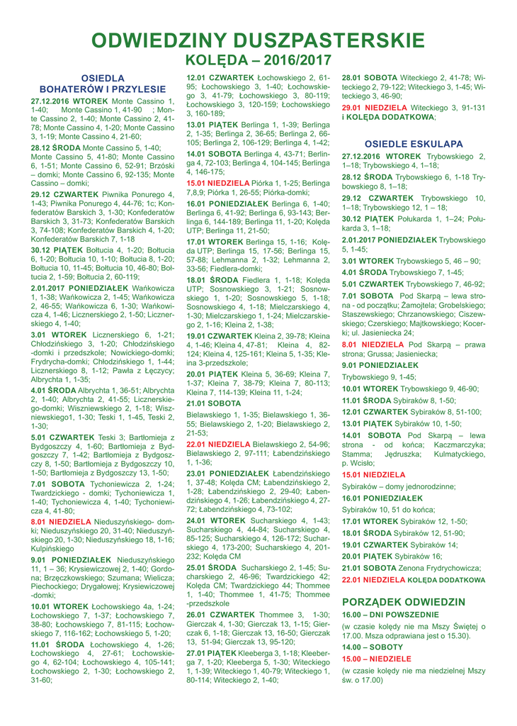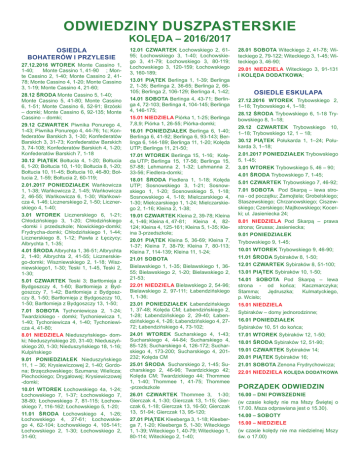 ODWIEDZINY DUSZPASTERSKIE KOLĘDA – 2016/2017 Osiedla Bohaterów i Przylesie 27.12.2016 wtorek Monte Cassino 1, 1-40; Monte Cassino 1, 41-90 ; Monte Cassino 2, 1-40; Monte Cassino 2, 4178; Monte Cassino 4, 1-20; Monte Cassino 3, 1-19; Monte Cassino 4, 21-60; 28.12 środa Monte Cassino 5, 1-40; Monte Cassino 5, 41-80; Monte Cassino 6, 1-51; Monte Cassino 6, 52-91; Brzóski – domki; Monte Cassino 6, 92-135; Monte Cassino – domki; 29.12 czwartek Piwnika Ponurego 4, 1-43; Piwnika Ponurego 4, 44-76; 1c; Konfederatów Barskich 3, 1-30; Konfederatów Barskich 3, 31-73; Konfederatów Barskich 3, 74-108; Konfederatów Barskich 4, 1-20; Konfederatów Barskich 7, 1-18 30.12 piątek Bołtucia 4, 1-20; Bołtucia 6, 1-20; Bołtucia 10, 1-10; Bołtucia 8, 1-20; Bołtucia 10, 11-45; Bołtucia 10, 46-80; Bołtucia 2, 1-59; Bołtucia 2, 60-119; 2.01.2017 poniedziałek Wańkowicza 1, 1-38; Wańkowicza 2, 1-45; Wańkowicza 2, 46-55; Wańkowicza 6, 1-30; Wańkowicza 4, 1-46; Licznerskiego 2, 1-50; Licznerskiego 4, 1-40; 3.01 wtorek Licznerskiego 6, 1-21; Chłodzińskiego 3, 1-20; Chłodzińskiego -domki i przedszkole; Nowickiego-domki; Frydrycha-domki; Chłodzińskiego 1, 1-44; Licznerskiego 8, 1-12; Pawła z Łęczycy; Albrychta 1, 1-35; 4.01 środa Albrychta 1, 36-51; Albrychta 2, 1-40; Albrychta 2, 41-55; Licznerskiego-domki; Wiszniewskiego 2, 1-18; Wiszniewskiego1, 1-30; Teski 1, 1-45, Teski 2, 1-30; 5.01 czwartek Teski 3; Bartłomieja z Bydgoszczy 4, 1-60; Bartłomieja z Bydgoszczy 7, 1-42; Bartłomieja z Bydgoszczy 8, 1-50; Bartłomieja z Bydgoszczy 10, 1-50; Bartłomieja z Bydgoszczy 13, 1-50; 7.01 sobota Tychoniewicza 2, 1-24; Twardzickiego - domki; Tychoniewicza 1, 1-40; Tychoniewicza 4, 1-40; Tychoniewicza 4, 41-80; 8.01 niedziela Nieduszyńskiego- domki; Nieduszyńskiego 20, 31-40; Nieduszyńskiego 20, 1-30; Nieduszyńskiego 18, 1-16; Kulpińskiego 9.01 poniedziałek Nieduszyńskiego 11, 1 – 36; Krysiewiczowej 2, 1-40; Gordona; Brzęczkowskiego; Szumana; Wielicza; Piechockiego; Drygałowej; Krysiewiczowej -domki; 10.01 wtorek Łochowskiego 4a, 1-24; Łochowskiego 7, 1-37; Łochowskiego 7, 38-80; Łochowskiego 7, 81-115; Łochowskiego 7, 116-162; Łochowskiego 5, 1-20; 11.01 środa Łochowskiego 4, 1-26; Łochowskiego 4, 27-61; Łochowskiego 4, 62-104; Łochowskiego 4, 105-141; Łochowskiego 2, 1-30; Łochowskiego 2, 31-60; 12.01 czwartek Łochowskiego 2, 6195; Łochowskiego 3, 1-40; Łochowskiego 3, 41-79; Łochowskiego 3, 80-119; Łochowskiego 3, 120-159; Łochowskiego 3, 160-189; 13.01 piątek Berlinga 1, 1-39; Berlinga 2, 1-35; Berlinga 2, 36-65; Berlinga 2, 66105; Berlinga 2, 106-129; Berlinga 4, 1-42; 14.01 sobota Berlinga 4, 43-71; Berlinga 4, 72-103; Berlinga 4, 104-145; Berlinga 4, 146-175; 15.01 niedziela Piórka 1, 1-25; Berlinga 7,8,9; Piórka 1, 26-55; Piórka-domki; 16.01 poniedziałek Berlinga 6, 1-40; Berlinga 6, 41-92; Berlinga 6, 93-143; Berlinga 6, 144-189; Berlinga 11, 1-20; Kolęda UTP; Berlinga 11, 21-50; 17.01 wtorek Berlinga 15, 1-16; Kolęda UTP; Berlinga 15, 17-56; Berlinga 15, 57-88; Lehmanna 2, 1-32; Lehmanna 2, 33-56; Fiedlera-domki; 18.01 środa Fiedlera 1, 1-18; Kolęda UTP; Sosnowskiego 3, 1-21; Sosnowskiego 1, 1-20; Sosnowskiego 5, 1-18; Sosnowskiego 4, 1-18; Mielczarskiego 4, 1-30; Mielczarskiego 1, 1-24; Mielczarskiego 2, 1-16; Kleina 2, 1-38; 19.01 czwartek Kleina 2, 39-78; Kleina 4, 1-46; Kleina 4, 47-81; Kleina 4, 82124; Kleina 4, 125-161; Kleina 5, 1-35; Kleina 3-przedszkole; 20.01 piątek Kleina 5, 36-69; Kleina 7, 1-37; Kleina 7, 38-79; Kleina 7, 80-113; Kleina 7, 114-139; Kleina 11, 1-24; 21.01 sobota Bielawskiego 1, 1-35; Bielawskiego 1, 3655; Bielawskiego 2, 1-20; Bielawskiego 2, 21-53; 22.01 niedziela Bielawskiego 2, 54-96; Bielawskiego 2, 97-111; Łabendzińskiego 1, 1-36; 23.01 poniedziałek Łabendzińskiego 1, 37-48; Kolęda CM; Łabendzińskiego 2, 1-28; Łabendzińskiego 2, 29-40; Łabendzińskiego 4, 1-26; Łabendzińskiego 4, 2772; Łabendzińskiego 4, 73-102; 24.01 wtorek Sucharskiego 4, 1-43; Sucharskiego 4, 44-84; Sucharskiego 4, 85-125; Sucharskiego 4, 126-172; Sucharskiego 4, 173-200; Sucharskiego 4, 201232; Kolęda CM 25.01 środa Sucharskiego 2, 1-45; Sucharskiego 2, 46-96; Twardzickiego 42; Kolęda CM; Twardzickiego 44; Thommee 1, 1-40; Thommee 1, 41-75; Thommee -przedszkole 26.01 czwartek Thommee 3, 1-30; Gierczak 4, 1-30; Gierczak 13, 1-15; Gierczak 6, 1-18; Gierczak 13, 16-50; Gierczak 13, 51-94; Gierczak 13, 95-120; 27.01 piątek Kleeberga 3, 1-18; Kleeberga 7, 1-20; Kleeberga 5, 1-30; Witeckiego 1, 1-39; Witeckiego 1, 40-79; Witeckiego 1, 80-114; Witeckiego 2, 1-40; 28.01 sobota Witeckiego 2, 41-78; Witeckiego 2, 79-122; Witeckiego 3, 1-45; Witeckiego 3, 46-90; 29.01 niedziela Witeckiego 3, 91-131 i kolęda dodatkowa; Osiedle ESKULAPa 27.12.2016 wtorek Trybowskiego 2, 1–18; Trybowskiego 4, 1–18; 28.12 środa Trybowskiego 6, 1-18 Trybowskiego 8, 1–18; 29.12 czwartek Trybowskiego 10, 1–18; Trybowskiego 12, 1 – 18; 30.12 piątek Połukarda 1, 1–24; Połukarda 3, 1–18; 2.01.2017 poniedziałek Trybowskiego 5, 1-45; 3.01 wtorek Trybowskiego 5, 46 – 90; 4.01 środa Trybowskiego 7, 1-45; 5.01 czwartek Trybowskiego 7, 46-92; 7.01 sobota Pod Skarpą – lewa strona - od początku; Żamojtela; Grobelskiego; Staszewskiego; Chrzanowskiego; Ciszewskiego; Czerskiego; Majtkowskiego; Kocerki; ul. Jasieniecka 24; 8.01 niedziela Pod Skarpą – prawa strona; Grussa; Jasieniecka; 9.01 poniedziałek Trybowskiego 9, 1-45; 10.01 wtorek Trybowskiego 9, 46-90; 11.01 środa Sybiraków 8, 1-50; 12.01 czwartek Sybiraków 8, 51-100; 13.01 piątek Sybiraków 10, 1-50; 14.01 sobota Pod Skarpą – lewa strona - od końca; Kaczmarczyka; Stamma; Jędruszka; Kulmatyckiego, p. Wcisło; 15.01 niedziela Sybiraków – domy jednorodzinne; 16.01 poniedziałek Sybiraków 10, 51 do końca; 17.01 wtorek Sybiraków 12, 1-50; 18.01 środa Sybiraków 12, 51-90; 19.01 czwartek Sybiraków 14; 20.01 piątek Sybiraków 16; 21.01 sobota Zenona Frydrychowicza;
