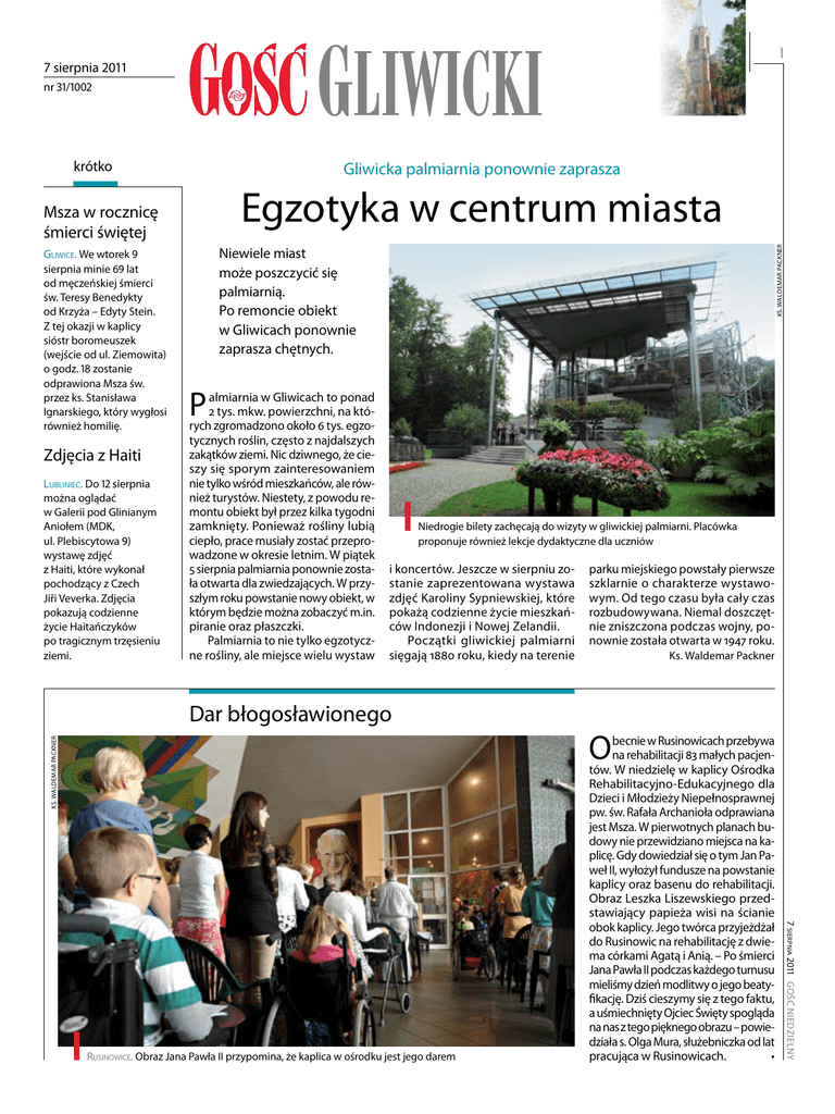 I 7 sierpnia 2011 nr 31/1002 krótko Gliwicka palmiarnia ponownie zaprasza Gliwice. We wtorek 9 sierpnia minie 69 lat od męczeńskiej śmierci św. Teresy Benedykty od Krzyża – Edyty Stein. Z tej okazji w kaplicy sióstr boromeuszek (wejście od ul. Ziemowita) o godz. 18 zostanie odprawiona Msza św. przez ks. Stanisława Ignarskiego, który wygłosi również homilię. Zdjęcia z Haiti Lubliniec. Do 12 sierpnia można oglądać w Galerii pod Glinianym Aniołem (MDK, ul. Plebiscytowa 9) wystawę zdjęć z Haiti, które wykonał pochodzący z Czech Jiři Veverka. Zdjęcia pokazują codzienne życie Haitańczyków po tragicznym trzęsieniu ziemi. Ks. Waldemar Packner Egzotyka w centrum miasta Msza w rocznicę śmierci świętej Niewiele miast może poszczycić się palmiarnią. Po remoncie obiekt w Gliwicach ponownie zaprasza chętnych. P almiarnia w Gliwicach to ponad 2 tys. mkw. powierzchni, na których zgromadzono około 6 tys. egzotycznych roślin, często z najdalszych zakątków ziemi. Nic dziwnego, że cieszy się sporym zainteresowaniem nie tylko wśród mieszkańców, ale również turystów. Niestety, z powodu remontu obiekt był przez kilka tygodni zamknięty. Ponieważ rośliny lubią ciepło, prace musiały zostać przeprowadzone w okresie letnim. W piątek 5 sierpnia palmiarnia ponownie została otwarta dla zwiedzających. W przyszłym roku powstanie nowy obiekt, w którym będzie można zobaczyć m.in. piranie oraz płaszczki. Palmiarnia to nie tylko egzotyczne rośliny, ale miejsce wielu wystaw Niedrogie bilety zachęcają do wizyty w gliwickiej palmiarni. Placówka proponuje również lekcje dydaktyczne dla uczniów i koncertów. Jeszcze w sierpniu zostanie zaprezentowana wystawa zdjęć Karoliny Sypniewskiej, które pokażą codzienne życie mieszkańców Indonezji i Nowej Zelandii. Początki gliwickiej palmiarni sięgają 1880 roku, kiedy na terenie Ks. Waldemar Packner Dar błogosławionego Ks. Waldemar Packner O becnie w Rusinowicach przebywa na rehabilitacji 83 małych pacjentów. W niedzielę w kaplicy Ośrodka Rehabilitacyjno-Edukacyjnego dla Dzieci i Młodzieży Niepełnosprawnej pw. św. Rafała Archanioła odprawiana jest Msza. W pierwotnych planach budowy nie przewidziano miejsca na kaplicę. Gdy dowiedział się o tym Jan Paweł II, wyłożył fundusze na powstanie kaplicy oraz basenu do rehabilitacji. Obraz Leszka Liszewskiego przedstawiający papieża wisi na ścianie obok kaplicy. Jego twórca przyjeżdżał do Rusinowic na rehabilitację z dwiema córkami Agatą i Anią. – Po śmierci Jana Pawła II podczas każdego turnusu mieliśmy dzień modlitwy o jego beatyfikację. Dziś cieszymy się z tego faktu, a uśmiechnięty Ojciec Święty spogląda na nas z tego pięknego obrazu – powiedziała s. Olga Mura, służebniczka od lat pracująca w Rusinowicach. • 7 sierpnia 2011 Gość Niedzielny Rusinowice. Obraz Jana Pawła II przypomina, że kaplica w ośrodku jest jego darem parku miejskiego powstały pierwsze szklarnie o charakterze wystawowym. Od tego czasu była cały czas rozbudowywana. Niemal doszczętnie zniszczona podczas wojny, ponownie została otwarta w 1947 roku. gość gliwicki gość gliwicki Kołocz pod ochroną G liwice. Urząd Miejski w Gliwicach został uhonorowany tytułem „Przyjaciel niewidomych”. Odznaczenie przyznał śląski okręg Polskiego Związku Niewidomych. – W liście gratulacyjnym przekazanym przedstawicielom UM Polski Związek Niewidomych dziękuje za zaangażowanie i trud niesienia pomocy społeczności Śląsk. Tradycyjny kołocz śląski będzie chroniony przez prawo Unii Europejskiej. Wypiek otrzymał unijny niebiesko-żółty znak z charakterystycznymi gwiazdkami. W Dzienniku Urzędowym UE (nr L195/32) opublikowano osób niewidomych i słabowidzących – informuje Lucyna Woźniak, naczelnik Wydziału Zdrowia i Spraw Społecznych UM. Dodaje, że samorząd Gliwic od lat współpracuje z PZN, udzielając dotacji na realizację zadań z dziedziny rehabilitacji społecznej osób niewidomych i słabowidzących. my fanów zabrzańskiego zespołu mogły podziwiać m.in. występy cheerleaderek z zespołu Energy, występ hip-hopowy grupy AMC, pokaz sztuk walki oraz pokaz freestylu piłkarskiego. Całość prowadził znany prezenter telewizyjny Bożydar Iwanow. Kopalnia fedruje, ściany pękają Bytom. Wydobycie węgla powoduje kolejne zniszczenia budynków znajdujących się na terenie Bytomia. Tym razem Powiatowy Inspektor Nadzoru Budowlanego wyłączył z użytkowania cztery mieszkania znajdujące się na parterze budynku przy ul. Pocztowej 11. Dla ewakuowanych lokatorów przygotowano miejsca w hostelu. Podobnie, jak w przypadku poprzednich ewakuacji – koszt zarówno pobytu, jak i remontu lokali pokryje kopalnia Bobrek--Centrum. Na wydobycie węgla Gliwicki magistrat od lat wspiera osoby niewidzące i słabowidzące Tłumacz języka migowego on-line internet. Połączenie następuje automatycznie z jednym z profesjonalnych tłumaczy, który dowiaduje się od osoby niesłyszącej, w jakiej sprawie przyszła. Po czym zawiadamia odpowiedniego pracownika wskazanego wcześniej do obsługi danej sprawy. Pracownik podchodzi do stanowiska, gdzie czeka osoba niesłysząca i przy wsparciu tłumacza on-line kompleksowo załatwia sprawę. Zabrzańskie koło Polskiego Związku Głuchych liczy około 300 osób. Gość Niedzielny 7 sierpnia 2011 Trwają zapisy do biegu, który zostanie rozegrany w niedzielę 18 września w Bytomiu. A jest o co powalczyć. G liwice. W gliwickim Centrum Onkologii będą przeszczepiać szpik od obcych dawców. W ciągu kilkunastu miesięcy, od momentu uruchomienia w Gliwicach programu transplantacji, metodę autoprzeszczepu (własnego szpiku) zastosowano już u 108 pacjentów. – W ostatnim czasie wykonujemy kilkanaście przeszczepów w miesiącu. To stawia nas wśród najbardziej aktywnych w tej dziedzinie ośrodków w Europie – mówi doc. Sebastian Giebel, ordynator oddziału transplantacji w g
