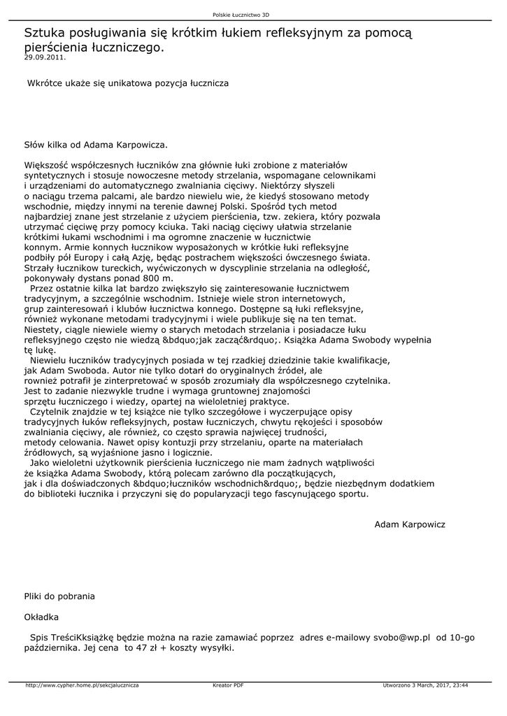 Polskie Łucznictwo 3D Sztuka posługiwania się krótkim łukiem refleksyjnym za pomocą pierścienia łuczniczego. 29.09.2011. Wkrótce ukaże się unikatowa pozycja łucznicza Słów kilka od Adama Karpowicza. Większość współczesnych łuczników zna głównie łuki zrobione z materiałów syntetycznych i stosuje nowoczesne metody strzelania, wspomagane celownikami i urządzeniami do automatycznego zwalniania cięciwy. Niektórzy słyszeli o naciągu trzema palcami, ale bardzo niewielu wie, że kiedyś stosowano metody wschodnie, między innymi na terenie dawnej Polski. Spośród tych metod najbardziej znane jest strzelanie z użyciem pierścienia, tzw. zekiera, który pozwala utrzymać cięciwę przy pomocy kciuka. Taki naciąg cięciwy ułatwia strzelanie krótkimi łukami wschodnimi i ma ogromne znaczenie w łucznictwie konnym. Armie konnych łucznikow wyposażonych w krótkie łuki refleksyjne podbiły pół Europy i całą Azję, będąc postrachem większości ówczesnego świata. Strzały łucznikow tureckich, wyćwiczonych w dyscyplinie strzelania na odległość, pokonywały dystans ponad 800 m. Przez ostatnie kilka lat bardzo zwiększyło się zainteresowanie łucznictwem tradycyjnym, a szczególnie wschodnim. Istnieje wiele stron internetowych, grup zainteresowań i klubów łucznictwa konnego. Dostępne są łuki refleksyjne, również wykonane metodami tradycyjnymi i wiele publikuje się na ten temat. Niestety, ciągle niewiele wiemy o starych metodach strzelania i posiadacze łuku refleksyjnego często nie wiedzą „jak zacząć”. Książka Adama Swobody wypełnia tę lukę. Niewielu łuczników tradycyjnych posiada w tej rzadkiej dziedzinie takie kwalifikacje, jak Adam Swoboda. Autor nie tylko dotarł do oryginalnych źródeł, ale rownież potrafił je zinterpretować w sposób zrozumiały dla współczesnego czytelnika. Jest to zadanie niezwykle trudne i wymaga gruntownej znajomości sprzętu łuczniczego i wiedzy, opartej na wieloletniej praktyce. Czytelnik znajdzie w tej książce nie tylko szczegółowe i wyczerpujące opisy tradycyjnych łuków refleksyjnych, postaw łuczniczych, chwytu rękojeści i sposobów zwalniania cięciwy, ale również, co często sprawia najwięcej trudności, metody celowania. Nawet opisy kontuzji przy strzelaniu, oparte na materiałach źródłowych, są wyjaśnione jasno i logicznie. Jako wieloletni użytkownik pierścienia łuczniczego nie mam żadnych wątpliwości że książka Adama Swobody, którą polecam zarówno dla początkujących, jak i dla doświadczonych „łuczników wschodnich”, będzie niezbędnym dodatkiem do biblioteki łucznika i przyczyni się do popularyzacji tego fascynującego sportu. Adam Karpowicz Pliki do pobrania Okładka Spis TreściKksiążkę będzie można na razie zamawiać poprzez adres e-mailowy [email protected] od 10-go października. Jej cena to 47 zł + koszty wysyłki. http://www.cypher.home.pl/sekcjalucznicza Kreator PDF Utworzono 3 March, 2017, 23:44 Polskie Łucznictwo 3D http://www.cypher.home.pl/sekcjalucznicza Kreator PDF Utworzono 3 March, 2017, 23:44
