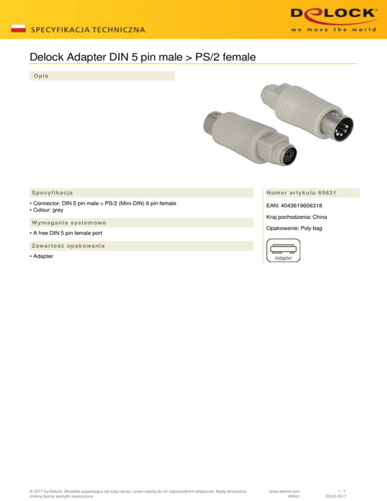 Delock Adapter DIN 5 pin male > PS/2 female Opis Specyfikacja • Connector: DIN 5 pin male > PS/2 (Mini-DIN) 6 pin female • Colour: grey Wymagania systemowe • A free DIN 5 pin female port Numer artykułu 65631 EAN: 4043619656318 Kraj pochodzenia: China Opakowanie: Poly bag Zawartość opakowania • Adapter © 2017 by Delock. Wszelkie pojawiające się tutaj nazwy i znaki należą do ich odpowiednich właścicieli. Błędy drukarskie, zmiany & pomyłki zastrzeżone. Powered by TCPDF (www.tcpdf.org) www.delock.com 65631 1/1 03.03.2017