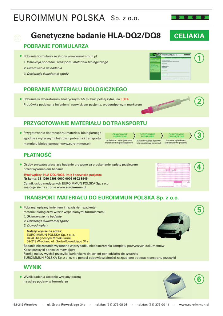 Genetyczne badanie HLA-DQ2/DQ8 CELIAKIA POBRANIE FORMULARZA Pobranie formularzy ze strony www.euroimmun.pl: 1. Instrukcja pobrania i transportu materiału biologicznego 2. Skierowanie na badania 3. Deklaracja świadomej zgody POBRANIE MATERIAŁU BIOLOGICZNEGO Pobranie w laboratorium analitycznym 2-5 ml krwi pełnej żylnej na EDTA Probówka podpisana imieniem i nazwiskiem pacjenta, wodoodpornym markerem PRZYGOTOWANIE MATERIAŁU DO TRANSPORTU Przygotowanie do transportu materiału biologicznego zgodnie z wytycznymi Instrukcji pobrania i transportu materiału biologicznego (www.euroimmun.pl) OPAKOWANIE PIERWOTNE probówka - zabezpieczona materiałem higroskopijnym OPAKOWANIE POŚREDNIE szczelny worek foliowy lub plastikowy pojemnik OPAKOWANIE ZEWNĘTRZNE koperta bąbelkowa lub tekturowe pudełko PŁATNOŚĆ Osoby prywatne zlecające badanie proszone są o dokonanie wpłaty przelewem przed wykonaniem badania Tytuł wpłaty: HLA-DQ2/DQ8, imię i nazwisko pacjenta Nr konta: 38 1090 2398 0000 0006 0802 8945 Cennik usług medycznych EUROIMMUN POLSKA Sp. z o.o. znajduje się na stronie www.euroimmun.pl TRANSPORT MATERIAŁU DO EUROIMMUN POLSKA Sp. z o.o. Pobrany, opisany imieniem i nazwiskiem pacjenta, materiał biologiczny wraz z wypełnionymi formularzami: 1. Skierowanie na badanie 2. Deklaracja świadomej zgody 3. Dowód wpłaty Należy wysłać na adres: EUROIMMUN POLSKA Sp. z o. o. Dział Diagnostyki Molekularnej 52-219 Wrocław, ul. Grota-Roweckiego 34a Badanie nie zostanie wykonane w przypadku niedostarczenia kompletu powyższych dokumentów Koszt przesyłki ponosi zamawiający Paczkę należy wysłać przesyłką kurierską w dniach od poniedziałku do czwartku EUROIMMUN POLSKA Sp. z o. o. nie ponosi odpowiedzialności za zgubione podczas transportu przesyłki WYNIK Wynik badania zostanie wysłany pocztą na adres podany w formularzu Celiakia Celiakia (choroba trzewna) to schorzenie genetyczne, polegające na nietolerancji glutenu zawartego w zbożach. Na skutek reakcji immunologicznej dochodzi do zaniku kosmków jelita cienkiego, czego skutkiem są zaburzenia wchłaniania jelitowego. Wówczas do krwioobiegu nie dostają się substancje odżywcze, co pociąga za sobą wiele konsekwencji spowodowanych niedożywieniem organizmu. Wiadomo, że geny HLA-DQ2 i HLA-DQ8, zlokalizowane na chromosomie 6p21, są silnie powiązane z chorobą trzewną. 90-95% pacjentów chorych na celiakię posiada gen HLA-DQ2, pozostali pacjenci mają gen HLA-DQ8 (5-10%). Oba geny mogą występować również u zdrowych osób w ok. 20-30% przypadków. Uważa się, że HLA-DQ2 i/lub HLA-DQ8 jest niezbędny, ale niewystarczający do rozwoju choroby. Objawy Objawy choroby trzewnej są bardzo różnorodne. Do objawów typowych zalicza się problemy żołądkowo-jelitowe, tj. biegunka, niska waga i wzrost, osłabienie, wzdęcia, bóle brzucha. Formy nietypowe to anemia, osteoporoza, niedobór witamin i soli mineralnych, zespół jelita drażliwego, wyższa niż w ogólnej populacji skłonność do zapadania na nowotwory jelita, niepłodność lub skłonność do poronień. Aż u 20% kobiet przyczyną tego rodzaju problemów jest choroba trzewna! Celiakia potencjalna zazwyczaj jest diagnozowana u osób z grupy ryzyka, czyli krewnych, cukrzyków, osób z zespołem Downa lub chorobą Dühringa. Rozpoznanie Ocena histologiczna (biopsja jelita) może być pominięta przy spełnieniu poniższych warunków: PODEJRZENIE CELIAKII (objawy, grupa ryzyka) występowanie objawów związanych z celiakią HLA-DQ2/DQ8 WYNIK UJEMNY bardzo niskie prawdopodobieństwo celiakii (poniżej 1%) WYNIK DODATNI celiakia wysoko prawdopodobna (sugerowana dalsza diagnostyka serologiczna i histopatologiczna) wysoki poziom przeciwciał przeciw transglutaminazie tkankowej (anty-tTG) w klasie IgA: >10 x powyżej górnej granicy normy, potwierdzony pozytywnym wynikiem EMA (przeciwciała przeciw endomysium) HLA-DQ2 i/lub HLA-DQ8 pozytywny Test EUROArray HLA-DQ2/DQ8 Test genetyczny do diagnostyki celiakii ma wysoką wartość negatywnie predykcyjną tzn. wynik ujemny w 99% wyklucza chorobę, natomiast wynik dodatni wskazuje na chorobę lub predyspozycję do zachorowania. Jednakże znaczenie kliniczne posiada jedynie wykrycie kompletnej cząsteczki antygenu, to znaczy występowanie podjednostki α i β antygenu DQ2/DQ8. Na poziomie genetycznym oznacza to jednoczesne zidentyfikowanie obu alleli kodujących podjednostki α i β. Tak precyzyjna detekcja nie była dotychczas możliwa w tradycyjnych testach genetycznych - zdarzały się fałszywie pozytywne wyniki z powodu obecności tylko jednej składowej antygenu. Dopiero test EUROArray HLA-DQ2/DQ8, oparty na technice mikromacierzy, umożliwił szczegółową analizę kilku różnych alleli kodujących podjednostki DQ2/DQ8 w jednym badaniu. Test EUROArray HLA-DQ2/DQ8 wykrywa poszczególne allele kodujące obie podjednostki (α i β) antygenów DQ2 i DQ8. Dzięki temu możliwe jest odróżnienie pacjentów z kompletnym antygenem od osób posiadających tylko jedną podjednostkę (bez znaczenia klinicznego). Interpretacja wyniku genetycznego badania HLA-DQ2/DQ8 GEN DQ2 DQ8 DQ2 i DQ8 WYNIK INTERPRETACJA Pozytywny Choroba prawdopodobna Negatywny Przy negatywnym wyniku również dla DQ8, brak predyspozycji do zachorowania Pozytywny Choroba prawdopodobna Negatywny Przy negatywnym wyniku również dla DQ2, brak predyspozycji do zachorowania Pozytywny Choroba prawdopodobna Negatywny Brak predyspozycji do zachorowania Informacje o badaniach EUROArray HLA-DQ2/DQ8 dr n. med. Dorota Musiał; e-mail: [email protected]; tel.: 71/373 08 08 wew.115; www.euroimmun.pl → „Dla pacjenta“