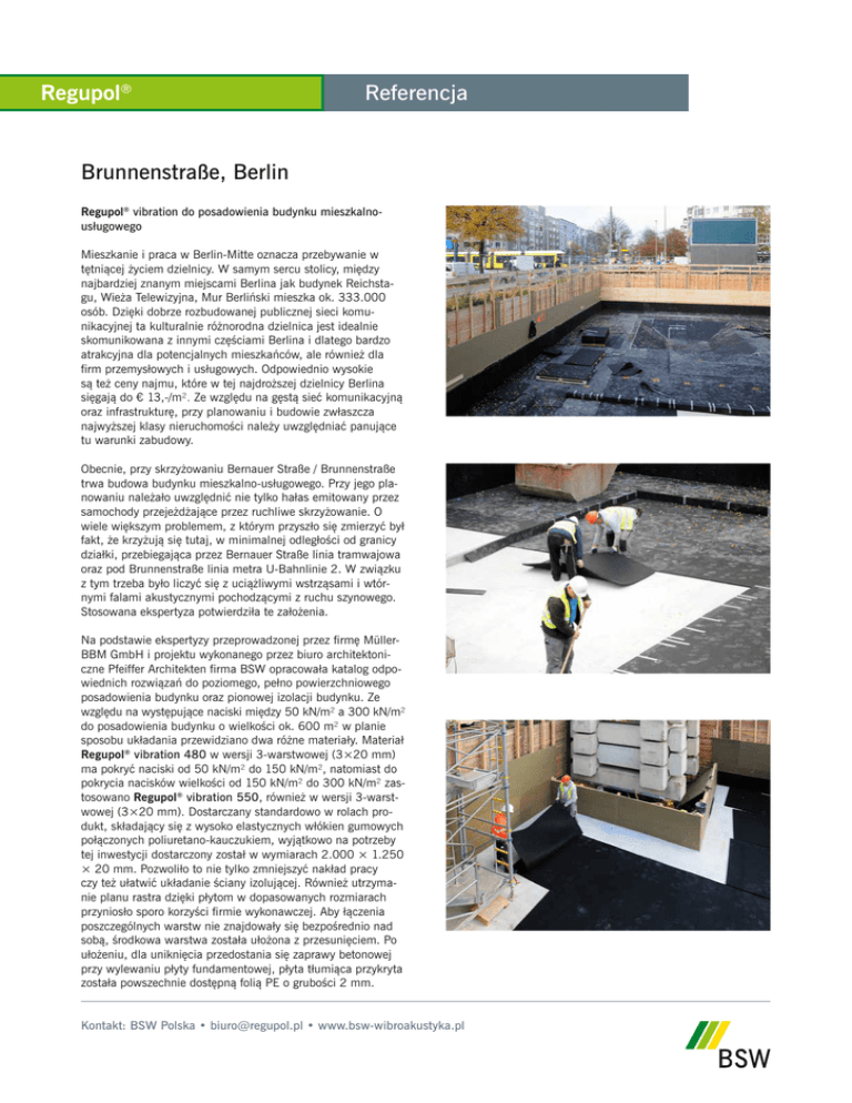 Regupol® Referencja Brunnenstraße, Berlin Regupol® vibration do posadowienia budynku mieszkalnousługowego Mieszkanie i praca w Berlin-Mitte oznacza przebywanie w tętniącej życiem dzielnicy. W samym sercu stolicy, między najbardziej znanym miejscami Berlina jak budynek Reichstagu, Wieża Telewizyjna, Mur Berliński mieszka ok. 333.000 osób. Dzięki dobrze rozbudowanej publicznej sieci komunikacyjnej ta kulturalnie różnorodna dzielnica jest idealnie skomunikowana z innymi częściami Berlina i dlatego bardzo atrakcyjna dla potencjalnych mieszkańców, ale również dla firm przemysłowych i usługowych. Odpowiednio wysokie są też ceny najmu, które w tej najdroższej dzielnicy Berlina sięgają do € 13,-/m². Ze względu na gęstą sieć komunikacyjną oraz infrastrukturę, przy planowaniu i budowie zwłaszcza najwyższej klasy nieruchomości należy uwzględniać panujące tu warunki zabudowy. Obecnie, przy skrzyżowaniu Bernauer Straße / Brunnenstraße trwa budowa budynku mieszkalno-usługowego. Przy jego planowaniu należało uwzględnić nie tylko hałas emitowany przez samochody przejeżdżające przez ruchliwe skrzyżowanie. O wiele większym problemem, z którym przyszło się zmierzyć był fakt, że krzyżują się tutaj, w minimalnej odległości od granicy działki, przebiegająca przez Bernauer Straße linia tramwajowa oraz pod Brunnenstraße linia metra U-Bahnlinie 2. W związku z tym trzeba było liczyć się z uciążliwymi wstrząsami i wtórnymi falami akustycznymi pochodzącymi z ruchu szynowego. Stosowana ekspertyza potwierdziła te założenia. Na podstawie ekspertyzy przeprowadzonej przez firmę MüllerBBM GmbH i projektu wykonanego przez biuro architektoniczne Pfeiffer Architekten firma BSW opracowała katalog odpowiednich rozwiązań do poziomego, pełno powierzchniowego posadowienia budynku oraz pionowej izolacji budynku. Ze względu na występujące naciski między 50 kN/m² a 300 kN/m² do posadowienia budynku o wielkości ok. 600 m² w planie sposobu układania przewidziano dwa różne materiały. Materiał Regupol® vibration 480 w wersji 3-warstwowej (3×20 mm) ma pokryć naciski od 50 kN/m² do 150 kN/m², natomiast do pokrycia nacisków wielkości od 150 kN/m² do 300 kN/m² zastosowano Regupol® vibration 550, również w wersji 3-warstwowej (3×20 mm). Dostarczany standardowo w rolach produkt, składający się z wysoko elastycznych włókien gumowych połączonych poliuretano-kauczukiem, wyjątkowo na potrzeby tej inwestycji dostarczony został w wymiarach 2.000 × 1.250 × 20 mm. Pozwoliło to nie tylko zmniejszyć nakład pracy czy też ułatwić układanie ściany izolującej. Również utrzymanie planu rastra dzięki płytom w dopasowanych rozmiarach przyniosło sporo korzyści firmie wykonawczej. Aby łączenia poszczególnych warstw nie znajdowały się bezpośrednio nad sobą, środkowa warstwa została ułożona z przesunięciem. Po ułożeniu, dla uniknięcia przedostania się zaprawy betonowej przy wylewaniu płyty fundamentowej, płyta tłumiąca przykryta została powszechnie dostępną folią PE o grubości 2 mm. Kontakt: BSW Polska • [email protected] • www.bsw-wibroakustyka.pl Regupol® Referencja Do pionowej izolacji budynku zalecono użycie Regupol® vibration 450. Materiał dostarczany standardowo w płytach o grubości 50 lub 25 mm (1.000 × 500 mm) zamocowany został na ścianach bocznych/piwnicznych za pomocą poliuretanowego kleju kontaktowego. Również w tym przypadku, przed wypełnieniem płyty przykryte zostały folią PE w celach ochronnych. Informacje w skrócie Obiekt: budowa budynku mieszkalno-usługowego, Berlin-Mitte Inwestor: Brunnen 49 GmbH, Berlin Architekci: Pfeiffer Architekten, Berlin Firma wykonawcza: HDAG Projekt GmbH, Berlin Kontakt: BSW Polska • [email protected] • www.bsw-wibroakustyka.pl Online Version March 2015 Produkty BSW Regupol® vibration 450, 480, 550