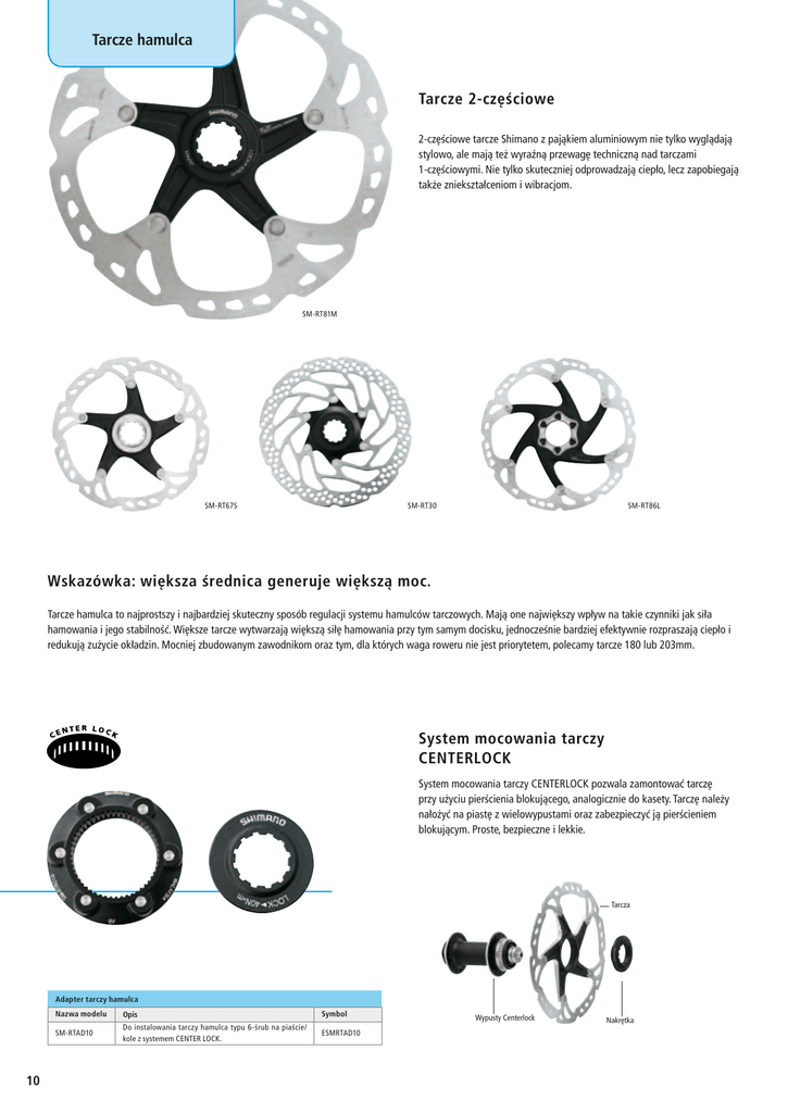 Tarcze hamulca Tarcze 2-częściowe 2-częściowe tarcze Shimano z pająkiem aluminiowym nie tylko wyglądają stylowo, ale mają też wyraźną przewagę techniczną nad tarczami 1-częściowymi. Nie tylko skuteczniej odprowadzają ciepło, lecz zapobiegają także zniekształceniom i wibracjom. SM-RT81M SM-RT67S SM-RT30 SM-RT86L Wskazówka: większa średnica generuje większą moc. Tarcze hamulca to najprostszy i najbardziej skuteczny sposób regulacji systemu hamulców tarczowych. Mają one największy wpływ na takie czynniki jak siła hamowania i jego stabilność. Większe tarcze wytwarzają większą siłę hamowania przy tym samym docisku, jednocześnie bardziej efektywnie rozpraszają ciepło i redukują zużycie okładzin. Mocniej zbudowanym zawodnikom oraz tym, dla których waga roweru nie jest priorytetem, polecamy tarcze 180 lub 203mm. System mocowania tarczy CENTERLOCK System mocowania tarczy CENTERLOCK pozwala zamontować tarczę przy użyciu pierścienia blokującego, analogicznie do kasety. Tarczę należy nałożyć na piastę z wielowypustami oraz zabezpieczyć ją pierścieniem blokującym. Proste, bezpieczne i lekkie. Tarcza Adapter tarczy hamulca 10 Nazwa modelu Opis Symbol SM-RTAD10 Do instalowania tarczy hamulca typu 6-śrub na piaście/ kole z systemem CENTER LOCK. ESMRTAD10 Wypusty Centerlock Nakrętka Tarcze “Ice-Tech”, podobnie jak okładziny “Ice-Tech” znacząco zmniejszają kumulację ciepła w systemie. To z kolei redukuje efekt spadku mocy hamowania, zapewniając stałą siłę hamowania, nawet na długich odcinkach zjazdów. Dodatkowe zalety to dłuższa żywotność okładzin i cichsza praca. Aluminium Nierdzewna stal Stal nierdzewna Stal nierdzewna Rdzeń aluminiowy Tarcza hamulca Mocowanie Grupa Wielkość tarczy Konstrukcja 2-częściowa Nakrętka Stop aluminium Tarcza Stal Ice Tech Kompatybilne okładziny Stal Metaliczna Żywiczna 203 mm X X X X X 180 mm X X X X X XTR Nazwa modelu Symbol ISMRT98L ISMRT98M SM-RT98 160 mm X X X X X ISMRT98S 140 mm X X X X X ISMRT98SS 203 mm X X X X X 180 mm X X X X X ISMRT81L 160 mm X X X X X ISMRT81S 203 mm X X X X ISMRT79L SM-RT81 ISMRT81M SAINT / XT CENTER LOCK SLX DEORE X 180 mm X X X X X 160 mm X X X X X SM-RT79 ISMRT79 203 mm X X X X X ISMRT67L 180 mm X X X X X 160 mm X X X X X 203 mm X X X X X 180 mm X X X X X X SM-RT67 ISMRT79M ISMRT67M ISMRT67S ISMRT64L SM-RT64 ISMRT64M 160 mm X X X X ISMRT64 203 mm X X X X ESMRT53L 180 mm X X X X 160 mm X X X X 160 mm X X 203 mm X X X X 180 mm X X X X X SM-RT53 ESMRT53M Pozagrupowe SAINT / XT 6-śrub XT X X ESMRT53 SM-RT30 ESMRT30S ISMRT86L SM-RT86 ISMRT86M 160 mm X X X ISMRT86S 203 mm X X X X ISMRT76L 180 mm X X X X 160 mm X X X X 160 mm X X 180 mm X X Pozagrupowe SM-RT76 ISMRT76M ISMRT76 ESMRT51 SM-RT51 ESMRT51M 11