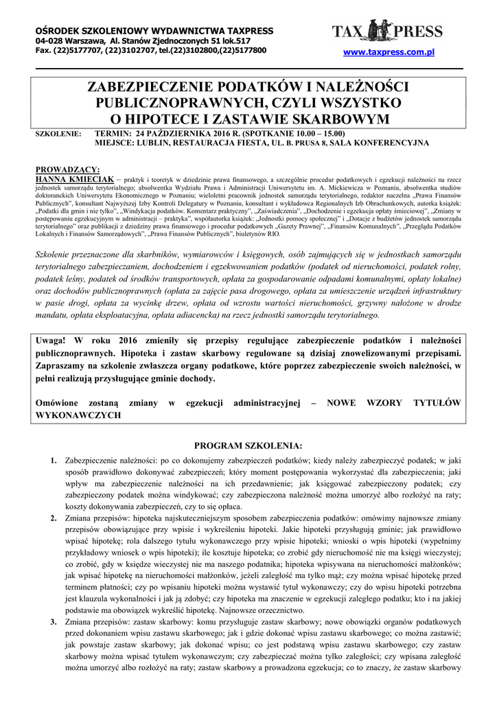 OŚRODEK SZKOLENIOWY WYDAWNICTWA TAXPRESS 04-028 Warszawa, Al. Stanów Zjednoczonych 51 lok.517 Fax. (22)5177707, (22)3102707, tel.(22)3102800,(22)5177800 SZKOLENIE: www.taxpress.com.pl ZABEZPIECZENIE PODATKÓW I NALEŻNOŚCI PUBLICZNOPRAWNYCH, CZYLI WSZYSTKO O HIPOTECE I ZASTAWIE SKARBOWYM TERMIN: 24 PAŹDZIERNIKA 2016 R. (SPOTKANIE 10.00 – 15.00) MIEJSCE: LUBLIN, RESTAURACJA FIESTA, UL. B. PRUSA 8, SALA KONFERENCYJNA PROWADZĄCY: HANNA KMIECIAK – praktyk i teoretyk w dziedzinie prawa finansowego, a szczególnie procedur podatkowych i egzekucji należności na rzecz jednostek samorządu terytorialnego; absolwentka Wydziału Prawa i Administracji Uniwersytetu im. A. Mickiewicza w Poznaniu, absolwentka studiów doktoranckich Uniwersytetu Ekonomicznego w Poznaniu; wieloletni pracownik jednostek samorządu terytorialnego, redaktor naczelna „Prawa Finansów Publicznych”, konsultant Najwyższej Izby Kontroli Delegatury w Poznaniu, konsultant i wykładowca Regionalnych Izb Obrachunkowych, autorka książek: „Podatki dla gmin i nie tylko”, „Windykacja podatków. Komentarz praktyczny”, „Zaświadczenia”, „Dochodzenie i egzekucja opłaty śmieciowej”, „Zmiany w postępowaniu egzekucyjnym w administracji – praktyka”, współautorka książek: „Jednostki pomocy społecznej” i „Dotacje z budżetów jednostek samorządu terytorialnego” oraz publikacji z dziedziny prawa finansowego i procedur podatkowych „Gazety Prawnej”, „Finansów Komunalnych”, „Przeglądu Podatków Lokalnych i Finansów Samorządowych”, „Prawa Finansów Publicznych”, biuletynów RIO. Szkolenie przeznaczone dla skarbników, wymiarowców i księgowych, osób zajmujących się w jednostkach samorządu terytorialnego zabezpieczaniem, dochodzeniem i egzekwowaniem podatków (podatek od nieruchomości, podatek rolny, podatek leśny, podatek od środków transportowych, opłata za gospodarowanie odpadami komunalnymi, opłaty lokalne) oraz dochodów publicznoprawnych (opłata za zajęcie pasa drogowego, opłata za umieszczenie urządzeń infrastruktury w pasie drogi, opłata za wycinkę drzew, opłata od wzrostu wartości nieruchomości, grzywny nałożone w drodze mandatu, opłata eksploatacyjna, opłata adiacencka) na rzecz jednostki samorządu terytorialnego. Uwaga! W roku 2016 zmieniły się przepisy regulujące zabezpieczenie podatków i należności publicznoprawnych. Hipoteka i zastaw skarbowy regulowane są dzisiaj znowelizowanymi przepisami. Zapraszamy na szkolenie zwłaszcza organy podatkowe, które poprzez zabezpieczenie swoich należności, w pełni realizują przysługujące gminie dochody. Omówione zostaną zmiany WYKONAWCZYCH w egzekucji administracyjnej PROGRAM SZKOLENIA: – NOWE WZORY TYTUŁÓW 1. Zabezpieczenie należności: po co dokonujemy zabezpieczeń podatków; kiedy należy zabezpieczyć podatek; w jaki sposób prawidłowo dokonywać zabezpieczeń; który moment postępowania wykorzystać dla zabezpieczenia; jaki wpływ ma zabezpieczenie należności na ich przedawnienie; jak księgować zabezpieczony podatek; czy zabezpieczony podatek można windykować; czy zabezpieczona należność można umorzyć albo rozłożyć na raty; koszty dokonywania zabezpieczeń, czy to się opłaca. 2. Zmiana przepisów: hipoteka najskuteczniejszym sposobem zabezpieczenia podatków: omówimy najnowsze zmiany przepisów obowiązujące przy wpisie i wykreśleniu hipoteki. Jakie hipoteki przysługują gminie; jak prawidłowo wpisać hipotekę; rola dalszego tytułu wykonawczego przy wpisie hipoteki; wnioski o wpis hipoteki (wypełnimy przykładowy wniosek o wpis hipoteki); ile kosztuje hipoteka; co zrobić gdy nieruchomość nie ma księgi wieczystej; co zrobić, gdy w księdze wieczystej nie ma naszego podatnika; hipoteka wpisywana na nieruchomości małżonków; jak wpisać hipotekę na nieruchomości małżonków, jeżeli zaległość ma tylko mąż; czy można wpisać hipotekę przed terminem płatności; czy po wpisaniu hipoteki można wystawić tytuł wykonawczy; czy do wpisu hipoteki potrzebna jest klauzula wykonalności i jak ją zdobyć; czy hipoteka ma znaczenie w egzekucji zaległego podatku; kto i na jakiej podstawie ma obowiązek wykreślić hipotekę. Najnowsze orzecznictwo. 3. Zmiana przepisów: zastaw skarbowy: komu przysługuje zastaw skarbowy; nowe obowiązki organów podatkowych przed dokonaniem wpisu zastawu skarbowego; jak i gdzie dokonać wpisu zastawu skarbowego; co można zastawić; jak powstaje zastaw skarbowy; jak dokonać wpisu; co jest podstawą wpisu zastawu skarbowego; czy zastaw skarbowy można wpisać tytułem wykonawczym; czy zabezpieczać można tylko zaległości; czy wpisana zaległość można umorzyć albo rozłożyć na raty; zastaw skarbowy a prowadzona egzekucja; co to znaczy, że zastaw skarbowy OŚRODEK SZKOLENIOWY WYDAWNICTWA TAXPRESS 04-028 Warszawa, Al. Stanów Zjednoczonych 51 lok.517 Fax. (22)5177707, (22)3102707, tel.(22)3102800,(22)5177800 www.taxpress.com.pl jest skuteczny wobec każdorazowego właściciela; kto i na jakiej podstawie ma obowiązek wykreślić zastaw skarbowy; co to jest Centralny Rejestr Zastawów Skarbowych i kto ma obowiązek go prowadzić; do czego potrzebny jest wypis z rejestru zastawów skarbowych; czy wójt ma dostęp do Rejestru Zastawów Skarbowych. 4. Inne sposoby zabezpieczania należności podatkowych i publicznoprawnych. 5. Pytania i dyskusja uczestników. UWAGA!!! JEDYNIE U NAS PYTANIA MOŻNA ZGŁASZAĆ TAKŻE WCZEŚNIEJ PRZYNAJMNIEJ 5 DNI PRZED SZKOLENIEM NA ADRES MAILOWY – [email protected] KOSZT: 389 zł* (bez lunchu: 374 zł*) (cena szkolenia obejmuje: materiały szkoleniowe, zaświadczenia, przerwę kawową, lunch) KOSZT DLA PRENUMERATORÓW „Przeglądu Podatków Lokalnych...”: 350 zł*, (bez lunchu: 335 zł*) KOSZT DLA PRENUMERATORÓW „Prawa Finansów Publicznych” oraz „Przeglądu Podatków Lokalnych …”: 331 zł*, (bez lunchu: 316 zł* ) (* Cena dotyczy szkoleń finansowanych ze śro