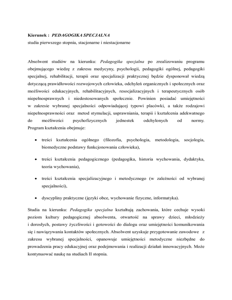 Kierunek : PEDAGOGIKA SPECJALNA studia pierwszego stopnia