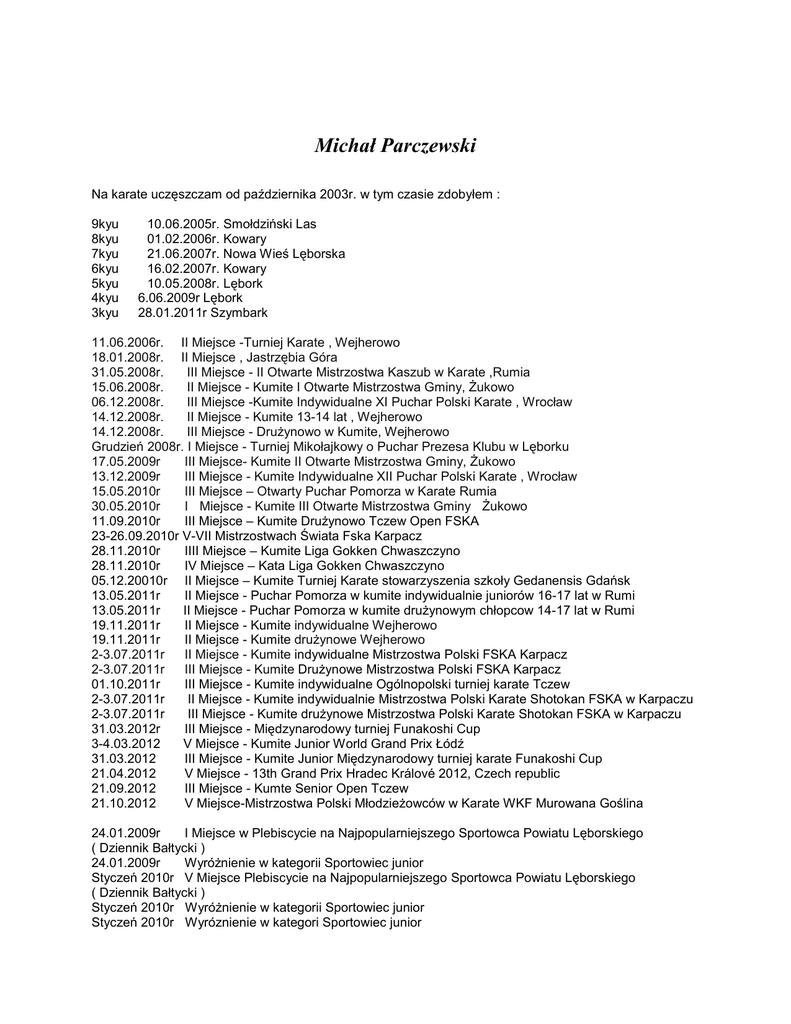 Michał Parczewski Na karate uczęszczam od października 2003r. w tym czasie zdobyłem : 9kyu 8kyu 7kyu 6kyu 5kyu 4kyu 3kyu 10.06.2005r. Smołdziński Las 01.02.2006r. Kowary 21.06.2007r. Nowa Wieś Lęborska 16.02.2007r. Kowary 10.05.2008r. Lębork 6.06.2009r Lębork 28.01.2011r Szymbark 11.06.2006r. II Miejsce -Turniej Karate , Wejherowo 18.01.2008r. II Miejsce , Jastrzębia Góra 31.05.2008r. III Miejsce - II Otwarte Mistrzostwa Kaszub w Karate ,Rumia 15.06.2008r. II Miejsce - Kumite I Otwarte Mistrzostwa Gminy, Żukowo 06.12.2008r. III Miejsce -Kumite Indywidualne XI Puchar Polski Karate , Wrocław 14.12.2008r. II Miejsce - Kumite 13-14 lat , Wejherowo 14.12.2008r. III Miejsce - Drużynowo w Kumite, Wejherowo Grudzień 2008r. I Miejsce - Turniej Mikołajkowy o Puchar Prezesa Klubu w Lęborku 17.05.2009r III Miejsce- Kumite II Otwarte Mistrzostwa Gminy, Żukowo 13.12.2009r III Miejsce - Kumite Indywidualne XII Puchar Polski Karate , Wrocław 15.05.2010r III Miejsce – Otwarty Puchar Pomorza w Karate Rumia 30.05.2010r I Miejsce - Kumite III Otwarte Mistrzostwa Gminy Żukowo 11.09.2010r III Miejsce – Kumite Drużynowo Tczew Open FSKA 23-26.09.2010r V-VII Mistrzostwach Świata Fska Karpacz 28.11.2010r IIII Miejsce – Kumite Liga Gokken Chwaszczyno 28.11.2010r IV Miejsce – Kata Liga Gokken Chwaszczyno 05.12.20010r II Miejsce – Kumite Turniej Karate stowarzyszenia szkoły Gedanensis Gdańsk 13.05.2011r II Miejsce - Puchar Pomorza w kumite indywidualnie juniorów 16-17 lat w Rumi 13.05.2011r II Miejsce - Puchar Pomorza w kumite drużynowym chłopcow 14-17 lat w Rumi 19.11.2011r II Miejsce - Kumite indywidualne Wejherowo 19.11.2011r II Miejsce - Kumite drużynowe Wejherowo 2-3.07.2011r II Miejsce - Kumite indywidualne Mistrzostwa Polski FSKA Karpacz 2-3.07.2011r III Miejsce - Kumite Drużynowe Mistrzostwa Polski FSKA Karpacz 01.10.2011r III Miejsce - Kumite indywidualne Ogólnopolski turniej karate Tczew 2-3.07.2011r II Miejsce - Kumite indywidualnie Mistrzostwa Polski Karate Shotokan FSKA w Karpaczu 2-3.07.2011r III Miejsce - Kumite drużynowe Mistrzostwa Polski Karate Shotokan FSKA w Karpaczu 31.03.2012r III Miejsce - Międzynarodowy turniej Funakoshi Cup 3-4.03.2012 V Miejsce - Kumite Junior World Grand Prix Łódź 31.03.2012 III Miejsce - Kumite Junior Międzynarodowy turniej karate Funakoshi Cup 21.04.2012 V Miejsce - 13th Grand Prix Hradec Králové 2012, Czech republic 21.09.2012 III Miejsce - Kumte Senior Open Tczew 21.10.2012 V Miejsce-Mistrzostwa Polski Młodzieżowców w Karate WKF Murowana Goślina 24.01.2009r I Miejsce w Plebiscycie na Najpopularniejszego Sportowca Powiatu Lęborskiego ( Dziennik Bałtycki ) 24.01.2009r Wyróżnienie w kategorii Sportowiec junior Styczeń 2010r V Miejsce Plebiscycie na Najpopularniejszego Sportowca Powiatu Lęborskiego ( Dziennik Bałtycki ) Styczeń 2010r Wyróżnienie w kategorii Sportowiec junior Styczeń 2010r Wyróznienie w kategori Sportowiec junior 24.06.2010r II Miejsce w Konkursie na Najlepszego Sportowca Gimnazjum