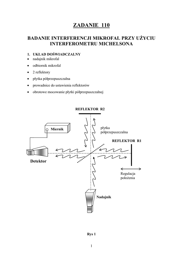 ZADANIE 110 BADANIE INTERFERENCJI MIKROFAL PRZY UŻYCIU INTERFEROMETRU MICHELSONA 1. UKŁAD DOŚWIADCZALNY • nadajnik mikrofal • odbiornik mikrofal • 2 reflektory • płytka półprzepuszczalna • prowadnice do ustawienia reflektorów • obrotowe mocowanie płytki półprzepuszczalnej REFLEKTOR R2 płytka półprzepuszczalna Miernik REFLEKTOR R1 Detektor Regulacja położenia Nadajnik Rys 1 1 2. WYKONANIE ĆWICZENIA: 1. Podłączyć miernik do detektora. 2. Włączyć zasilanie generatora mikrofal i miernika. Ustawić na mierniku pomiar wysokich częstości. 3. Ustawić płytkę tak, aby mikrofale przebiegały tak jak zaznaczono na rys. 1. 4. Włączyć generator. 5. Ustawić optymalny kąt nachylenia płytki. Jak można sprawdzić, czy ustawienie jest faktycznie optymalne? 6. Ustawić optymalny zakres miernika. 7. Ustawić reflektory w porównywalnych odległościach od płytki. 8. Korzystając ze śruby mikrometrycznej, znaleźć położenie reflektora R1 dla którego natężenie mikrofal w detektorze jest maksymalne. 9. Wyznaczyć położenie reflektora dla co najmniej trzech minimów i maksimów. 10. Zmierzyć natężenie fali w funkcji położenia reflektora R1, pomiędzy dwoma maksimami. 11. Zmierzyć osobno natężenie interferujących wiązek. Jak można to łatwo zrobić? Jak oszacować niepewność pomiaru? 12. Odczytać częstość fali z generatora. UWAGA! Należy unikać stawania na linii wiązki mikrofal, aby nie stać się „konkurencyjnym reflektorem” i w ten sposób nie zafałszować wyników! Literatura do zadania 110 D. Holliday, R. Resnick, Podstawy fizyki, tom II i tom IV, Wydawnictwo Naukowe PWN, Warszawa 1996 2 INSTRUKCJA ZADANIE 110 Badanie interferencji mikrofal przy użyciu interferometru Michelsona 1.Interferometr Michelsona Pierwotnie urządzenie zwane Interferometrem Michelsona posłużyło w doświadczeniu Michelsona-Morleya do wykazania stałości prędkości światła w układach odniesienia poruszających się względem siebie, a tym samym do obalenia teorii eteru. Aktualnie urządzenie to ma szereg zastosowań w technice i może być, jak w przypadku tego doświadczenia, wykorzystane do wyznaczania długości fali promieniowania elektromagnetycznego. Emitowane przez nadajnik promieniowanie elektromagnetyczne dociera do płytki półprze, gdzie jest rozdzielone na dwie prostopadłe wiązki (patrz rys. 1). Obie odbijają się od dwóch oddzielnych reflektorów R1 i R2, a potem kierowane są ponownie na płytkę półprzepuszczalną. Po przejściu przez płytkę łączą się w jedną wiązkę i trafiają do detektora (bieg wiązki ilustrują strzałki na rys. 1). Wskutek tego, promieniowanie elektromagnetyczne docierające do detektora jest złożeniem dwóch wiązek pochodzących z jednego źródła, ale przebywającego różne drogi. Regulując położenie jednego z reflektorów, zmienia się drogę optyczną. Tym samym zmienia się wzajemne przesunięcie fazowe obu wiązek. Dobierając odpowiednie położenie reflektora można zaobserwować w detektorze minima i maksima natężenia promieniowania do niego docierającego. Na tej podstawie możliwe jest wyznaczenie długości fali. Łatwo zauważyć, że dla amplitudy fali elektromagnetycznej A = A0 cos ωt natężenie 2 I = A = A02 cos 2 ωt złożenie dwu fal o identycznej częstości a przesuniętych w fazie o ϕ daje amplitudę A = A0 cos ωt + A1 cos (ωt + φ ) 3 i natężenie . I = Ao cos ωt + A1 cos(ωt + φ ) 2 Wobec tego, gdy A0=A1=A to dla ϕ = 0 I = 4 A0 cos 2 ωt Zaś dla ϕ = π A0 cos (ω t + π ) = − A0 cos ωt ⇒ I =0 Podobny opis interferencji mikrofal można przedstawić dla dowolnego przesunięcia fazowego. 2. Układ doświadczalny Na rys. 1 przedstawiono układ pomiarowy, w skład którego wchodzą: • nadajnik mikrofal • odbiornik mikrofal • 2 reflektory • płytka półprzepuszczalna • prowadnice do ustawienia reflektorów • obrotowe mocowanie płytki półprzepuszczalnej 4 REFLEKTOR R2 płytka półprzepuszczalna Miernik REFLEKTOR R1 Detektor Regulacja położenia Nadajnik Rys. 1 3. Wykonanie ćwiczenia 13. Podłączyć miernik do detektora. 14. Włączyć zasilanie generatora mikrofal i miernika. Ustawić na mierniku pomiar wysokich częstości. 15. Ustawić płytkę tak, aby mikrofale przebiegały tak jak zaznaczono na rys. 1. 16. Włączyć generator. 17. Ustawić optymalny kąt nachylenia płytki. Jak można sprawdzić, czy ustawienie jest faktycznie optymalne? 18. Ustawić optymalny zakres miernika. 19. Ustawić reflektory w porównywalnych odległościach od płytki. 20. Korzystając ze śruby mikrometrycznej, znaleźć położenie reflektora R1 dla którego natężenie mikrofal w detektorze jest maksymalne. 21. Wyznaczyć położenie reflektora dla co najmniej trzech minimów i maksimów. 22. Zmierzyć natężenie fali w funkcji położenia reflektora R1, pomiędzy dwoma maksimami. 5 23. Zmierzyć osobno natężenie interferujących wiązek. Jak można to łatwo zrobić? Jak oszacować niepewność pomiaru? 24. Odczytać częstość fali z generatora. UWAGA! Należy unikać stawania na linii wiązki mikrofal, aby nie stać się „konkurencyjnym reflektorem” i w ten sposób nie zafałszować wyników! 1. Opracowanie wyników Na podstawie uzyskanych danych należy: • Wyznaczyć długość fali wykorzystywanych ćwiczeniu mikrofal. Jakiej częstości fali ona odpowiada? • Porównać uzyskany wynik z częstością odczytaną na generatorze. • Porównać dane doświadczalne z teoretyczną krzywą intensywności mikrofal docierających do detektora. Jaką zależnością powinna być opisywana intensywność fali powstałej w skutek interferencji dwóch różnych, wiązek? Literatura D. Holliday, R. Resnick, Podstawy fizyki, tom II i tom IV, Wydawnictwo Naukowe PWN, Warszawa 1996 6 Zadania do ćwiczeń z falami elektromagnetycznymi 1. Płaska fala elektromagnetyczna rozchodzi się wzdłuż osi x. Narysuj odpowiadający jej rozkład pola elektryczn