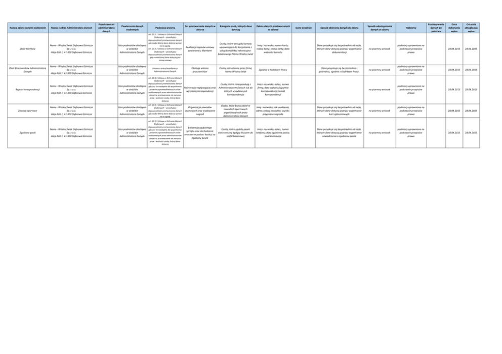 Nazwa zbioru danych osobowych Nazwa i adres Administratora Danych Przedstawiciel administratora danych Powierzenia danych osobowych Podstawa prawna art. 23.1.1 Ustawy o Ochronie Danych Osobowych – powołujący dopuszczalność przetwarzania danych gdy osoba której dane dotyczą wyrazi na to zgodę. art. 23.1.3 Ustawy o Ochronie Danych Osobowych – powołujący dopuszczalność przetwarzania danych gdy osoba której dane dotyczą jest stroną umowy Cel przetwarzania danych w zbiorze Kategoria osób, których dane dotyczą Zakres danych przetwarzanych w zbiorze Realizacja zapisów umowy zawieranej z klientami Osoby, które wykupiły karnety uprawniające do korzystania z usług kompleksu rekreacyjnobasenowego Nemo-Wodny świat Data dokonania wpisu Ostatnia aktualizacja wpisu podmioty uprawnione na podstawie przepisów prawa 28.04.2015 28.04.2015 na pisemny wniosek podmioty uprawnione na podstawie przepisów prawa 28.04.2015 28.04.2015 na pisemny wniosek podmioty uprawnione na podstawie przepisów prawa 28.04.2015 28.04.2015 Sposób zbierania danych do zbioru Sposób udostępniania danych ze zbioru Odbiorcy Imię i nazwisko; numer karty; rodzaj karty; status karty; data ważności karnetu Dane pozyskuje się bezpośrednio od osób, których dane dotyczą poprzez wypełnienie dokumentacji na pisemny wniosek Dane pozyskuje się bezpośrednio i pośrednio, zgodnie z Kodeksem Pracy. Zbiór Klientów Nemo - Wodny Świat Dąbrowa Górnicza Sp. z o.o. Aleja Róż 1, 41-300 Dąbrowa Górnicza lista podmiotów dostepna w siedzibie Administratora Danych Zbiór Pracowników Administratora Danych Nemo - Wodny Świat Dąbrowa Górnicza Sp. z o.o. Aleja Róż 1, 41-300 Dąbrowa Górnicza lista podmiotów dostepna w siedzibie Administratora Danych Umowy o pracę/współpracę z Administratorem Danych Obsługa własna pracowników Osoby zatrudnione przez firmę Nemo-Wodny świat Zgodnie z Kodeksem Pracy art. 23.1.5 Ustawy o Ochronie Danych Osobowych – powołujący dopuszczalność przetwarzania danych gdy jest to niezbędne dla wypełnienia prawnie usprawiedliwionych celów realizowanych przez administratorów danych a przetwarzanie nie narusza praw i wolności osoby, której dane dotyczą Rejestracja napływającej oraz wysyłanej korespondencji Osoby, które korespondują z Administratorem Danych lub do których wysyłana jest korespondencja Imię i nazwisko; adres; nazwa firmy; data wpływu/wysyłnia korespondencji; temat korespondencji Dane wrażliwe Przekazywanie danych do państwa Rejestr korespondencji Nemo - Wodny Świat Dąbrowa Górnicza Sp. z o.o. Aleja Róż 1, 41-300 Dąbrowa Górnicza lista podmiotów dostepna w siedzibie Administratora Danych Zawody sportowe Nemo - Wodny Świat Dąbrowa Górnicza Sp. z o.o. Aleja Róż 1, 41-300 Dąbrowa Górnicza lista podmiotów dostepna Osobowych – powołujący dopuszczalność przetwarzania danych w siedzibie gdy osoba której dane dotyczą wyrazi Administratora Danych Organizacja zawodów sportowych oraz wydawanie nagród Osoby, które biorą udział w zawodach sportowych organizowanych przez Administratora Danych Imię i nazwisko; rok urodzenia; adres; rodzaj zawodów; wyniki; przyznana nagroda Dane pozyskuje się bezpośrednio od osób, których dane dotyczą poprzez wypełnienie kart zgłoszniowych na pisemny wniosek podmioty uprawnione na podstawie przepisów prawa 28.04.2015 28.04.2015 Nemo - Wodny Świat Dąbrowa Górnicza Sp. z o.o. Aleja Róż 1, 41-300 Dąbrowa Górnicza art. 23.1.5 Ustawy o Ochronie Danych Osobowych – powołujący dopuszczalność przetwarzania danych gdy jest to niezbędne dla wypełnienia prawnie usprawiedliwionych celów realizowanych przez administratorów danych a przetwarzanie nie narusza praw i wolności osoby, której dane dotyczą Ewidencja zgubionego sprzętu oraz dochodzenie roszczeń w postaci kaukcji za zgubiony pasek Osoby, które zgubiły pasek elektroniczny będący kluczem do szafki basenowej Imię i nazwisko; adres; numer telefonu; data zgubienia paska; pobrana kaucja Dane pozyskuje się bezpośrednio od osób, których dane dotyczą poprzez wypełnienie oświadczenia o zgubieniu paska na pisemny wniosek podmioty uprawnione na podstawie przepisów prawa 28.04.2015 28.04.2015 Zgubione paski art. 23.1.1 Ustawy o Ochronie Danych na to zgodę lista podmiotów dostepna w siedzibie Administratora Danych