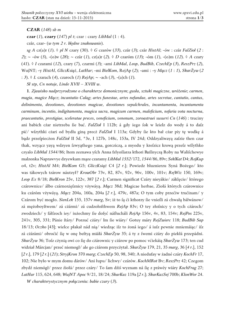 Słownik polszczyzny XVI wieku - wersja elektroniczna hasło: CZAR (stan na dzień: 15-11-2015) www.spxvi.edu.pl strona 1/3 CZAR (148) sb m czar (1), czary (147) pl t; czar : czary LibMal (1 : 4). czår, czar- (w tym 2 r. błędne znakowanie). sg A cz(a)r (1). ◊ pl N czary (30). ◊ G czarów (33), czår (3); czår HistAl; -ów : czår FalZioł (2 : 2); ~ -ów (5), -(o)w (28); ~ czår (1), cz(a)r (2). ◊ D czaróm (13); -óm (1), -(o)m (12). ◊ A czary (41). ◊ I czarami (12), czary (7), czarmi (3); -ami LibMal, Leop, BudBib, CzechEp (3), ReszPrz (2), WujNT; -y HistAl, GliczKsiąż, LatHar; -mi BielKom, RejAp (2); -ami : -y Mącz (1 : 1), SkarŻyw (2 : 3). ◊ L czarach (4), czaroch (1) RejAp; ~ -ach (3), -(a)ch (1). Sł stp, Cn notuje, Linde XVII – XVIII w. 1. Zjawisko nadprzyrodzone o charakterze demonicznym; gusła, sztuki magiczne, wróżenie; carmen, magia, magice Mącz; incantatio Calag; artes funestae, artes nefandae, artes secretae, cantatio, cantus, delinimenta, devotiones, devotiones magicae, devotiones sepulchrales, incantamenta, incantamenta carminum, incentio, indigitamenta, magica sacra, magicum carmen, maleficium, nefaria vota nocturna, praecantatio, prestigiae, sceleratae preces, veneficium, venenum, zoroastraei susurri Cn (146) : truciny ani babich cżar nietrzeba ſie bać. FalZioł I 112b; á gdy iego ſok w leielz do wody á to daſz pić/ wſzythki cżari od bydła giną precż FalZioł I 113a; Gdyby ſie kto bał cżar piy tę wodkę á bądz przeſpiecżon FalZioł II 5d, *3e, I 127b, 148c, 153a, IV 24d; Oddzyaliwayą zaſzie then czar thak, wzyącz yayą wdzyen ſzwyąthego yana, gorcziczą, a myodu y kreſzicz krową przeſz wſſythko czyalo LibMal 1544/86; Item zeznawa yſch Anna fzlyoſſarza kthori Ruſſnyczą Roby na Waliſchewye malzonka Naprawvye dzyewkam mąze czaramy LibMal 1552/172, 1544/86, 89v; SeklKat D4; RejKup o4, t2v; HistAl M4; BielKom G5; GliczKsiąż C4 [2 r.]; Powiedz bluznierzu Syná Bożego/ kto was tákowych tzárow náutzył? KrowObr 73v, 82, 87v, 92v, 96v, 100v, 101v; RejWiz 150, 169v; Leop Ex 8/18; BielKron 25v, 122v, 387 [2 r.]; Carmen significat Czáry nieyákie/ záklęcie/ którego czárownice/ álbo czárnoxięſznicy vżywáyą. Mącz 38d; Magicae herbae, Ziołá których czárownice ku czáróm vżywáyą. Mącz 204a, 160a, 204a [2 r.], 479c, 487a; O tym coby przećiw trućinam/ y Czárom być mogło. SienLek 155, 157v marg, Sv; iż to ſą ći kthorzy ſie vnieſli zá chwałą báłwánow/ zá mężoboyſtwem/ zá cżármi/ zá cudzołoſthwem RejAp 83v; O tey złoſnicy y o tych cżároch/ zwodziech/ y fáłſzoch iey/ iużechmy ſie doſyć náſłucháli RejAp 156v, 4v, 83, 154v; RejPos 225v, 241v, 305, 331; Pánie ſtáry/ Porzuć cżáry/ Im ſie wiáry/ Gotuy máry RejZwierc 118; BudBib Sap 18/13; Oczko [43]; wielce płakał nád nią/ wiedząc iſz to żoná iego/ á iuſz pewnie mniemáiąc/ iſz zá cżárámi/ obroćić ſię w onę beſtyą miáłá SkarŻyw 35; á ty z ſwemi cżáry do piekłá przepádni. SkarŻyw 36; Toſz cżynią owi co ſię do cżárownic y cżárow po pomoc vćiekáią SkarŻyw 173; ten cud widział Márcjan/ przeć niemogł/ ale go cżárom przycżytał. SkarŻyw 179, 21, 35 marg, 36 [4 r.], 152 [2 r.], 179 [2 r.] (21); StryjKron 370 marg; CzechEp 50, 98, 340; A niedufay w żadné czáry KochFr 17, 102; Nie było w mym domu dárów/ Ani łupu/ lichwy/ czárów. KochMRot Bv; ReszPrz 42; Czegom zbydź niemógł/ przez źiołá/ przez czáry/ To ſam dźiś wyznam ná ſię z práwéy wiáry KochFrag 27; LatHar 115, 624, 648; WujNT Apoc 9/21, 18/24; SkarKaz 119a [2 r.]; SkarKazSej 700b; KlonWor 24. W charakterystycznym połączeniu: babie czary (3). Słownik polszczyzny XVI wieku - wersja elektroniczna hasło: CZAR (stan na dzień: 15-11-2015) www.spxvi.edu.pl strona 2/3 Zwroty: »czary czynić, stroić, sprawować« (3 : 3 : 1): I záſię dźień Swiętego Ianá/ tzáruiąc wino thák ty tzáry ſwoie ſpráwuieſz. KrowObr 97v; Mącz 156c; czemu błaznowie wierząc/ śiłá tym korzenim czárow czynili SienLek 199; nákoniec odſtąpiwſzy Páná Bogá ſwego do ich Bogow przyſtáli/ y cżáry znimi y pokłon báłwochwálſki ſtroili. SkarŻyw 557, 306, 503, 517. »w czary, czarom wierzyć« [szyk zmienny] (3 : 2): Aby im oney wiáry lepiey potwirdzili/ Aby ſwym cżárom więcey/ niż Pánu wierzyli. RejWiz 150; Tego też cżáſu Zmodź pokrzcżona ieſt/ ktorzy iáko ine bydło żyli ná świećie/ ogień chwaląc/ pthaki w leſie/ a duſze ná grobiech karmiąc/ w rozmaite cżáry wierząc. BielKron 385; cżárty chwalą y wierzą cżárom BielKron 445, 6; SienLek 189v. Wyrażenia: »czarnoksięskie czary« (1): tám przez cżárnoxięskie cżáry diabłow wzywał HistAl Av. »czary diabelskie« [szyk 1 : 1] (2): Ieſliby kto w Páná Iezu Kryſtá Báránká prawdziwego wierzyć niechćiał/ y wtzárách ſię Dyabelſkich y bluznierſtwách kochał/ niepotrzebá mu więthſzey tzárownice/ y bluznierzá ſſukáć KrowObr 68v; Także Trynitarze wſzyſcy [...] háńbią Troycę świętą/ zowiąc ią (áż y ſtrách piſáć) Dyabelſkimi cżárámi/ morſkimi dźiwámi/ piekielnym Cerberuſem. ReszPrz 90. »papieskie czary« (1): Iż żywot zakonnicży/ y wotá/ ktore BOgu cżynią/ ſą Papieſkie cżáry. ReszPrz 41. Szeregi: »czary a bałamuctwa« (1): ztąd ówy Sobótki/ nocné ognie/ zbiéránia źiół/ y do czárów a báłámuctw bábich kiermáſz Oczko 29. »czarnoksięstwo (a. czarnoksięska nauka), (albo) czary« = magiae JanStat [szyk 5 : 3] (8): A tak iuż pokuſzáią rozmáitych cżar álbo cżárnokſięſtwá/ wynálezienia nowego/ chytroſći rozmáitey/ y diabelskiego wzywánia/ tho im wſzytko nic nie pomoże HistAl M4; Czwarta/ Ieſliby ſye około Czárnokſyęſkiey náuki álbo Czárow obierał. GroicPorz 14v, ii2; RejAp 166; Ná oſtátek przez cżáry/ przez cżárnokſięſtwo/ kuſzą ſie niektorzy zniewolić pocżćiwe ſercá GórnDworz Bb