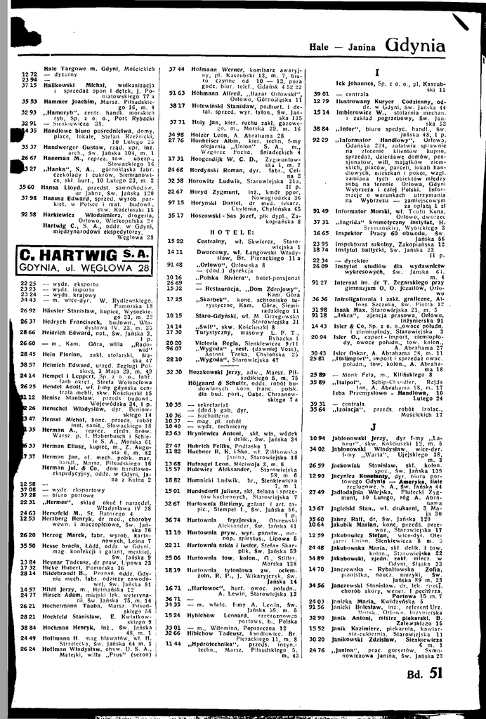 Hale Hale Targowe ID. Gdyni, Mościckich 12 72 — dyżurny 23 94 3715 Halikowski Michał, wulkanizacja i sprzedał opon I dętek, J. Po niatowskiego 77 a 3553 Hammer Joachim, Marsz. Piłsudskie go 16, m. 4 32 93 „Hamoryb", centr. handl. morskich ryb, Sp. z o. o., Port Rybacki 32 91 — Sienkiewicza 38. 14 35 Handlowe biuro pośrednictwa, domy, place, lokale, Stefan Rzeżnicki, 10 Lutego 25 35 37 Handwerger Gustaw, rząd. upr. inż. arch., Św. Jańska 104, m. 1 26 67 Haneman M . , reprez. tow. ubezp., Słowackiego 16 I 13 27 „ H a n k a " , S. A., górnośląska labr. czekolady i cukrów, Siemianowi ce, skl. hurt., 10 Lutego 23. m. 2 35 60 Hansa Lloyd, przedst. samochodów, ar Jahnz, Św. Jańska 120 37 98 Hanusz Edward, sprzed, wyrób, par kiet, w Polsce i mat. budowl., skw. Kościuszki 15 Włodzimierz, drogeria, 92 58 Harkiewlcz Orłowo, Wielkopolska 24 Hartwig C , S. A., oddz. w Gdyni, międzynarodowi ekspedytorzy. Węglowa 28 C. HARTWIG s . a GDYNIA, ul. WĘGLOWA 28 22 23 23 34 25 — wydz. eksportu 23 — wydz. importu 24 — wydz. krajowy 43 — m. wice-dyr. W. Rydlewskiego, Pomorska 18 2692 Häusler Stanisław, kupiec, Wysockie go 33, m. 22 26 37 Hedrych Franciszek, budowo., Wła dysława IV. 23, m. 35 28 66 Heldrich Edward, not., Św. Jańska 3, 1 p. 26.60 — m., Kam. Góra, willa „Radowid" 28 45 Heln Florian, zakl. stolarski, ślą ska 47 38 57 Helmich Edward, urzed. żeglugi Pol skiej, 3 Maja 29, m. 4.9 2414 Hempel I Leppcrt, Sp. z o. o., fabr. larb okręt.. Strefa Wolnocłowa 26 25 Hendel Adolf, wł. f-my gdyńska cen trala mebli, skw. Kościuszki 15 3112 Henlsz Stanisław, przeds. budowl., Wojewódzka 34, I p. !26 Henschel Władysław, dyr. Beniow skiego 14 147 Hensel Michał, konc. przeds. robót inst. sanit.. Słowackiego 18 L35 Herman A., reprez. zjedn. brow. Warsz. p. i . Haberbusch I Schiele S. A., Morska 61 i 33 Herman Eliasz, kupiec, m., Z. Augu sta 6, m. 82 17 37 Herman Jan, oj. mech. polsk. mar. handl., Marsz. Piłsudskiego 16 Herman Jul. & Co, dom nandlowoekspedycyjny, oddz. w Gdyni, Ja na z Kolna 2 12 58 37 08 — wydz. eksportowy 37 28 — biuro portowe 22 31 „Hermes", skład okuć I narzędzi, Władysława IV 28 24 63 Hcrszfeld M . , St. Batorego 4 1253 Herzberg Henryk, dr med., choroby wewn. i moczoplciowe, Św. Jań ska 76 26 20 Herzog Marek, fabr. wyrób, karto nowych, Leśna 7 35 50 Hesse bracia, Łódź, oddz. w Gdyni, mag. konfekcji i galant, męskiej, Św. Jańska 9 13 84 Heynar Tadeusz, dr praw. Lipowa 23 17 32 Hicke Hubert, Pomorska 36 2814 Hildebrandt B., Poznań, oddz. Gdy nia mech. labr. odzieży zawodo we], Sw. jańska 51 14 57 Hlldt Jerzy, m.. Hetmańska 12 Hirsch Adam, miejski lek. weteryna 24 77 rii, Św. Jańska 76, m. 14 Hochermann Tauba, Marsz. Piłsud 26 21 skiego 56 2821 Hochfeld Stanisław, E. Kwiatkow skiego 9 38 84 Hochman Henryk, Int., Św. Jańska 48, m. 1 24 49 Holfmann H . mag btawstów, wł. H . Strzelecka, Sw. Jańska 64 m. 1 26 24 Hoffman Władysław, obyw. O . S. A., Matejki, willa „ P r u s " (sezon) 37 44 9163 3817 37 71 34 98 27 76 17 31 24 68 32 38 2267 97 15 3517 15 22 1411 9148 10 16 2669 15 32 17 25 1015 14 14 17 30 20 20 96 07 2810 32 30 10 35 10 36 10 37 10 40 23 63 27 47 1182 13 68 15 57 18 82 15 01 3267 36 74 1110 2211 25 06 1819 1671 3671 34 35 15 24 3301 32 66 1144 Hofmana Werner, komisarz awaryj ny, pl. Kaszubski 13, m. 7, biu ro czynne od 10 — 13, poza godz. biur. telef., Qdańsk 4 62 22 Hohmann Alfred, „Bazar Orłowski", Orłowo, Górnośląska 11 Holewiński Stanisław, podhurt. i de tal, sprzed, wyr. tytoń., Sw. Jań ska 135 Holy Jan, kler. ruchu zakł. gazowe go, m., Morska 29, m. 16 Holzer Leon, A. Abrahama 28 Honheiser Albin, kier. techn. f-my olejarnia „Union" S. A., m., Wzgórze Focha, Śniadeckich 4 Hoogendijk W. C. O., Zygmuntowska 1, m. 7 Hordyński Roman, dyr. fabr.. Cel na 2 Horowitz Ludwik, Starowiejska 31a, 11 p. Horyd Zygmunt, inż., kmdr ppor, Nowogrodzka 36 Horyńskl Daniel, dr med. lekarz. Chylonia, Chylońska 65 Hoszowski - Sas Józef, pik dypl.. Za kopiańska 8 H O T E L E : Centralny, wł. Skwiercz, Staro wiejska 1 Dworcowy, wł. Łangowskl Włady sław, Br. Pierackiego 11 a „Orłowo", Orłowska 8 — (dod.) dyrekcja „Polska Riviera", hotel-pensjonat — Restauracja, „ D o m Zdrojowy", Kam. Góra „Skarbek", konc. schronisko tu rystyczne. Kam. Góra, Siemi radzkiego 11 Staro-Gdyńskl, wł. M . Grzegowska Starowiejska 31 „ ś w i t " , skw. Kościuszki 8 Turystyczny, masowy L . P. T., Rybacka 1 Victoria Regla, Sienkiewicza 9/11 „Wygoda" , rest. (dawniej Voss), Antoni Troka, Chylońska 25 „ W y g o d a " , Starowiejska 47 Hozakowski Jerzy, adw.. Marsz. Pił sudskiego 6, m. 75 Höjgaard & Schultz, oddz. robót bu dowlanych kons. Iranc. polsk. dla bud. port., Qabr. Chrzanow skiego 7 a — sekretariat — (dod.) gab. dyr. — bu'chalteria — mag. pl. robót — wydz. techniczny Hryniewicz Antoni, skł. win, wódek i delik., Sw. Jańska 34 Hubrlch Feliks, Podlaska 1 Huebner R. K. i Ska, w l . Ziółkowska Janina, Starowiejska 18 Hufnagel Leon. Mściwoja 3, m. 5 Hulewicz Aleksander, Starowiejska 58, m 6 Humnlckl Ludwik, lir., Sienkiewicza 7, m. 1 Hundsdorff Juliusz, skł. żelaza I sprzę tów kuchennych, Starowiejska 7 Hurtownia Bielizny, galant i art. tą p i e , Stempel I . , Sw. Jańska 56, I p. Hartownia fryzjerska, Olszewski Aleksander, sw. Jańska 41 Hartownia pryw. wyr. państw., monop. spirytus.. Lipowa 6 Hurtownia szkła i luster, Stefan Skarpllk, Sw. Jańska 59 Hurtownia tow. kolon., G., Stiller, Morska 138 Hurtownia tytoniowa zw. oclem. żołn. R. P., J. Wikaryjczyk, św. Jańska 14 „Hurtowoc", hurt. owoc. połudn., A. Lewin, Starowiejska 12 — — m. wlaśc. f-my A. Lev.in, Sw. Jańska 59, m. 6 Hyblchów Leonard, rzeczoznowja portowy, b., Polska — m., Wltomlno, Poprzeczna 12 Hibichow Tadeusz, handlowiec. Br. Pierackiego 11, m. 8 „Hydrotechnlka", przeds. Inżyn.techn.. Marsz. Piłsudskiego 5, m. 43 — Janina Gdynio lek Johannes, Sp. z o. o., p l . Ka