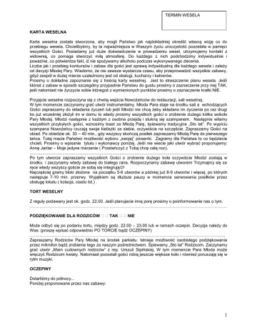 TERMIN WESELA KARTA WESELNA Karta weselna została stworzona, aby mogli Państwo jak najdokładniej określić własną wizję co do przebiegu wesela. Chcielibyśmy, by ta najważniejsza w Waszym życiu uroczystość pozostała w pamięci wszystkich Gości. Posiadamy już duże doświadczenie w prowadzeniu wesel, utrzymujemy kontakt z widownią, co pomaga stworzyć miłą atmosferę. Do każdego z nich podchodzimy indywidualnie i poważnie, co potwierdza fakt, iż nie spożywamy alkoholu podczas wykonywanego zlecenia. Liczba jak i przebieg konkursów i zabaw dla gości jest sprawą indywidualną dla każdego wesela i zależy od decyzji Młodej Pary. Wiadomo, że nie zawsze wystarcza czasu, aby przeprowadzić wszystkie zabawy, gdyż zespół w dużej mierze uzależniony jest od obsługi, kucharzy i kelnerów. Prosimy o dokładne zapoznanie się z treścią karty weselnej. Jest to streszczenie planu wesela. Jeśli któraś z zabaw w sposób szczególny przypadnie Państwu do gustu prosimy o zaznaczenie przy niej TAK, jeśli natomiast nie życzycie sobie któregoś z wymienionych punktów prosimy o zaznaczenie kratki NIE. Przyjęcie weselne rozpoczyna się z chwilą wejścia Nowożeńców do restauracji, sali weselnej. W tym momencie zaczynamy grać utwór instrumentalny. Młoda Para staje na środku sali a wchodzących Gości zapraszamy do składania życzeń lub jeśli Młodzi nie chcą żeby składano im życzenia po raz drugi bo już wcześniej złożyli im w domu to wtedy prosimy wszystkich gości o zrobienie dużego kółka wokoło Pary Młodej. Młodzi następnie z każdym z osobna przejdą i stukną się szampanem. Następnie witamy wszystkich przybyłych gości, wznosimy toast za Młodą Parę, śpiewamy tradycyjne „Sto lat”. Po wypiciu szampana Nowożeńcy rzucają swoje kieliszki za siebie, oczywiście na szczęście. Zapraszamy Gości na obiad. Po obiedzie ok. 30 – 40 min., gdy wszyscy skończą posiłek zapraszamy Młodą Parę do pierwszego tańca. Tutaj macie Państwo możliwość wyboru „swojej” piosenki. Zagramy dla Państwa to co będziecie chcieli. Prosimy o wpisanie tytułu i wykonawcy poniżej. Jeśli nie wiecie jaki utwór wybrać proponujemy: Annę Jantar – Moje jedyne marzenie ( Przetańczyć z Tobą chcę całą noc). ......................................................................................................................................................................... Po tym utworze zapraszamy wszystkich Gości o zrobienie dużego koła oczywiście Młodzi zostają w środku i zaczynamy wtedy zabawę do białego rana. Rozpoczynamy zabawę utworem Trzymajmy się za ręce wtedy wszyscy goście ze sobą się integrują! Najczęściej gramy bloki złożone na początku 5-6 utworów a później już 8-9 utworów i więcej, po których następuje 7-10 min. przerwy. Wyjątkiem są dłuższe pauzy w momencie serwowania posiłków przez obsługę lokalu ( kolacja, ciasto itd.) . TORT WESELNY Z reguły podawany jest ok. godz. 22.00. Jeśli planujecie inną porę prosimy o poinformowanie nas o tym. …………………………………………………………………………………………………………………………… PODZIĘKOWANIE DLA RODZICÓW TAK NIE Może odbyć się po podaniu tortu, między godz. 22.00 – 23.00 lub w ramach oczepin. Decyzja należy do Was: (proszę wpisać odpowiednio PO TORCIE bądź OCZEPINY) ………………………………………………………………………………………………………………………….. Zapraszamy Rodziców Pary Młodej na środek parkietu. Istnieje możliwość osobistego podziękowania przez mikrofon bądź zrobienia tego za naszym pośrednictwem. Śpiewamy „Sto lat” Rodzicom. Zaczynamy grać utwór „Mam cudownych rodziców” z rep. Urszuli Sipińskiej. W tym momencie Para Młoda może wręczyć Rodzicom kwiaty. Natomiast pozostali gości robią jeszcze większe koło i również poruszają się w rytm muzyki. OCZEPINY Dotarliśmy do północy... Poniżej proponowane przez nas zabawy: 1 TANIEC ODBIJANY TAK NIE Jest to ostatnia okazja zatańczenia z Młodą Parą, zanim staną się zgodnie z tradycją, Starą Parą. Goście weselni tańczą w dużym kole, Państwo Młodzi na środku. Grany utwór to znany walczyk biesiadny. Jego długość uzależniona jest od liczby chętnych do tańca Gości. RZUCANIE WELONU I MUCHY TAK NIE Tradycyjna zabawa oczepinowa. Zapraszamy na środek parkietu wszystkich „młodych” czyli gości stanu wolnego obecnych na weselu. Panna młoda rzuca za siebie welon (wianek), Pan Młody muchę (muszkiet). Mała wskazówka techniczna odnośnie pomocy Młodej Parze - Welon zdejmuje świadkowa a muchę świadek. Po wyłonieniu NOWEJ Młodej Pary śpiewamy dla nich „Sto lat” i mamy dla nich małą przygotowaną niespodziankę! KTO PIERWSZY, TEN LEPSZY TAK NIE Zapraszamy do zabawy 4 chętnych panów i 4 chętne panie. Na środku parkietu ustawiamy 7 krzeseł. Zespół zaczyna grać, kiedy skończy panowie i panie muszą jak najprędzej usiąść na wolne krzesło. Jak łatwo się domyślić jeden uczestnik zostanie bez krzesła – temu dziękujemy – niestety odpada. Zabieramy jedno krzesło. Schemat ten powtarza się do wyłonienia jednego zwycięzcy. UWAGA! żeby nie było za łatwo, po każdym fragmencie muzyki zespół prosi panów i panie o przyniesienie konkretnego fantu – przedmiotu (lub osoby ☺) z sali. Może to być np. widelec, pierścionek, but itd. Może też pojawić się prośba o bardziej wyszukany fant... MATRIX TAK NIE Niespodzianka od zespołu dla Pary Młodej i wszystkich gości. WYCIECZKA DO ZOO TAK NIE Podział na 2 grupy, pani młodej i pana młodego, w grupie 2 kobiety i 5 panów siedzących na krzesłach i zwróconych do siebie twarzami oczywiście mowa tu o drużynach Kolejność najpierw facet- tata , kobieta –mama, facet syn-Witek, facet syn-Jacek, kobieta-córka Zosia i faceci pies Azor i S