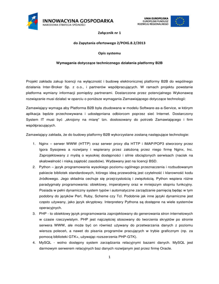 Załącznik nr 1 do Zapytania ofertowego 2/POIG.8.2/2013 Opis systemu Wymagania dotyczące technicznego działania platformy B2B Projekt zakłada zakup licencji na wyłączność i budowę elektronicznej platformy B2B do wspólnego działania Inter-Broker Sp. z o.o., i partnerów współpracujących. W ramach projektu powstanie platforma wymiany informacji pomiędzy partnerami. Dostarczone przez potencjalnego Wykonawcę rozwiązanie musi działać w oparciu o poniższe wymagania Zamawiającego dotyczące technologii: Zamawiający wymaga aby Platforma B2B była zbudowana w modelu Software-as-a-Service, w którym aplikacja będzie przechowywana i udostępniana odbiorcom poprzez sieć Internet. Dostarczony System IT musi być „skrojony na miarę” tzn. dostosowany do potrzeb Zamawiającego i firm współpracujących. Zamawiający zakłada, że do budowy platformy B2B wykorzystane zostaną następujące technologie: 1. Nginx – serwer WWW (HTTP) oraz serwer proxy dla HTTP i IMAP/POP3 stworzony przez Igora Sysojewa a rozwijany i wspierany przez założoną przez niego firmę Nginx, Inc. Zaprojektowany z myślą o wysokiej dostępności i silnie obciążonych serwisach (nacisk na skalowalność i niską zajętość zasobów). Wydawany jest na licencji BSD. 2. Python – język programowania wysokiego poziomu ogólnego przeznaczenia i rozbudowanym pakiecie bibliotek standardowych, którego ideą przewodnią jest czytelność i klarowność kodu źródłowego. Jego składnia cechuje się przejrzystością i zwięzłością. Python wspiera różne paradygmaty programowania: obiektowy, imperatywny oraz w mniejszym stopniu funkcyjny. Posiada w pełni dynamiczny system typów i automatyczne zarządzanie pamięcią będąc w tym podobny do języków Perl, Ruby, Scheme czy Tcl. Podobnie jak inne języki dynamiczne jest często używany, jako język skryptowy. Interpretery Pythona są dostępne na wiele systemów operacyjnych. 3. PHP - to obiektowy język programowania zaprojektowany do generowania stron internetowych w czasie rzeczywistym. PHP jest najczęściej stosowany do tworzenia skryptów po stronie serwera WWW, ale może być on również używany do przetwarzania danych z poziomu wiersza poleceń, a nawet do pisania programów pracujących w trybie graficznym (np. za pomocą biblioteki GTK+, używając rozszerzenia PHP-GTK). 4. MySQL - wolno dostępny system zarządzania relacyjnymi bazami danych. MySQL jest darmowym serwerem relacyjnych baz danych rozwijanym jest przez firmę Oracle. 1 5. Sphinx - to open source’owy silnik wyszukiwarki SQL. Sphinx jest dostępny na licencji GPL 2. Sphinx jest aplikacją stand-alone, musi zostać skompilowany i zainstalowany na serwerze. Działa na zadadzie deamon-client. 6. JavaScript -skryptowy język programowania, stworzony przez firmę Netscape. JS zapewnienia interaktywność poprzez reagowanie na zdarzenia, sprawdzania poprawności formularzy lub budowania elementów nawigacyjnych. Większość nowoczesnych aplikacji internetowych została zbudowana w oparciu o ten język programowania. 7. PrototypeJS - biblioteka programistyczna napisana w języku JavaScript przez Sama Stephensona. Jest zaimplementowana w jednym pliku najczęściej nazywanym prototype.js. Pozwala na znaczne przyspieszenie produkcji interfejsów użytkownika w porównaniu do kodu stworzonego w tzw. „czystym” języku JavaScript. 8. script.aculo.us - biblioteka programistyczna w języku JavaScript udostępniana na Licencji X11, której bazą jest Prototype JavaScript Framework, rozszerzając go o animacje i elementy interfejsu użytkownika na bazie obiektowego modelu dokumentu. script.aculo.us rozszerza Prototype JavaScript Framework poprzez dodanie efektów wizualnych, kontrolek interfejsu użytkownika i dodatkowe narzędzia. 9. HTML5 - język wykorzystywany do tworzenia i prezentowania stron i aplikacji internetowych. Jest rozwinięciem języka HTML 4 i jego XML-owej odmiany (XHTML 1). HTML 5 poza dodaniem nowych elementów, usprawniających tworzenie serwisów i aplikacji internetowych, doprecyzowuje wiele niejasności w specyfikacji HTML 4, dotyczących przede wszystkim sposobu obsługi błędów. Zamawiający wymaga aby rozwiązanie IT było oparte o obiektową i modułową oraz rozproszoną architekturę. W architekturze Systemu B2B wymagane jest rozdzielenie warstw prezentacji, fizycznych plików, baz danych na rozproszone współpracujące fizyczne maszyny. Każda z warstw systemu musi pracować w architekturze rozproszonej tzn. np. fizyczne pliki wgrywane do systemu przez użytkowników będą przechowywane na osobnym serwerze lub wirtualnej instancji. W momencie, gdy będzie brakować zasobów systemowych dla tej części platformy B2B, możliwe będzie wówczas uruchomienie dodatkowego serwera lub instancji – platforma B2B będzie w takim przypadku bez dodatkowych zmian i przerw technicznych mogła korzystać z dwóch serwerów zamiast jednego. Tak samo powinny zostać rozproszone pozostałe warstwy platformy B2B, tak aby np. baza danych mogła istnieć fizycznie na dwóch lub większej liczbie komputerów, przy czym traktowana będzie jednak jak jedna logiczna całość, dzięki czemu zmiany w zawartości bazy w jednym komputerze są uwzględniane również w innych maszynach. 2 Zamawiający wymaga aby mechanizmy rozproszenia baz danych oraz aplikacji i serwerów przechowujących pliki, umożliwiały pełne skalowanie rozwiązania zarówno pod względem skalowalności sprzętowej, jak i softwarowej, przy jednoczesnym zachowaniu niezawodności systemu. Zamawiający wymaga aby komunikacja pomiędzy partnerami za pomocą Systemu B2B mogła się odbywać za pomocą dwóch kanałów informacyjnych: poprzez bezpośrednie wykorzystanie platformy B2B w modelu Software-as-a-Service oraz integrację wymiany danych z systemami partnerów za pomocą formatu EDIFACT (Electronic Data Interchange For Administration, Commerce and Transport). Dostarczone przez Wykonawcę rozwiązan