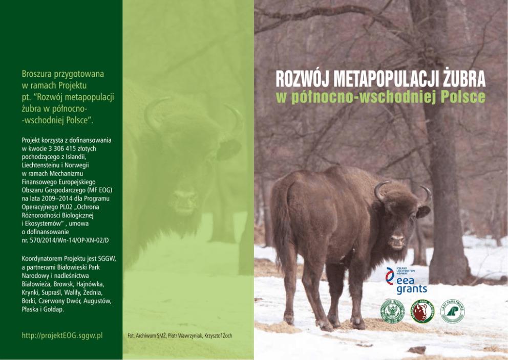 Rozwój metapopulacji żubra Broszura przygotowana w ramach Projektu pt. ”Rozwój metapopulacji żubra w północno-wschodniej Polsce”. w północno-wschodniej Polsce Projekt korzysta z dofinansowania w kwocie 3 306 415 złotych pochodzącego z Islandii, Liechtensteinu i Norwegii w ramach Mechanizmu Finansowego Europejskiego Obszaru Gospodarczego (MF EOG) na lata 2009–2014 dla Programu Operacyjnego PL02 „Ochrona Różnorodności Biologicznej i Ekosystemów” , umowa o dofinansowanie nr. 570/2014/Wn-14/OP-XN-02/D Koordynatorem Projektu jest SGGW, a partnerami Białowieski Park Narodowy i nadleśnictwa Białowieża, Browsk, Hajnówka, Krynki, Supraśl, Waliły, Żednia, Borki, Czerwony Dwór, Augustów, Płaska i Gołdap. http://projektEOG.sggw.pl Fot. Archiwum SMŻ, Piotr Wawrzyniak, Krzysztof Żoch Projekt: Rozwój metapopulacji żubra w północno-wschodniej Polsce G łównym celem jest kontynuacja i rozszerzenie działań realizowanych wcześniej w ramach projektu POIiŚ „Ochrona żubra w Polsce – część północno-wschodnia”. Aktualny projekt pozwala przedłużyć finansowanie bezpośredniej opieki nad populacjami żubra oraz ciągłe wzbogacanie bazy pokarmowej w trzech puszczach: Białowieskiej, Boreckiej i Knyszyńskiej, a co najważniejsze podejmowane są działania mające na celu rozszerzenie zasięgu gatunku w północno-wschodnim regionie kraju. Planuje się wypuszczenie żubrów na terenie nadleśnictwa Żednia w Puszczy Knyszyńskiej, przygotowanie łąk i poletek w Puszczy Augustowskiej oraz ocenę możliwości wsiedlenia w Puszczy Rominckiej. Projekt podzielony jest na siedem zadań, pięć realizowanych w poszczególnych puszczach, jedno mające na celu prowadzenie wszechstronnego monitoringu stad oraz zadanie koordynacji projektu. 1. Ochrona populacji żubra w Puszczy Białowieskiej P opulacja licząca ponad 500 osobników wymaga stałego dbania o zaplecze paszowe. Od ośmiu lat prowadzona jest dzierżawa (kontraktację) łąk prywatnych rolników na obrzeżach puszczy. Na dzierżawionych łąkach przygotowywane jest siano, z którego żubry mogą korzystać w okresie zimowym. W ostatnich latach powierzchnia dzierżawionych łąk wynosi ponad 100 ha rocznie. Dbamy również o łąki, poletka i sady wewnątrz kompleksu leśnego Puszczy Białowieskiej, aby zapewnić jak najwięcej naturalnego żeru. Pomimo tak wielu działań istnieje jednak potrzeba zakupu pasz i wykładania ich zimą w ponad 30 miejscach dokarmiania. Populacja w puszczy jest bardzo duża i jeśli tylko istnieje możliwość przekazania żubrów do innych stad są one odławiane i przewożone. W taki sposób białowieskie osobniki trafiają do wielu ośrodków w Polsce i Europie. W Białowieskim Parku Narodowym prowadzona jest Księga Rodowodowa Żubrów – rejestr wszystkich żubrów żyjących w Europie. W ramach projektu organizowane są warsztaty i spotkania, na których podejmujemy dyskusję nad programem ochrony i zarządzania tą szczególną populacją bytującą w odwiecznym mateczniku żubra. 6. 2. Ochrona i rozwój populacji żubra na obszarze Puszczy Knyszyńskiej 3. N a terenie czterech nadleśnictw puszczy prowadzone są prace mające na celu poprawę warunków bytowania żubrów – przygotowywane są poletka, rekultywowane i koszone łąki oraz pielęgnowane sady owocowe. Realizowane jest również zimowe dokarmianie w taki sposób, aby odciągnąć zwierzęta od pól uprawnych i tym samym zapobiegać powstawaniu szkód. Planowane jest wsiedlenie dodatkowego stada żubrów na terenie Nadleśnictwa Żednia, dzięki czemu zapewniona zostanie kontynuacja rozprzestrzenienia między puszczami Białowieską i Knyszyńską oraz umożliwiona zostanie naturalna wymiana pomiędzy izolowanymi do tej pory populacjami. Ważnym zadaniem jest przygotowanie projektu zagrody ekspozycyjno-edukacyjnej w nadleśnictwie Supraśl. Powstanie tej zagrody zmniejszy presję na wolne stado i umożliwi podziwianie króla puszczy w jego naturalnym środowisku. 3. Ochrona populacji żubra w Puszczy Boreckiej K ontynuowana będzie bieżąca opieka nad stadem żubrów w puszczy. Koszone będą łąki, zbierane siano, uprawiane poletka żerowe, zakupione pasze będą wykładane w miejscach dokarmiania. Ochrona populacji żubra w Puszczy Boreckiej Bardzo ważne będzie zbudowanie kolejnych brogów, co umożliwi większe rozproszenie stada. Dekoncentracja żubrów jest bardzo potrzebna ze względu na zmniejszenie zagrożenia chorobami zakaźnymi i inwazyjnymi (pasożytniczymi). W celu ochrony zdrowia miejsca dokarmiania są w sposób ciągły czyszczone z odchodów a po zimie jest prowadzona ich dezynfekcja. 4. Przygotowanie obszaru Puszczy Augustowskiej do wsiedlenia żubrów N a terenie wybranym na podstawie szczegółowej analizy siedlisk i warunków społecznych, pomiędzy nadleśnictwami Augustów i Płaska przygotowywana jest przyszła ostoja żubra – rekultywowane są łąki, przygotowywane wodopoje i planowana jest budowa zagrody aklimatyzacyjnej. Wszystko po to, aby w przyszłości sprowadzić grupę samic i wsiedlić żubry do Puszczy Augustowskiej, do której od czasu do czasu przychodzą samotne samce. Na terenie puszczy prowadzone są spotkania informacyjno-dyskusyjne dla lokalnej ludności, władz samorządowych i administracji leśnej, prezentujące kompleksowo zagadnienia związane z bytowaniem żubra w stanie wolnym. Podczas spotkań przedstawiane są wyniki eksperckich analiz możliwości wprowadzenia żubra do puszczy. Prezentowane są również dane dotyczące wiedzy i nastawienia miejscowej ludności do tego dużego ssaka. 5. Analiza możliwości wsiedlenia żubrów do Puszczy Rominckiej C elem jest szczegółowe zbadanie i ocena czynników mających wpływ na potencjalny proces wsiedlenia żubra. Określone będą warunki siedliskowe z uwzględnieniem innych kopytnych i przewidywany będzie wpływ obecności żubra na siedliska leśne i przestrzeń rolniczą. Wyniki szczegółowych 