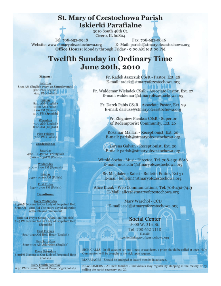 St. Mary of Czestochowa Parish Iskierki Parafialne 3010 South 48th Ct. Cicero, IL 60804 Tel. 708-652-0948 Fax. 708-652-0646 Website: www.stmaryofczestochowa.org E- Mail: [email protected] Office Hours: Monday through Friday - 9:00 AM to 5:00 PM Twelfth Sunday in Ordinary Time June 20th, 2010 Masses: Saturday 8.00 AM (English every 1st Saturday only) 5:00 PM (English) 6:30 PM (Polish) Sunday 8:30 AM (English) 10:00 AM (Polish) 12:00 PM (Spanish) 4:00 PM (Spanish) Weekdays 7:00 AM (English) 8:00 AM (English) First Fridays 7:00 PM (Polish) Confessions: Saturday 4:00 – 4:45 PM (Trilingual) 6:00 — 6:30PM (Polish) Wednesday 7:00 – 8:00 PM (Spanish) Sunday 9:30 – 10:00 AM (Polish) First Friday 6:30 – 7:00 PM (Polish) Devotions: Every Wednesday 8:30AM Novena to Our Lady of Perpetual Help 8:30 AM - 7:00 PM The entire day of adoration of the Blessed Sacrament 7:00 PM Prayer Group-Adoration (Spanish) 7:45 PM Novena to Our Lady of Perpetual Help (Spanish) First Fridays 8:30-9:30 AM Holy Hour (English) Fr. Radek Jaszczuk CSsR - Pastor, Ext. 28 E-mail: [email protected] Fr. Waldemar Wieladek CSsR - Associate Pastor, Ext. 27 E-mail: [email protected] Fr. Darek Pabis CSsR - Associate Pastor, Ext. 29 E-mail: [email protected] Fr. Zbigniew Pienkos CSsR - Superior of Redemptorist Community, Ext. 26 Rosamar Mallari - Receptionist, Ext. 20 E-mail: [email protected] Lorena Galvan - Receptionist, Ext. 20 E-mail: [email protected] Witold Socha - Music Director, Tel. 708-430-8816 E-mail: [email protected] Sr. Magdalene Kabat - Bulletin Editor, Ext 31 E-mail: [email protected] Alice Krzak - Web Communications, Tel. 708-432-7413 E-Mail: [email protected] Mary Warchol - CCD E-mail: [email protected] Social Center 5000 W. 31st St. Tel. 708-652-7118 E-mail: [email protected] First Saturdays 8:30-9:00 AM Adoration (English) Every Saturdays 6:30PM Novena to Our Lady of Perpetual Help (Polish) Every Fourth Saturday 6:30 PM Novena, Mass & Prayer Vigil (Polish) SICK CALLS - In all cases of serious illness or accidents, a priest should be called at once. Holy Communion will be brought to the sick upon request. MARRIAGES - Should be arranged at least 6 months in advance. NEWCOMERS - All new families / individuals may register by stopping at the rectory or by calling the parish secretary ext. 20. Sunday 9:30 10:00 June 20, Twelfth Sunday in Ordinary Time 8:30 Living and deceased Fathers 9:30 Litania do Serca Jezusa 10:00 Living and deceased Fathers 12:00 Living and deceased Fathers 4:00 Living and deceased Fathers 12:00 June 21, Monday, St. Aloysius Gonzaga, religious 7:00 Mark & Denise Yunker (Jean Yunker) 8:00 †Valentine Miarecki (Miarecki family) 4PM June 22, Tuesday, St. Thomas More, martyr 7:00 †Linda Simack (mother) 8:00 †Dorothy Sabal (friends at Drexel) June 23, Wednesday, Weekday in Ordinary Time 7:00 †Sally Draugel (friends at Drexel) 8:00 †Betty Sevorica (friends at Drexel 8:30 Novena: Our Lady of Perpetual Help/Adoration 7:00 El Circulo de Oración 7:45 Novena a Nuestra Señora del Perpetuo Socorro June 24, Thursday, Nativity of St. John the Baptist 7:00 Parishioners 8:00 †Holy Souls in the Book of Remembrance 6:30 Polish Mass 8:00 Spanish Mass June 25, Friday, Weekday in Ordinary Time 7:00 †Holy Souls in the Book of Remembrance 8:00 †Holy Souls in the Book of Remembrance 3PM Wedding: Antonia Perez & Victor Alvarez June 26 Saturday, Weekday in Ordinary Time 1:00 Wedding: Wendy N. Mendoza & Marvin N. Martinez 3:00 Quinceañera: Natalie Najeva 5:00 †Inez Jaramillo (Jaramillo family) †Walter Lauth (family) †Marie Zalesiak (Joe & Bernadine Jaramillo) 6:30 Za Parafian June 27, Thirteenth Sunday in Ordinary Time 8:30 Mark & Denise Yunker -1st wedding anniversary (D. Yunker & E. Wojdula families) †Anna Kubistol (Roseann Jaworski) †Marie Zalesiak (Rita Procek) Iskierki Parafialne Litania do Serca Jezusa Our Lady of Perpetual Help - intention of the Redemptorists Anna i Wojciech Mochoń o Boże Bl. i opiekię M.B. Czestochowskiej w 40-ą rocz. ślubu †Stanley Wdowiak (wife, Helen) †Halina & Stanley Czykier (Arthur Czykier) †Władysława Boliczek (Rodzina Pudziszów) †Fryderyka Proksa (od rodziny) †Filomena i Zygmunt Staniszewscy †Mariusz i Krzysztof Wąsik (rodzina) Nora Arellano (recuperación de una operación) Blessings for Isael & Magdalena Tallez - 1st wedding anniversary †Margarita Ontiveros (Elba Ontiveros) Por los feligreses Lector Schedule Saturday, June 26 5 PM Martha Stolarski, Don Rutkowski Sunday, June 27 8:30 John Kociolko 10:00 Arek Topór, Danuta Landt 12:00 Juan Rodriguez, Juana Salas, Marisol Ortiz, Javier Sanchez 4:00 Rene Aviña, Griselda Avitia Enrique Garcia, Trinidad Torres Eucharistic Minister Saturday, June 19 5PM Joanne & Larry Napaletano Sunday, June 20 8:30 Georgia Czarnecki, John Kulaga, Rafael Ayala 10:00 Rafał Bielobradek 12:00 Irene Saldana, Vicente Saldana, Martin Duran 4:00 Ma. Trinidad Torres, Jose Gutierrez WEDDING BANNS There is a promise of marriage between…………….. III. Antonia Perez & Victor Alvarez III. Wendy Mendoza & Marvin N. Martinez I. Elizabeth Majost & Robert Carlos Villegas I. Magdalena J. Rudka & Krzysztof Zborowski We welcome in Baptism: Eliza Anastazja Rzepska Giada Kylie Saari St. Mary of Czestochowa Sunday Collection June 13, 2010 Peters’ Pence Collection - Next weekend - June 26/27 Dear Brothers and Sisters in Christ, As a result of the continued strain on the economy, families in the United States and throughout our world have experienced conditions in the past year that have not been seen for several generations. Funds raised by last year’s Peter’s Pence collection enabled Pope Benedict XVI to provide assistance to the Nazareth Boys Town in Rwanda, which cares for abandoned orphans whose parents were victims of genocide and civil war. Likewise, the Holy Father aided in the establishment of the Hospital of St. Vincent de Paul, a health institution in Sarajevo, Bosnia, that provides critical care for an 