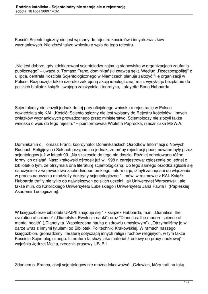 Rodzina katolicka - Scjentolodzy nie starają się o rejestrację