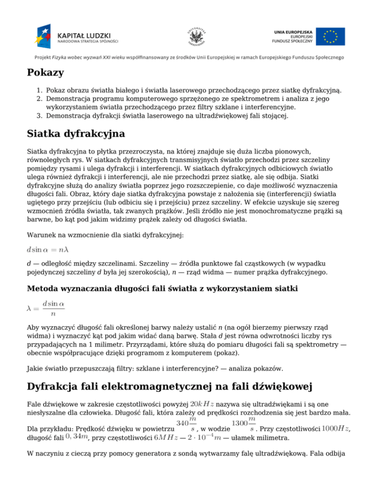 Pokazy 1. Pokaz obrazu światła białego i światła laserowego przechodzącego przez siatkę dyfrakcyjną. 2. Demonstracja programu komputerowego sprzężonego ze spektrometrem i analiza z jego wykorzystaniem światła przechodzącego przez filtry szklane i interferencyjne. 3. Demonstracja dyfrakcji światła laserowego na ultradźwiękowej fali stojącej. Siatka dyfrakcyjna Siatka dyfrakcyjna to płytka przezroczysta, na której znajduje się duża liczba pionowych, równoległych rys. W siatkach dyfrakcyjnych transmisyjnych światło przechodzi przez szczeliny pomiędzy rysami i ulega dyfrakcji i interferencji. W siatkach dyfrakcyjnych odbiciowych światło ulega również dyfrakcji i interferencji, ale nie przechodzi przez siatkę, ale się odbija. Siatki dyfrakcyjne służą do analizy światła poprzez jego rozszczepienie, co daje możliwość wyznaczenia długości fali. Obraz, który daje siatka dyfrakcyjna powstaje z nałożenia się (interferencji) światła ugiętego przy przejściu (lub odbiciu się i przejściu) przez szczeliny. W efekcie uzyskuje się szereg wzmocnień źródła światła, tak zwanych prążków. Jeśli źródło nie jest monochromatyczne prążki są barwne, bo kąt pod jakim widzimy prążek zależy od długości światła. Warunek na wzmocnienie dla siatki dyfrakcyjnej: d — odległość między szczelinami. Szczeliny — źródła punktowe fal cząstkowych (w wypadku pojedynczej szczeliny d była jej szerokością), n — rząd widma — numer prążka dyfrakcyjnego. Metoda wyznaczania długości fali światła z wykorzystaniem siatki Aby wyznaczyć długość fali określonej barwy należy ustalić n (na ogół bierzemy pierwszy rząd widma) i wyznaczyć kąt pod jakim widać daną barwę. Stała d jest równa odwrotności liczby rys przypadających na 1 milimetr. Przyrządami, które służą do pomiaru długości fali są spektrometry — obecnie współpracujące dzięki programom z komputerem (pokaz). Jakie światło przepuszczają filtry: szklane i interferencyjne? — analiza pokazów. Dyfrakcja fali elektromagnetycznej na fali dźwiękowej Fale dźwiękowe w zakresie częstotliwości powyżej nazywa się ultradźwiękami i są one niesłyszalne dla człowieka. Długość fali, która zależy od prędkości rozchodzenia się jest bardzo mała. Dla przykładu: Prędkość dźwięku w powietrzu długość fali , przy częstotliwości — , w wodzie . Przy częstotliwości — ułamek milimetra. W naczyniu z cieczą przy pomocy generatora z sondą wytwarzamy falę ultradźwiękową. Fala odbija , się od dna naczynia i w naczyniu powstaje fala stojąca. Odległość między węzłami tej fali jest równa długości fali (jest to fala podłużna a nie poprzeczna). W naczyniu z cieczą powstaje więc periodyczna struktura, która dla fali elektromagnetycznej staje się siatką dyfrakcyjną. Długość fali dźwięku równa stałej d tej swoistej siatki. Doświadczenie pozwala na wyznaczenie prędkości rozchodzenia się dźwięku w cieczy. Przez ciecz przepuszczamy światło laserowe o określonej długości fali. Na ekranie pojawiają się prążki dyfrakcyjne. Wyznaczamy kąt pod jakim widać określony prążek i wyznaczamy stałą siatki, czyli długość fali ultradźwiękowej. Mając długość i częstotliwość odczytaną z generatora — wyznaczamy prędkość rozchodzenia się dźwięku. Dyspersja i zdolność rozdzielcza siatek dyfrakcyjnych Kryterium rozdzielczości Rayleigh Obraz dyfrakcyjny otworu. Dwa otwory uważa się za rozróżnialne, jeśli pierwsze minimum dyfrakcyjne w obrazie jednego pokrywa się z centralnym maksimum drugiego otworu. Odległość kątowa dwóch obrazów: d — rozmiary otworu. Dyspersja kątowa siatki dyfrakcyjnej D (definicja) — odległość kątowa między dwoma liniami, których długości różnią się o . większa dyspersja dla małej d i dużego rzędu widma. Zdolność rozdzielcza R Stosunek średniej wartości dwóch linii do ich różnicy Siatka o większej zdolności rozdzielczej wytwarza wąskie linie i dlatego za jej pomocą można rozróżnić linie leżące blisko siebie. Siatka o większej dyspersji daje większe odległości kątowe miedzy liniami.