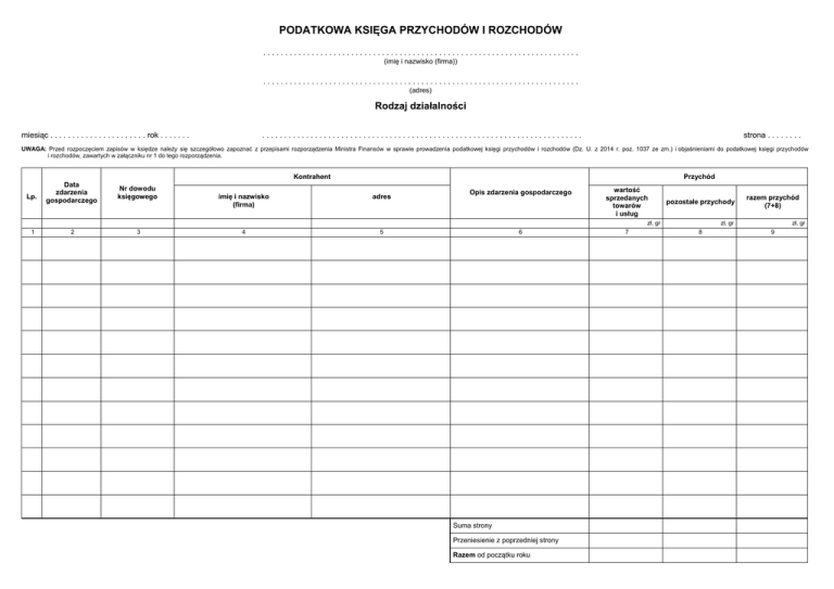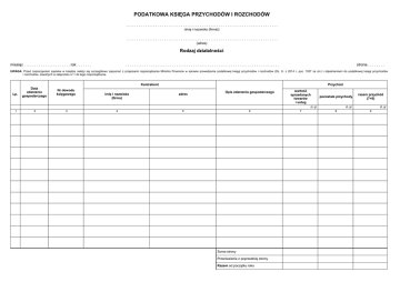 PODATKOWA KSIĘGA PRZYCHODÓW I ROZCHODÓW ........................................................................ (imię i nazwisko (firma)) ........................................................................ (adres) Rodzaj działalności miesiąc . . . . . . . . . . . . . . . . . . . . . . rok . . . . . . . ......................................................................... strona . . . . . . . . UWAGA: Przed rozpoczęciem zapisów w księdze należy się szczegółowo zapoznać z przepisami rozporządzenia Ministra Finansów w sprawie prowadzenia podatkowej księgi przychodów i rozchodów (Dz. U. z 2014 r. poz. 1037 ze zm.) i objaśnieniami do podatkowej księgi przychodów i rozchodów, zawartych w załączniku nr 1 do tego rozporządzenia. Kontrahent Lp. Data zdarzenia gospodarczego Nr dowodu księgowego 2 3 Przychód imię i nazwisko (firma) adres 4 5 Opis zdarzenia gospodarczego wartość sprzedanych towarów i usług pozostałe przychody zł, gr 1 6 Suma strony Przeniesienie z poprzedniej strony Razem od początku roku 7 razem przychód (7+8) zł, gr 8 zł, gr 9 miesiąc . . . . . . . . . . . . . . . . . . . . . . rok . . . . . . . Lp. Zakup towarów handlowych i materiałów wg cen zakupu Koszty działalności badawczo-rozwojowej, o których mowa w art. 26e ustawy o podatku dochodowym Wydatki (koszty) Koszty uboczne zakupu zł, gr 10 strona . . . . . . . . wynagrodzenia w gotówce i w naturze zł, gr 11 pozostałe wydatki zł, gr 12 zł, gr 13 Uwagi razem wydatki (12+13) opis kosztu zł, gr 14 wartość zł, gr zł, gr 15 16 17 miesiąc . . . . . . . . . . . . . . . . . . . . . . rok . . . . . . . strona . . . . . . . . Kontrahent Lp. Data zdarzenia gospodarczego Nr dowodu księgowego 2 3 Przychód imię i nazwisko (firma) adres 4 5 Opis zdarzenia gospodarczego wartość sprzedanych towarów i usług pozostałe przychody zł, gr 1 6 Suma strony Przeniesienie z poprzedniej strony Razem od początku roku 7 razem przychód (7+8) zł, gr 8 zł, gr 9 miesiąc . . . . . . . . . . . . . . . . . . . . . . rok . . . . . . . Lp. Zakup towarów handlowych i materiałów wg cen zakupu Koszty uboczne zakupu zł, gr 10 strona . . . . . . . . Koszty działalności badawczo-rozwojowej, o których mowa w art. 26e ustawy o podatku dochodowym Wydatki (koszty) wynagrodzenia w gotówce i w naturze zł, gr 11 pozostałe wydatki zł, gr 12 zł, gr 13 Uwagi razem wydatki (12+13) opis kosztu zł, gr 14 wartość zł, gr zł, gr 15 16 17 OBJAŚNIENIA DO PODATKOWEJ KSIĘGI PRZYCHODÓW I ROZCHODÓW 1. Przy dokonywaniu zapisów w księdze, wynikających z prowadzonych przez podatnika: a) ewidencji sprzedaży, b) ewidencji kupna i sprzedaży wartości dewizowych, c) ewidencji pożyczek i zastawionych rzeczy, d) ewidencji dla potrzeb podatku od towarów i usług – nie wypełnia się kolumn 3–5 księgi. 2. Kolumna 1 jest przeznaczona do wpisania kolejnego numeru zapisów do księgi. Tym samym numerem należy oznaczyć dowód stanowiący podstawę dokonania zapisu. 3. W kolumnie 2 należy wpisywać dzień miesiąca wynikający z dokumentu stanowiącego podstawę dokonywania wpisu (datę poniesienia wydatku, otrzymania towaru lub uzyskania przychodu albo datę zestawienia sprzedaży). 4. W kolumnie 3 należy wpisywać numer faktury lub innego dowodu. Jeżeli zapisów dokonuje się na podstawie dziennego zestawienia sprzedaży, należy wpisywać numer zestawienia faktur. 5. Kolumny 4 i 5 są przeznaczone do wpisywania imion i nazwisk (nazw firm) oraz adresów kontrahentów (dostawców lub odbiorców), z którymi zawarte zostały transakcje dotyczące zakupu surowców, materiałów, towarów itp. lub sprzedaży wyrobów gotowych (towarów), gdy transakcje te udokumentowane są fakturami i paragonami. Kolumn tych nie wypełnia się w wypadku zapisów dotyczących przychodu ze sprzedaży na podstawie dziennych zestawień sprzedaży oraz dowodów wewnętrznych. 6. W kolumnie 6 należy wpisać rodzaje przychodów lub wydatków. Określenie to powinno zwięźle oddawać istotę dokonanego zdarzenia gospodarczego, np. zakup blachy, zapłata za niklowanie obręczy, wypłata wynagrodzeń za okres ........... . 7. Kolumna 7 jest przeznaczona do wpisywania przychodów ze sprzedaży wyrobów (towarów handlowych) i sprzedaży usług. Podatnicy prowadzący działalność kantorową w kolumnie tej wpisują miesięczną kwotę przychodu (sprzedaży wartości dewizowych) wynikającą z ewidencji kupna i sprzedaży wartości dewizowych. W przypadku prowadzenia działalności polegającej na udzielaniu pożyczek pod zastaw (w lombardach) do kolumny 7 wpisuje się na koniec miesiąca kwotę prowizji stanowiącą wartość spłaconych w danym miesiącu odsetek lub różnicę między kwotą uzyskaną ze sprzedaży zastawionych rzeczy a kwotą udzielonych pożyczek. 8. Kolumna 8 jest przeznaczona do wpisywania pozostałych przychodów, np. przychodów z odpłatnego zbycia składników majątku, otrzymanych kar umownych, wynagrodzenia płatnika. 9. Kolumna 9 jest przeznaczona do wpisywania łącznej kwoty przychodów zewidencjonowanych w kolumnach 7 i 8. 10. Kolumna 10 jest przeznaczona do wpisywania zakupu materiałów oraz towarów handlowych według cen zakupu. Podatnicy prowadzący działalność kantorową w kolumnie tej wpisują miesięczną kwotę zakupionych wartości dewizowych, wynikającą z ewidencji kupna i sprzedaży wartości dewizowych. 11. Kolumna 11 jest przeznaczona do wpisywania kosztów ubocznych związanych z zakupem, np. kosztów dotyczących transportu, załadunku i wyładunku, ubezpieczenia w drodze. 12. Kolumna 12 jest przeznaczona do wpisywania wynagrodzeń brutto wypłacanych pracownikom (w gotówce i w naturze). Wynagrodzenia w naturze, jeżeli przedmiotem świadczeń w naturze są rzeczy lub usługi wchodzące w zakres działalności gospodarczej pracodawcy, wpisuje się według przeciętnych cen stosowanych wobec innych odbiorców, a w pozostałych przypadkach – na podstawie cen rynkowy