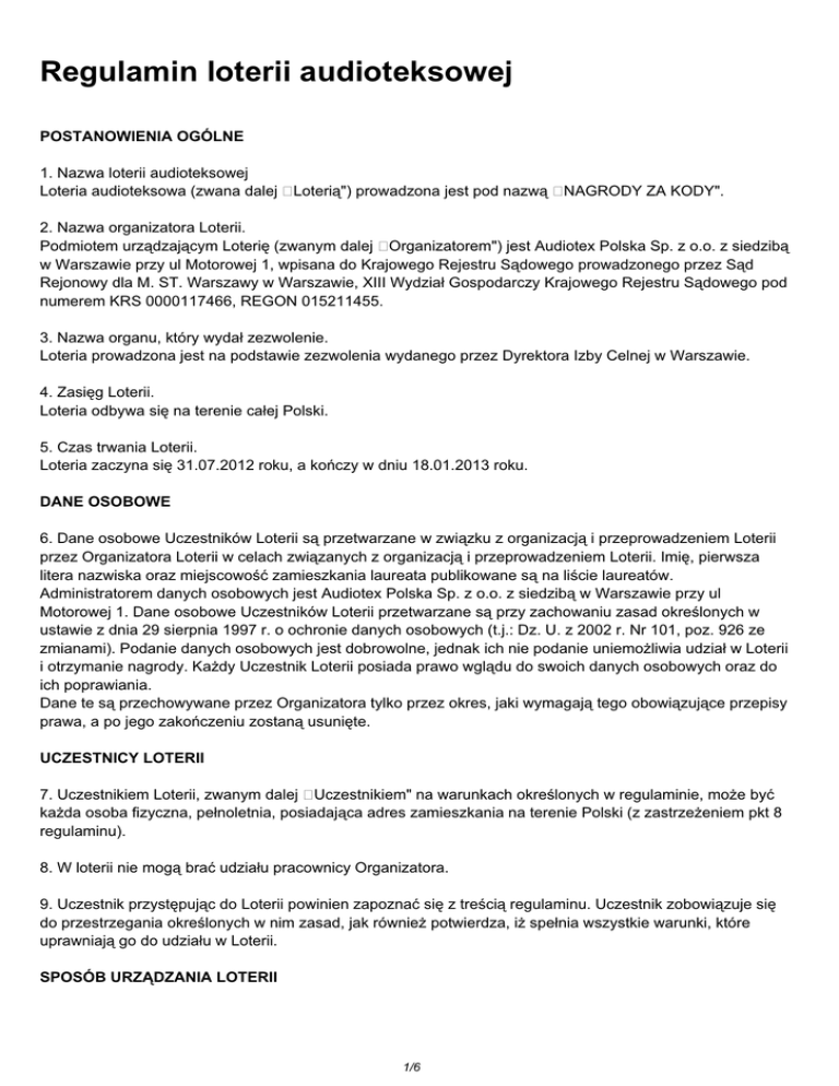 Regulamin loterii audioteksowej POSTANOWIENIA OGÓLNE 1. Nazwa loterii audioteksowej Loteria audioteksowa (zwana dalej Loterią") prowadzona jest pod nazwą NAGRODY ZA KODY". 2. Nazwa organizatora Loterii. Podmiotem urządzającym Loterię (zwanym dalej Organizatorem") jest Audiotex Polska Sp. z o.o. z siedzibą w Warszawie przy ul Motorowej 1, wpisana do Krajowego Rejestru Sądowego prowadzonego przez Sąd Rejonowy dla M. ST. Warszawy w Warszawie, XIII Wydział Gospodarczy Krajowego Rejestru Sądowego pod numerem KRS 0000117466, REGON 015211455. 3. Nazwa organu, który wydał zezwolenie. Loteria prowadzona jest na podstawie zezwolenia wydanego przez Dyrektora Izby Celnej w Warszawie. 4. Zasięg Loterii. Loteria odbywa się na terenie całej Polski. 5. Czas trwania Loterii. Loteria zaczyna się 31.07.2012 roku, a kończy w dniu 18.01.2013 roku. DANE OSOBOWE 6. Dane osobowe Uczestników Loterii są przetwarzane w związku z organizacją i przeprowadzeniem Loterii przez Organizatora Loterii w celach związanych z organizacją i przeprowadzeniem Loterii. Imię, pierwsza litera nazwiska oraz miejscowość zamieszkania laureata publikowane są na liście laureatów. Administratorem danych osobowych jest Audiotex Polska Sp. z o.o. z siedzibą w Warszawie przy ul Motorowej 1. Dane osobowe Uczestników Loterii przetwarzane są przy zachowaniu zasad określonych w ustawie z dnia 29 sierpnia 1997 r. o ochronie danych osobowych (t.j.: Dz. U. z 2002 r. Nr 101, poz. 926 ze zmianami). Podanie danych osobowych jest dobrowolne, jednak ich nie podanie uniemożliwia udział w Loterii i otrzymanie nagrody. Każdy Uczestnik Loterii posiada prawo wglądu do swoich danych osobowych oraz do ich poprawiania. Dane te są przechowywane przez Organizatora tylko przez okres, jaki wymagają tego obowiązujące przepisy prawa, a po jego zakończeniu zostaną usunięte. UCZESTNICY LOTERII 7. Uczestnikiem Loterii, zwanym dalej Uczestnikiem" na warunkach określonych w regulaminie, może być każda osoba fizyczna, pełnoletnia, posiadająca adres zamieszkania na terenie Polski (z zastrzeżeniem pkt 8 regulaminu). 8. W loterii nie mogą brać udziału pracownicy Organizatora. 9. Uczestnik przystępując do Loterii powinien zapoznać się z treścią regulaminu. Uczestnik zobowiązuje się do przestrzegania określonych w nim zasad, jak również potwierdza, iż spełnia wszystkie warunki, które uprawniają go do udziału w Loterii. SPOSÓB URZĄDZANIA LOTERII 1/6 10. Organizator przewidział w Loterii 1 200 000 unikalnych kodów, które są podzielone na trzy równe części, do których została przypisana możliwość brania udziału w losowaniu nagrody pieniężnej o wartości 5 000 zł, 3 000 zł oraz 1 000 zł. Nagrody pieniężne są przypisane do unikalnych kodów w następujący sposób: Pozycja nr 1 - 5 000 zł; Pozycja nr 2 - 3 000 zł; Pozycja nr 3 - 1 000 zł; Pozycja nr 4 - 5 000 zł; Pozycja nr 5 - 3 000 zł; Pozycja nr 6 - 1 000 zł; .......................................... Pozycja nr 1 199 998 - 5 000 zł; Pozycja nr 1 199 999 - 3 000 zł; Pozycja nr 1 200 000 - 1 000 zł; Dodatkowo do 99 unikalnych kodów (spośród 1 200 000) są przypisane nagrody gwarantowane, które dodatkowo podzielone są na trzy różne kolorowe pola tj. czerwony, zielony, niebieski (wykaz zwycięskich unikalnych kodów wraz z nagrodami stanowi załącznik nr 1 do regulaminu). 11. Aby wziąć udział w Loterii należy w dniach 31.07.2012 r. od godz. 00:00 - 30.09.2012 r. do godz. 23:59 wysłać SMS-a na numer 7265 (koszt SMS 2 zł netto/2,46 zł z VAT) o treści: X.czerwony, gdzie X oznacza PREFIKS, natomiast czerwony" oznacza, iż Uczestnik dokonał wyboru iż chce zagrać o nagrody znajdujące się w polu oznaczonym na czerwono od nr 1 do nr 33; X.zielony, gdzie X oznacza PREFIKS, natomiast zielony" oznacza, iż Uczestnik dokonał wyboru iż chce zagrać o nagrody znajdujące się w polu oznaczonym na zielono od nr 34 do nr 66; X.niebieski, gdzie X oznacza PREFIKS, natomiast niebieski" oznacza, iż Uczestnik dokonał wyboru iż chce zagrać o nagrody znajdujące się w polu oznaczonym na niebiesko od nr 67 do nr 99; Wykaz prefiksów stanowi załącznik nr 2 do regulaminu. Do każdego przychodzącego SMS-a zgłoszeniowego, Organizator przypisze losowo unikalny kod. W odpowiedzi Uczestnik otrzyma SMS-a z unikalnym kodem oraz informacją, gdzie (tj. na stronie www.audiotex.pl lub w prasie określonej w załączniku nr 2) powinien sprawdzić przypisany mu unikalny kod, czy jest zwycięski, czy też nie. Dodatkowo Uczestnik otrzyma informację w losowaniu której nagrody pieniężnej weźmie udział jego unikalny kod. SMS zawierał też będzie informację o tym kto jest Organizatorem Loterii, na jakiej stronie internetowej znajduje się regulamin, że w Loterii mogą brać udział tylko osoby pełnoletnie oraz podany zostanie koszt SMS-a. 12. Organizator zastrzega sobie możliwość wysłania do Uczestnika kolejnego SMS-a z informacją o wygranej nagrodzie gwarantowanej lub o jej braku. Organizator zastrzega sobie możliwość zadawania pytań dodatkowych mających na celu sprecyzowanie formy odbioru nagrody pieniężnej. SMS-a z odpowiedzią Uczestnik powinien przesłać na numer 7265 (koszt SMS 2 zł netto / 2,46 zł z VAT). Uczestnik nie musi odpowiadać na zadane pytania dodatkowe. W odpowiedzi na przesłany przez Uczestnika SMS, otrzyma on jeden dodatkowy unikalny kod. Uczestnik otrzyma maksymalnie jeden taki SMS w ciągu dnia. 13. Każdy Uczestnik po otrzymaniu unikalnego kodu powinien sprawdzić na stronie internetowej www.audiotex.pl lub prasie (określonej w załączniku nr 2), czy do jego unikalnego kodu przypisana jest nagroda gwarantowana. 14. Jeśli okaże się, że do otrzymanego unikalnego kodu przypisana jest nagroda gwarantowana, Uczestnik musi do dnia 02.10.2012 r. dokonać zgłoszenia swojej wygranej telefonicznie ((22) 516 35 44 - opłata według stawki operatora), od poniedziałku do piątku w godzinach 9.00