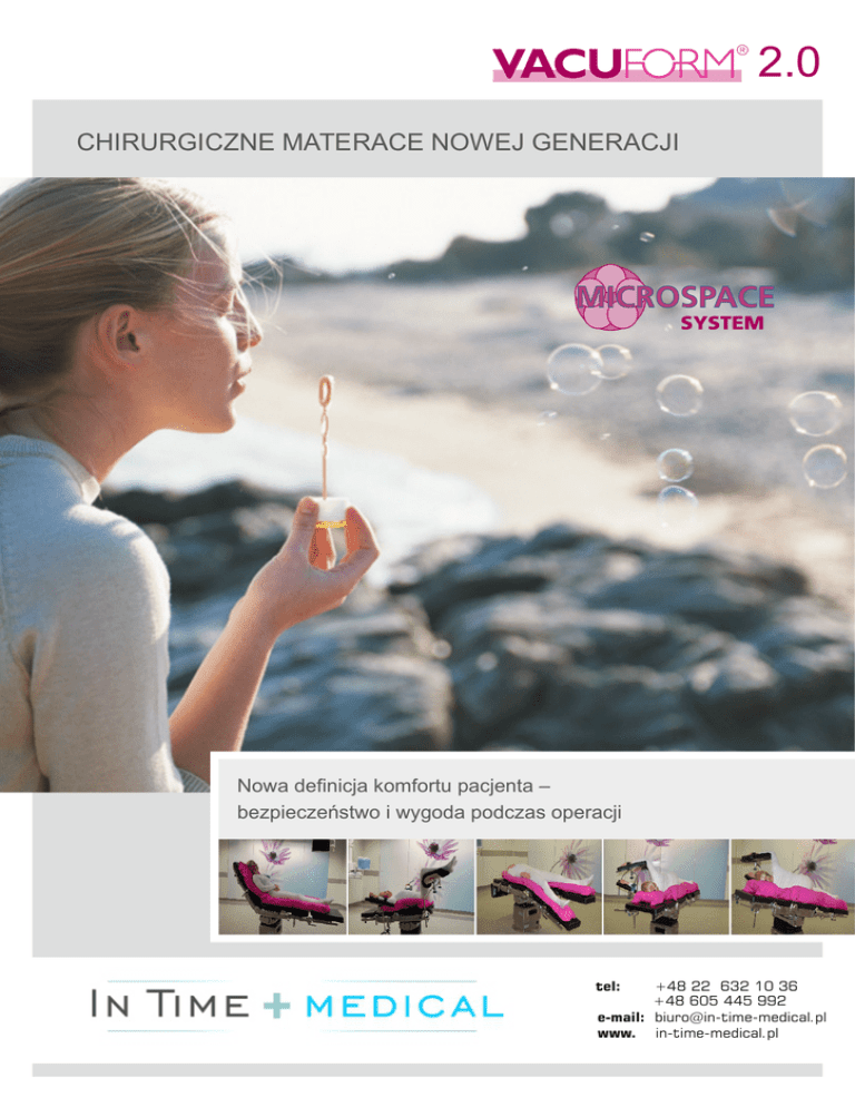 2.0 CHIRURGICZNE MATERACE NOWEJ GENERACJI Nowa definicja komfortu pacjenta – bezpieczeństwo i wygoda podczas operacji tel: +48 22 632 10 36 +48 605 445 992 e-mail: [email protected] www. in-time-medical.pl 2.0 UDOSKONALONA FORMUŁA MATERACY VACUFORM Materace Vacuform ® 2.0 znacznie zwiększają efektywność pracy dzięki szybkiej i prostej obsłudze, profilaktyce niepożądanych następstw - takich jak odleżyny czy niedowład. Redukują koszty związane z dodatkowymi materiałami, są łatwe w użyciu przy jednoczesnej gwarancji długiego czasu eksploatacji nawet przy ciągłym użytkowaniu. § § § § § § Profilaktyka niepożądanych następstw Oszczędność na dodatkowych materiałach Długi czas eksploatacji Zastosowanie przy różnego typu operacjach Możliwość oświetlenia śródoperacyjnego Łatwość czyszczenia i przechowywania Technologia VACUFORM 2.0 jest w 100% przepuszczalna dla promieni rentgenowskich, a także MRI i CT. Materac VACUFORM 2.0 wyposażony jest w zawór z tworzywa sztucznego – intuicyjnie łatwy w obsłudze. Dzięki zastosowaniu nowych materiałów oraz technologii zapewnia możliwie najwyższy komfort zarówno dla pacjenta jak i lekarza. Materac VACUFORM 2.0 zostały stworzone z delikatnej, poliuretanowej folii. Dolna część materaca tworzy niezwykle odporną, antypoślizgową powierzchnię. Natomiast górna część jest wyjątkowo miękka, elastyczna a jednocześnie całkowicie stabilna. VACUFORM 2.0 nie zawiera: § § § Innowacyjny system MicroSpace lateksu PCV środków zmiękczających STANDARD JAKOŚCI I BEZPIECZEŃSTWA 2.0 Partie ciała narażone na odleżyny Przykład bezpiecznej pozycji pacjenta z wykorzystaniem materaca VACUFORM ® 2.0 : § § § § § § § § Pozycja boczna Pozycja pół-boczna Pozycja leżąca (na wznak) Pozycja siedząca / pół-siedząca Pozycja przekręcona Pozycja litotomiczna Pozycja laparoskopowa Pozycja umożliwiająca transport miedzy klinikami Bezpieczeństwo na stole operacyjnym Materace VACUFORM ® 2.0 gwarantują pewne unieruchomienie pacjenta w ustalonym przez lekarza położeniu podczas operacji. Pozwalają na optymalny dostęp do obszaru pracy oraz bezpieczne obchodzenie się z pacjentem podczas zabiegu. Nawet przy najbardziej ekstremalnym odchyleniu stołu chirurgicznego zapewniają niezmienną pozycję ciała. W każdej chwili poprzez zwolnienie próżni istnieje możliwość skorygowania pozycji oraz dopasowanie do nowego ułożenia. Materace VACUFORM ® 2.0 umożliwiają transport pacjenta między klinikami w pożądanej pozycji operacyjnej. § § § § Bezpieczna antypoślizgowa powierzchnia na stole operacyjnym Bezpieczne unieruchomienie ciała pacjenta Pozwala na maksymalne odchylenie stołu operacyjnego Niezwykle szybki i łatwy w obsłudze SPRAWDZONE PODCZAS TYSIĄCA ZABIEGÓW 2.0 Kaptur operacyjny Vacuform ® 2.0 Specjalnie zaprojektowany kaptur Vacuform ® 2.0 obejmuje całą głowę pacjenta i doskonale się do niej dopasowuje. Po lewej stronie na zewnątrz kaptura znajduje się zawór do spuszczania powietrza. Po prawej na zewnątrz umieszczono otwór pozwalający na dodanie lub usuwanie kulek styropianowych, dzięki którym uzsykuje się idealne dopasowanie. Przezierny dla promieniowanii rentgenowskich kaptur powala na użytkowanie podczas tomografii komputerowej, angiografii itp. Kaptur operacyjny Vacuform® 2.0 mały # 34 64 700 Kaptur operacyjny Vacuform® 2.0 duży # 34 64 701 Krótkie materace chirurgiczne Vacuform® 2.0 100 100 Vacuform® 2.0 Vacuform® 2.0 krótki materac operacyjny 100 x 100 cm # 34 66 005 Vacuform® 2.0 krótki materac operacyjny 75 x 125 cm # 34 65 205 105cm 125 100 Vacuform® 2.0 krótki materac operacyjny 75 x 100 cm # 34 65 005 Vacuform® 2.0 krótki materac operacyjny z nacięciem · 75 x 100 cm # 34 65 105 · 75 x 125 cm # 34 65 305 · 100 x 100 cm # 34 66 006 Vacuform® 2.0 krótki materac z nacięciem do operacji stawu biodrowego w pozycji bocznej 95/80 x 105 cm # 34 66 007 Poduszki chirurgiczne Vacuform® 2.0 60 40 30 30 Vacuform® 2.0 poduszka operacyjna 60 x 80 cm # 34 64 005 Vacuform® 2.0 poduszka operacyjna 40 x 70 cm # 34 63 005 Vacuform® 2.0 poduszka operacyjna 30 x 70 cm # 34 62 005 35 40 70 70 80 40 Vacuform® 2.0 poduszka operacyjna 30 x 40 cm # 34 61 005 Vacuform® 2.0 poduszka operacyjna do zabezpieczenia szyi 40 x 35 cm # 34 67 005 2.0 SZEROKI WYBÓR SZEROKI WYBÓR MATERACY CHIRURGICZNYCH VACUFORM 2.0 : Linia produktów VACUFORM 2.0 oferuje materace chirurgiczne, które spełniają wszystkie wymagania interwencji chirurgicznych ze specjalnym pozycjonowaniem. Nowa, rozszerzona linia produktów VACUFORM 2.0 obejmuje materace chirurgiczne dla pacjentów otyłych i materace próżniowe jako alternatywę dla łóżek gipsowych i nie tylko. 100 cm 50 cm 25 cm 12,5 cm 95 cm 145,5 cm 12,5 Vacuform® 2.0 uniwersalny materac 75 x 200 cm # 34 66 105 Vacuform® 2.0 uniwersalny materac 65 x 200 cm # 34 66 205 Vacuform® 2.0 uniwersalny materac 100 x 200 cm # 34 66 104 Vacuform® 2.0 dzielony materac operacyjny 75 x 200 cm # 34 66 505 Vacuform® 2.0 materac chirurgiczny dzielony z wycięciem 75 x 200 cm # 34 66 610 Vacuform® 2.0 do operacji ramienia 75 x 200 cm # 34 66 605 wraz z poduszką 35 x 30 cm # 34 66 605-k Vacuform® 2.0 materac do pozycjonowania bocznego 95/70 x 212 cm # 34 66 305 Vacuform® 2.0 materac do chirurgii ramienia 75 x 200 cm # 34 66 405 2.0 tel: +48 22 632 10 36 +48 605 445 992 e-mail: [email protected] www. in-time-medical.pl