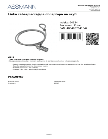 Assmann Distribution Sp. z o.o. ul. Szczecińska 17-21 54-517 Wrocław tel: 071 / 326 71 40 http://assmann.pl Linka zabezpieczająca do laptopa na szyfr Indeks: 64134 Producent: Ednet EAN: 4054007641342 4 0 5 4 0 0 7 6 4 1 3 4 2 OPIS Linka zabezpieczająca do laptopa na szyfr; Zabezpieczenie notebooka z zamkiem szyfrowym, do standardowych gniazd zabezpieczających; Dogodne podłączenie do dowolnego laptopa lub komputera stacjonarnego wyposażonych w slot bezpieczeństwa; Dowolne ustawianie szyfru, nie wymaga kluczy; Materiał: cynkowana stal (zamek); Stalowa 1.5m linka z wytrzymałym zamkiem; PARAMETRY Przeznaczenie: Producent: zabezpieczenie EDNET Strona 1/1 Powered by TCPDF (www.tcpdf.org)