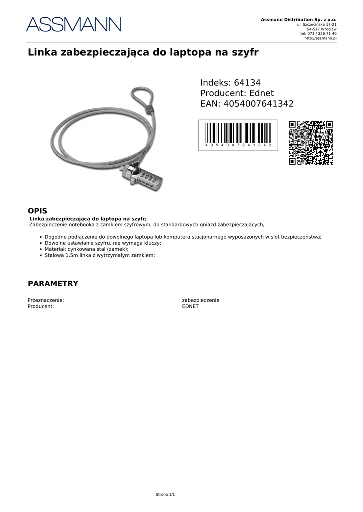 Karta produktu: Linka zabezpieczająca do laptopa na szyfr