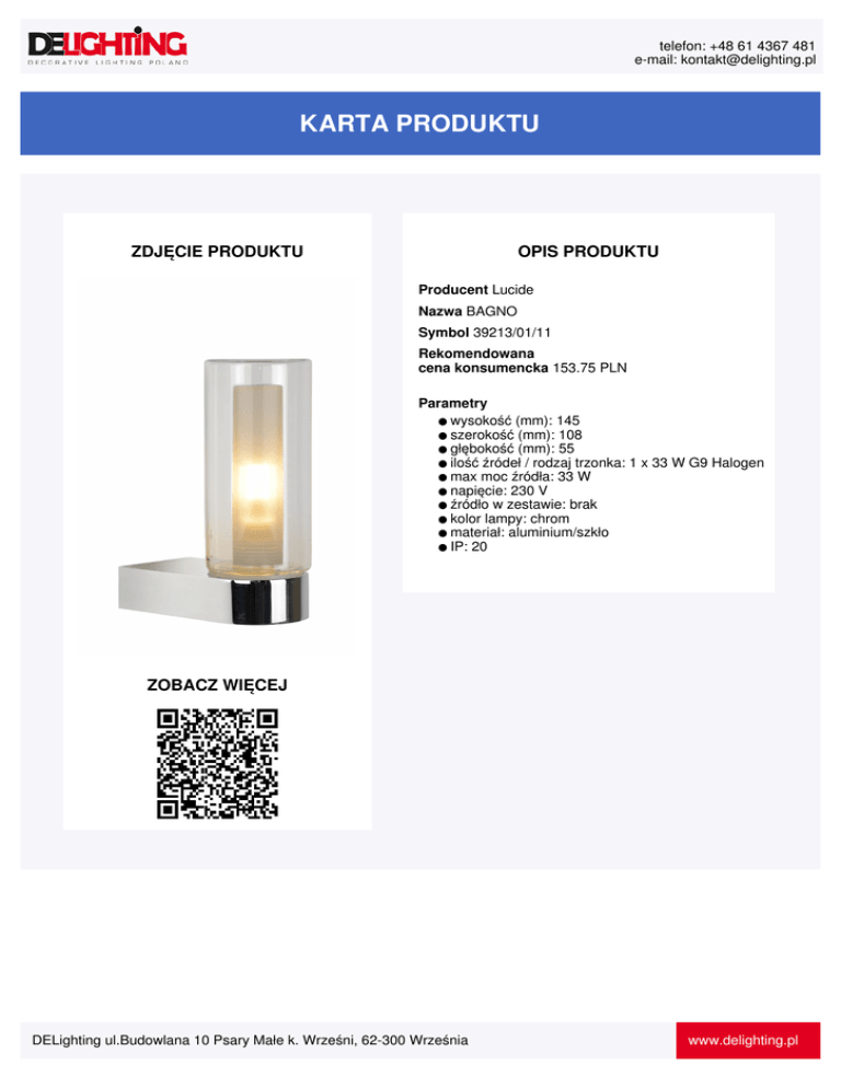 telefon: +48 61 4367 481 e-mail: [email protected] KARTA PRODUKTU ZDJĘCIE PRODUKTU OPIS PRODUKTU Producent Lucide Nazwa BAGNO Symbol 39213/01/11 Rekomendowana cena konsumencka 153.75 PLN Parametry ● wysokość (mm): 145 ● szerokość (mm): 108 ● głębokość (mm): 55 ● ilość źródeł / rodzaj trzonka: 1 x 33 W G9 Halogen ● max moc źródła: 33 W ● napięcie: 230 V ● źródło w zestawie: brak ● kolor lampy: chrom ● materiał: aluminium/szkło ● IP: 20 ZOBACZ WIĘCEJ DELighting ul.Budowlana 10 Psary Małe k. Wrześni, 62-300 Września www.delighting.pl