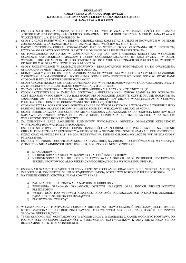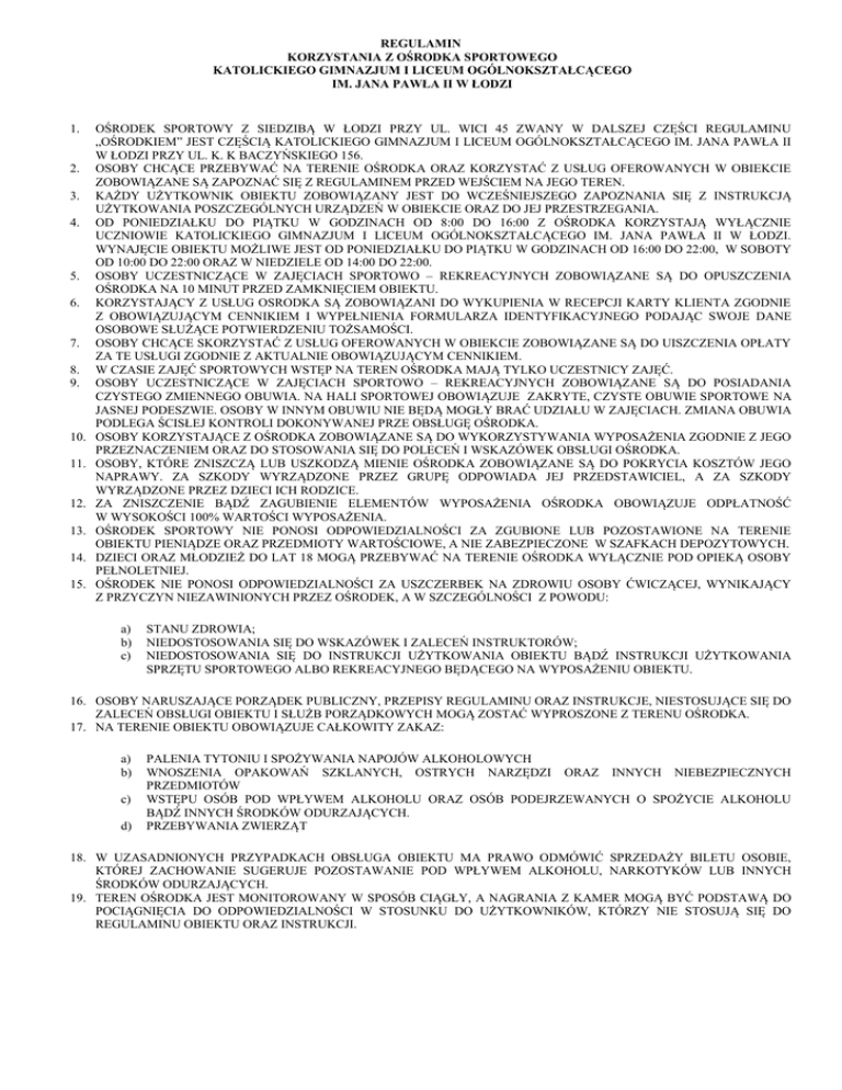 REGULAMIN KORZYSTANIA Z OŚRODKA SPORTOWEGO KATOLICKIEGO GIMNAZJUM I LICEUM OGÓLNOKSZTAŁCĄCEGO IM. JANA PAWŁA II W ŁODZI 1. 2. 3. 4. 5. 6. 7. 8. 9. 10. 11. 12. 13. 14. 15. OŚRODEK SPORTOWY Z SIEDZIBĄ W ŁODZI PRZY UL. WICI 45 ZWANY W DALSZEJ CZĘŚCI REGULAMINU „OŚRODKIEM” JEST CZĘŚCIĄ KATOLICKIEGO GIMNAZJUM I LICEUM OGÓLNOKSZTAŁCĄCEGO IM. JANA PAWŁA II W ŁODZI PRZY UL. K. K BACZYŃSKIEGO 156. OSOBY CHCĄCE PRZEBYWAĆ NA TERENIE OŚRODKA ORAZ KORZYSTAĆ Z USŁUG OFEROWANYCH W OBIEKCIE ZOBOWIĄZANE SĄ ZAPOZNAĆ SIĘ Z REGULAMINEM PRZED WEJŚCIEM NA JEGO TEREN. KAŻDY UŻYTKOWNIK OBIEKTU ZOBOWIĄZANY JEST DO WCZEŚNIEJSZEGO ZAPOZNANIA SIĘ Z INSTRUKCJĄ UŻYTKOWANIA POSZCZEGÓLNYCH URZĄDZEŃ W OBIEKCIE ORAZ DO JEJ PRZESTRZEGANIA. OD PONIEDZIAŁKU DO PIĄTKU W GODZINACH OD 8:00 DO 16:00 Z OŚRODKA KORZYSTAJĄ WYŁĄCZNIE UCZNIOWIE KATOLICKIEGO GIMNAZJUM I LICEUM OGÓLNOKSZTAŁCĄCEGO IM. JANA PAWŁA II W ŁODZI. WYNAJĘCIE OBIEKTU MOŻLIWE JEST OD PONIEDZIAŁKU DO PIĄTKU W GODZINACH OD 16:00 DO 22:00, W SOBOTY OD 10:00 DO 22:00 ORAZ W NIEDZIELE OD 14:00 DO 22:00. OSOBY UCZESTNICZĄCE W ZAJĘCIACH SPORTOWO – REKREACYJNYCH ZOBOWIĄZANE SĄ DO OPUSZCZENIA OŚRODKA NA 10 MINUT PRZED ZAMKNIĘCIEM OBIEKTU. KORZYSTAJĄCY Z USŁUG OSRODKA SĄ ZOBOWIĄZANI DO WYKUPIENIA W RECEPCJI KARTY KLIENTA ZGODNIE Z OBOWIĄZUJĄCYM CENNIKIEM I WYPEŁNIENIA FORMULARZA IDENTYFIKACYJNEGO PODAJĄC SWOJE DANE OSOBOWE SŁUŻĄCE POTWIERDZENIU TOŻSAMOŚCI. OSOBY CHCĄCE SKORZYSTAĆ Z USŁUG OFEROWANYCH W OBIEKCIE ZOBOWIĄZANE SĄ DO UISZCZENIA OPŁATY ZA TE USŁUGI ZGODNIE Z AKTUALNIE OBOWIĄZUJĄCYM CENNIKIEM. W CZASIE ZAJĘĆ SPORTOWYCH WSTĘP NA TEREN OŚRODKA MAJĄ TYLKO UCZESTNICY ZAJĘĆ. OSOBY UCZESTNICZĄCE W ZAJĘCIACH SPORTOWO – REKREACYJNYCH ZOBOWIĄZANE SĄ DO POSIADANIA CZYSTEGO ZMIENNEGO OBUWIA. NA HALI SPORTOWEJ OBOWIĄZUJE ZAKRYTE, CZYSTE OBUWIE SPORTOWE NA JASNEJ PODESZWIE. OSOBY W INNYM OBUWIU NIE BĘDĄ MOGŁY BRAĆ UDZIAŁU W ZAJĘCIACH. ZMIANA OBUWIA PODLEGA ŚCISŁEJ KONTROLI DOKONYWANEJ PRZE OBSŁUGĘ OŚRODKA. OSOBY KORZYSTAJĄCE Z OŚRODKA ZOBOWIĄZANE SĄ DO WYKORZYSTYWANIA WYPOSAŻENIA ZGODNIE Z JEGO PRZEZNACZENIEM ORAZ DO STOSOWANIA SIĘ DO POLECEŃ I WSKAZÓWEK OBSŁUGI OŚRODKA. OSOBY, KTÓRE ZNISZCZĄ LUB USZKODZĄ MIENIE OŚRODKA ZOBOWIĄZANE SĄ DO POKRYCIA KOSZTÓW JEGO NAPRAWY. ZA SZKODY WYRZĄDZONE PRZEZ GRUPĘ ODPOWIADA JEJ PRZEDSTAWICIEL, A ZA SZKODY WYRZĄDZONE PRZEZ DZIECI ICH RODZICE. ZA ZNISZCZENIE BĄDŹ ZAGUBIENIE ELEMENTÓW WYPOSAŻENIA OŚRODKA OBOWIĄZUJE ODPŁATNOŚĆ W WYSOKOŚCI 100% WARTOŚCI WYPOSAŻENIA. OŚRODEK SPORTOWY NIE PONOSI ODPOWIEDZIALNOŚCI ZA ZGUBIONE LUB POZOSTAWIONE NA TERENIE OBIEKTU PIENIĄDZE ORAZ PRZEDMIOTY WARTOŚCIOWE, A NIE ZABEZPIECZONE W SZAFKACH DEPOZYTOWYCH. DZIECI ORAZ MŁODZIEŻ DO LAT 18 MOGĄ PRZEBYWAĆ NA TERENIE OŚRODKA WYŁĄCZNIE POD OPIEKĄ OSOBY PEŁNOLETNIEJ. OŚRODEK NIE PONOSI ODPOWIEDZIALNOŚCI ZA USZCZERBEK NA ZDROWIU OSOBY ĆWICZĄCEJ, WYNIKAJĄCY Z PRZYCZYN NIEZAWINIONYCH PRZEZ OŚRODEK, A W SZCZEGÓLNOŚCI Z POWODU: a) b) c) STANU ZDROWIA; NIEDOSTOSOWANIA SIĘ DO WSKAZÓWEK I ZALECEŃ INSTRUKTORÓW; NIEDOSTOSOWANIA SIĘ DO INSTRUKCJI UŻYTKOWANIA OBIEKTU BĄDŹ INSTRUKCJI UŻYTKOWANIA SPRZĘTU SPORTOWEGO ALBO REKREACYJNEGO BĘDĄCEGO NA WYPOSAŻENIU OBIEKTU. 16. OSOBY NARUSZAJĄCE PORZĄDEK PUBLICZNY, PRZEPISY REGULAMINU ORAZ INSTRUKCJE, NIESTOSUJĄCE SIĘ DO ZALECEŃ OBSŁUGI OBIEKTU I SŁUŻB PORZĄDKOWYCH MOGĄ ZOSTAĆ WYPROSZONE Z TERENU OŚRODKA. 17. NA TERENIE OBIEKTU OBOWIĄZUJE CAŁKOWITY ZAKAZ: a) b) c) d) PALENIA TYTONIU I SPOŻYWANIA NAPOJÓW ALKOHOLOWYCH WNOSZENIA OPAKOWAŃ SZKLANYCH, OSTRYCH NARZĘDZI ORAZ INNYCH NIEBEZPIECZNYCH PRZEDMIOTÓW WSTĘPU OSÓB POD WPŁYWEM ALKOHOLU ORAZ OSÓB PODEJRZEWANYCH O SPOŻYCIE ALKOHOLU BĄDŹ INNYCH ŚRODKÓW ODURZAJĄCYCH. PRZEBYWANIA ZWIERZĄT 18. W UZASADNIONYCH PRZYPADKACH OBSŁUGA OBIEKTU MA PRAWO ODMÓWIĆ SPRZEDAŻY BILETU OSOBIE, KTÓREJ ZACHOWANIE SUGERUJE POZOSTAWANIE POD WPŁYWEM ALKOHOLU, NARKOTYKÓW LUB INNYCH ŚRODKÓW ODURZAJĄCYCH. 19. TEREN OŚRODKA JEST MONITOROWANY W SPOSÓB CIĄGŁY, A NAGRANIA Z KAMER MOGĄ BYĆ PODSTAWĄ DO POCIĄGNIĘCIA DO ODPOWIEDZIALNOŚCI W STOSUNKU DO UŻYTKOWNIKÓW, KTÓRZY NIE STOSUJĄ SIĘ DO REGULAMINU OBIEKTU ORAZ INSTRUKCJI.