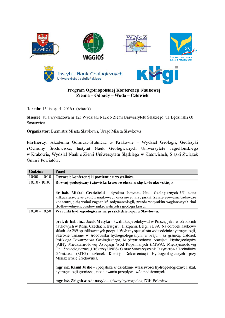 Program Ogólnopolskiej Konferencji Naukowej Ziemia – Odpady – Woda – Człowiek Termin: 15 listopada 2016 r. (wtorek) Miejsce: aula wykładowa nr 123 Wydziału Nauk o Ziemi Uniwersytetu Śląskiego, ul. Będzińska 60 Sosnowiec Organizator: Burmistrz Miasta Sławkowa, Urząd Miasta Sławkowa Partnerzy: Akademia Górniczo-Hutnicza w Krakowie – Wydział Geologii, Geofizyki i Ochrony Środowiska, Instytut Nauk Geologicznych Uniwersytetu Jagiellońskiego w Krakowie, Wydział Nauk o Ziemi Uniwersytetu Śląskiego w Katowicach, Śląski Związek Gmin i Powiatów. Godzina 10:00 – 10:10 10:10 - 10:30 Panel Otwarcie konferencji i powitanie uczestników. Rozwój geologiczny i zjawiska krasowe obszaru śląsko-krakowskiego. 10:30 – 10:50 dr hab. Michał Gradziński - dyrektor Instytutu Nauk Geologicznych UJ, autor kilkudziesięciu artykułów naukowych oraz inwentarzy jaskiń. Zainteresowania badawcze koncentrują się wokół zagadnień sedymentologii, przede wszystkim węglanowych skał słodkowodnych, osadów mikrobialnych i geologii krasu. Warunki hydrogeologiczne na przykładzie rejonu Sławkowa. prof. dr hab. inż. Jacek Motyka - kwalifikacje zdobywał w Polsce, jak i w ośrodkach naukowych w Rosji, Czechach, Bułgarii, Hiszpanii, Belgii i USA. Na dorobek naukowy składa się 269 opublikowanych pozycji. Wybitny specjalista w dziedzinie hydrogeologii, Szerokie uznanie w środowisku hydrogeologicznym w kraju i za granicą. Członek Polskiego Towarzystwa Geologicznego, Międzynarodowej Asocjacji Hydrogeologów (AIH), Międzynarodowej Asocjacji Wód Kopalnianych (IMWA), Międzynarodowej Unii Speleologicznej (UIS) przy UNESCO oraz Stowarzyszenia Inżynierów i Techników Górnictwa (SITG), członek Komisji Dokumentacji Hydrogeologicznych przy Ministerstwie Środowiska. mgr inż. Kamil Juśko – specjalista w dziedzinie właściwości hydrogeologicznych skał, hydrogeologii górniczej, modelowania przepływu wód podziemnych. mgr inż. Zbigniew Adamczyk – główny hydrogeolog ZGH Bolesław. Godzina 10:50 – 11:10 11:10 - 11:30 11:30 - 11:50 11:50 – 12:10 12:10 – 12:30 12:30 – 12:50 12:50 – 13:10 13:10 – 13:30 Panel Wpływ składowisk odpadów komunalnych na wody powierzchniowe i podziemne. Studium przypadku – składowisko Barycz. dr hab. inż. Kajetan d’Obyrn - prof. nadzw. w Katedrze Hydrogeologii i Geologii Inżynierskiej AGH, były Prezes Kopalni Soli w Wieliczce. Autor licznych publikacji naukowych z hydrogeologii górniczej, geomechaniki, zabezpieczenia wyrobisk, gospodarki odpadami, oraz ocen oddziaływania na środowisko. Monitoring składowisk odpadów komunalnych w Polsce - wymagania prawne, a rzeczywistość. dr hab. Andrzej Witkowski, prof. UŚ - kierownik Katedry Hydrogeologii, Wydziału Nauk o Ziemi Uniwersytetu Śląskiego, Prezes Zarządu Stowarzyszenia Hydrogeologow Polskich (SHP), Przewodniczący Polskiego Komitetu Narodowego Międzynarodowej Asocjacji Hydrogeologów (IAH), autor i współautor 124 publikacji z zakresu hydrogeologii i ochrony wód podziemnych. Przerwa kawowa Szkodliwość metali ciężkich i innych zanieczyszczeń w środowisku wodnym. Metody oczyszczania i uzdatniania wód. dr hab. inż. Adam Postawa - kierownik Katedry Hydrogeologii i Geologii Inżynierskiej. Zainteresowania naukowe obejmują hydrogeologię górniczą i obszarów krasowych, hydrogeochemię i zagadnienia metodyczne związane z badaniem jakości wód. Specjalizuje się w problematyce występowania matali i metaloidów w wodach przeznaczonych do spożycia przez ludzi. Jest autorem lub współautorem ponad 70 artykułów naukowych i monografii oraz licznych opracowań niepublikowanych. Wymagania wody pitnej przeznaczonej do spożycia przez ludzi. mgr Karolina Ratman – kierownik sekcji Higieny Komunalnej i Środowiska w Państwowym Powiatowym Inspektoracie Sanitarnym w Dąbrowie Górniczej Nielegalne składowiska odpadów w kontekście procedur administracyjnych – studium przypadku. mgr Rafał Adamczyk – Burmistrz Miasta Sławkowa, samorządowiec, studia doktoranckie na kierunku ekonomii Katedra Badań Strategicznych i Regionalnych Uniwersytetu Ekonomicznego w Katowicach, specjalista w zakresie pozyskania funduszy unijnych. Członek Polskiego Stowarzyszenia Ekspertów i Asesorów Funduszy Unii Europejskiej. Założyciel Stowarzyszenia na Rzecz Wspierania Rozwoju Miasta Sławków. Dyskusja Lunch Potwierdzenie uczestnictwa w spotkaniu proszę kierować na adres e-mail [email protected] w terminie do 14.11.2016 (poniedziałek). O udziale w konferencji będzie decydować kolejność zgłoszeń. Uprzejmie informuję, że osobą odpowiedzialną w zakresie organizacyjnym jest p. Maksym Pięta, kierownik Referatu Ochrony Środowiska i Gospodarki Wodnej Urzędu Miasta w Sławkowie (tel. 32 29 31 552, 798 985 807). Dla zainteresowanych będą wystawiane potwierdzenia udziału w konferencji.
