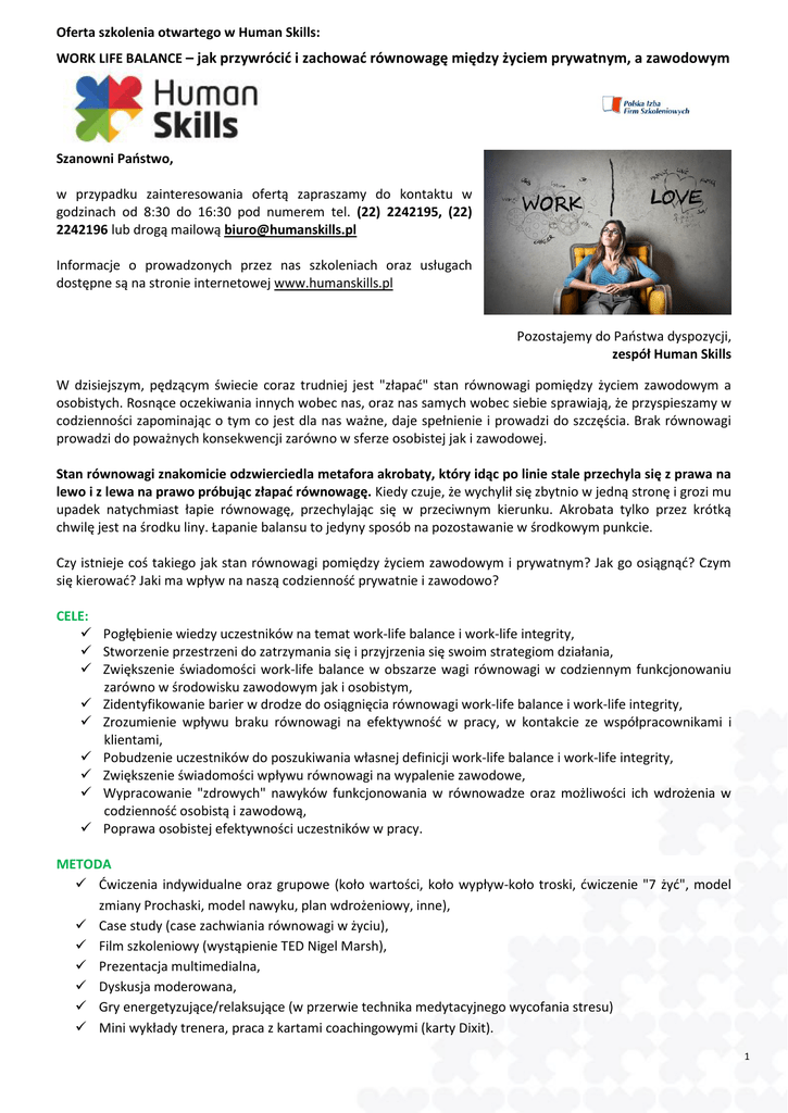 Oferta szkolenia otwartego w Human Skills: WORK LIFE BALANCE – jak przywrócić i zachować równowagę między życiem prywatnym, a zawodowym Szanowni Państwo, w przypadku zainteresowania ofertą zapraszamy do kontaktu w godzinach od 8:30 do 16:30 pod numerem tel. (22) 2242195, (22) 2242196 lub drogą mailową [email protected] Informacje o prowadzonych przez nas szkoleniach oraz usługach dostępne są na stronie internetowej www.humanskills.pl Pozostajemy do Państwa dyspozycji, zespół Human Skills W dzisiejszym, pędzącym świecie coraz trudniej jest "złapać" stan równowagi pomiędzy życiem zawodowym a osobistych. Rosnące oczekiwania innych wobec nas, oraz nas samych wobec siebie sprawiają, że przyspieszamy w codzienności zapominając o tym co jest dla nas ważne, daje spełnienie i prowadzi do szczęścia. Brak równowagi prowadzi do poważnych konsekwencji zarówno w sferze osobistej jak i zawodowej. Stan równowagi znakomicie odzwierciedla metafora akrobaty, który idąc po linie stale przechyla się z prawa na lewo i z lewa na prawo próbując złapać równowagę. Kiedy czuje, że wychylił się zbytnio w jedną stronę i grozi mu upadek natychmiast łapie równowagę, przechylając się w przeciwnym kierunku. Akrobata tylko przez krótką chwilę jest na środku liny. Łapanie balansu to jedyny sposób na pozostawanie w środkowym punkcie. Czy istnieje coś takiego jak stan równowagi pomiędzy życiem zawodowym i prywatnym? Jak go osiągnąć? Czym się kierować? Jaki ma wpływ na naszą codzienność prywatnie i zawodowo? CELE: Pogłębienie wiedzy uczestników na temat work-life balance i work-life integrity, Stworzenie przestrzeni do zatrzymania się i przyjrzenia się swoim strategiom działania, Zwiększenie świadomości work-life balance w obszarze wagi równowagi w codziennym funkcjonowaniu zarówno w środowisku zawodowym jak i osobistym, Zidentyfikowanie barier w drodze do osiągnięcia równowagi work-life balance i work-life integrity, Zrozumienie wpływu braku równowagi na efektywność w pracy, w kontakcie ze współpracownikami i klientami, Pobudzenie uczestników do poszukiwania własnej definicji work-life balance i work-life integrity, Zwiększenie świadomości wpływu równowagi na wypalenie zawodowe, Wypracowanie "zdrowych" nawyków funkcjonowania w równowadze oraz możliwości ich wdrożenia w codzienność osobistą i zawodową, Poprawa osobistej efektywności uczestników w pracy. METODA Ćwiczenia indywidualne oraz grupowe (koło wartości, koło wypływ-koło troski, ćwiczenie "7 żyć", model zmiany Prochaski, model nawyku, plan wdrożeniowy, inne), Case study (case zachwiania równowagi w życiu), Film szkoleniowy (wystąpienie TED Nigel Marsh), Prezentacja multimedialna, Dyskusja moderowana, Gry energetyzujące/relaksujące (w przerwie technika medytacyjnego wycofania stresu) Mini wykłady trenera, praca z kartami coachingowymi (karty Dixit). 1 Oferta szkolenia otwartego w Human Skills: WORK LIFE BALANCE – jak przywrócić i zachować równowagę między życiem prywatnym, a zawodowym PROGRAM SZKOLENIA 09:30 – 10:00 Wprowadzenie do tematu work life balance, sprawy organizacyjne, zbudowanie atmosfery komfortu pracy, kontrakt. 10:00 – 11:30 WORK LIFE BALANCE Indywidualna równowaga w życiu. Wizualizacja stanu "idealnego", autodiagnoza work life balance z uwzględnieniem indywidualnych wartości i potrzeb. Work-life balance a work-life integrity - definicja tradycyjna, wg. G. Marshall a moja osobista definicja. 11:30 – 11:45 Przerwa 11:45 – 13:00 WORK LIFE BALANCE Harmonia w życiu zawodowym i prywatnym. Ocena poziomu satysfakcji z realizacji kluczowych obszarów/wartości życiowych. Rola równowagi w systemie jakim jest życie. Sieć wzajemnych powiązań życia zawodowego i osobistego. Mój wpływ na równowagę życia - Ja czy pracodawca? Odpowiedzialność za równowagę. Siła sprawczości. 13:00 – 13:40 Przerwa na obiad 13:40 – 15:10 WORK LIFE BALANCE Równowaga w życiu. Wpływ braku równowagi na wypalenie zawodowe. Przyczyny wypalenia zawodowego. Bariery na drodze do równowagi. Rola nawyków w codziennym funkcjonowaniu. Czas i jego względne pojęcie. Wybrane techniki zarządzania osobistą efektywnością wg. metodologii Getting Things Done Davida Allena. 15:10 – 15:20 Przerwa 15:20 – 16:10 WORK LIFE BALANCE Radzenie sobie ze stresem zgodnie z koncepcją WLB. Stres - jego pochodzenie, rola oraz sposoby na radzenie sobie z nim. Zmiana i etapy jej wprowadzania wg. modelu J.O. Prochaska. 16:10 – 16:30 Podsumowanie szkolenia z zakresu work life balance. Stworzenie indywidualnego planu wprowadzenia zmian na drodze do równowagi. Ewaluacja szkolenia. Runda podsumowująca. 2 Oferta szkolenia otwartego w Human Skills: WORK LIFE BALANCE – jak przywrócić i zachować równowagę między życiem prywatnym, a zawodowym Trener Human Skills: Monika Kliber Certyfikowany trener rozwoju osobistego/ Coach Wykształcenie Trenera: Pracownia Coachingu NOVO, Coach, Studium Zawodowe Coacha Biznesu Szkoła Trenerów Inspiracji w Białymstoku, Trener rozwoju osobistego Szkoła Inspiracji w Białymstoku, Praktyk NLP Grupa Trenerska Mentor w Krakowie, Szkoła transformacyjno-rozwojowa Grupa Trenerska Mentor w Krakowie, Szkoła Inteligencji emocjonalnej Uniwersytet Wrocławski, Administracja publiczna Wyższa Szkoła Ekonomiczna w Białymstoku, Stosunki międzynarodowe Doświadczenie Trenera: Doświadczenie zawodowe zdobywała w takich firmach jak Provident czy Grupa Impel - Impel HR Service Sp. z o.o, LCC Sp. z o.o., Sanpro PTS Sp. z o.o. Pracując w obszarze szeroko rozumianego HR-u, doświadczała wielu sytuacji, które pomagały jej poznać ludzką naturę. Jako HR Business Partner doradzała w obszarach zarządzania pracownikami, zaś później jako Trener wspierała w rozwoju ich kompetencji menadżerskich poprzez szkolenia i coaching. Specjalizacje Trenera: Propagatorka work-life balans i life integrity - idei skupiaj