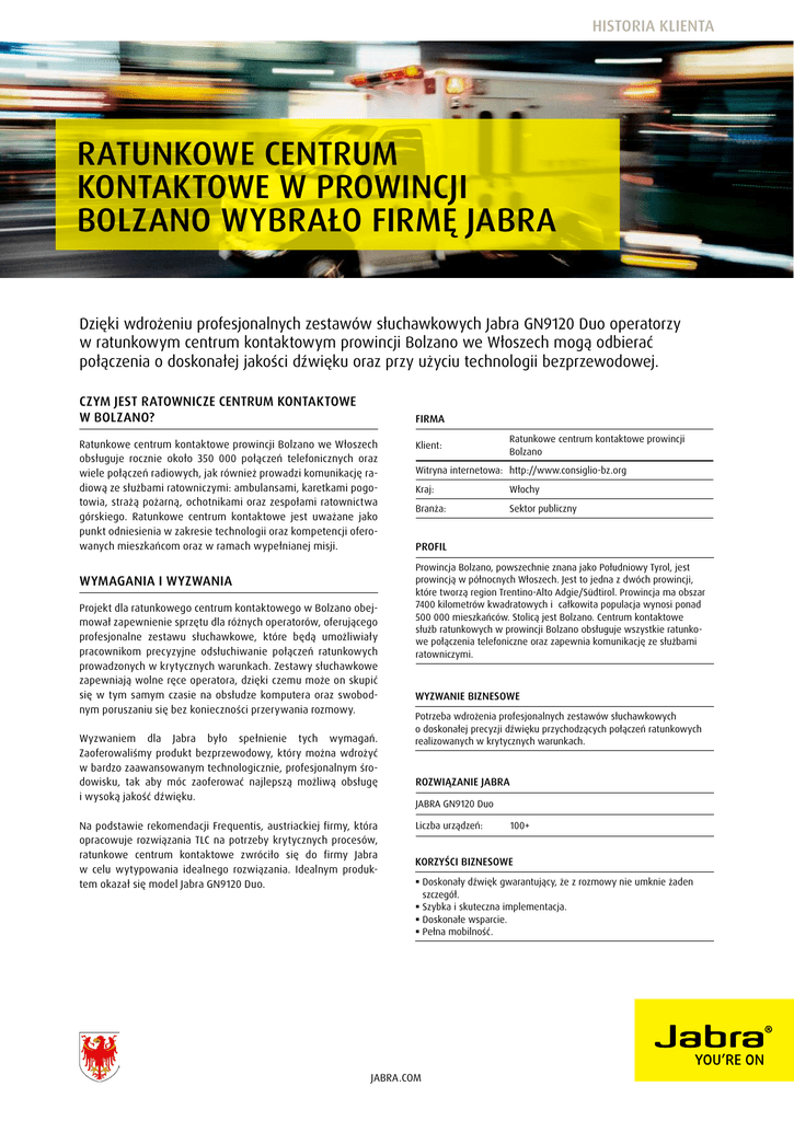 historia klienta Ratunkowe centrum kontaktowe w prowincji Bolzano wybrało firmę Jabra Dzięki wdrożeniu profesjonalnych zestawów słuchawkowych Jabra GN9120 Duo operatorzy w ratunkowym centrum kontaktowym prowincji Bolzano we Włoszech mogą odbierać połączenia o doskonałej jakości dźwięku oraz przy użyciu technologii bezprzewodowej. Czym jest ratownicze centrum kontaktowe w Bolzano? Firma Ratunkowe centrum kontaktowe prowincji Bolzano we Włoszech obsługuje rocznie około 350 000 połączeń telefonicznych oraz wiele połączeń radiowych, jak również prowadzi komunikację radiową ze służbami ratowniczymi: ambulansami, karetkami pogotowia, strażą pożarną, ochotnikami oraz zespołami ratownictwa górskiego. Ratunkowe centrum kontaktowe jest uważane jako punkt odniesienia w zakresie technologii oraz kompetencji oferowanych mieszkańcom oraz w ramach wypełnianej misji. Wymagania i wyzwania Projekt dla ratunkowego centrum kontaktowego w Bolzano obejmował zapewnienie sprzętu dla różnych operatorów, oferującego profesjonalne zestawu słuchawkowe, które będą umożliwiały pracownikom precyzyjne odsłuchiwanie połączeń ratunkowych prowadzonych w krytycznych warunkach. Zestawy słuchawkowe zapewniają wolne ręce operatora, dzięki czemu może on skupić się w tym samym czasie na obsłudze komputera oraz swobodnym poruszaniu się bez konieczności przerywania rozmowy. Wyzwaniem dla Jabra było spełnienie tych wymagań. Zaoferowaliśmy produkt bezprzewodowy, który można wdrożyć w bardzo zaawansowanym technologicznie, profesjonalnym środowisku, tak aby móc zaoferować najlepszą możliwą obsługę i wysoką jakość dźwięku. Na podstawie rekomendacji Frequentis, austriackiej firmy, która opracowuje rozwiązania TLC na potrzeby krytycznych procesów, ratunkowe centrum kontaktowe zwróciło się do firmy Jabra w celu wytypowania idealnego rozwiązania. Idealnym produktem okazał się model Jabra GN9120 Duo. Klient: Ratunkowe centrum kontaktowe prowincji Bolzano Witryna internetowa: http://www.consiglio-bz.org Kraj: Włochy Branża: Sektor publiczny Profil Prowincja Bolzano, powszechnie znana jako Południowy Tyrol, jest prowincją w północnych Włoszech. Jest to jedna z dwóch prowincji, które tworzą region Trentino-Alto Adgie/Südtirol. Prowincja ma obszar 7400 kilometrów kwadratowych i całkowita populacja wynosi ponad 500 000 mieszkańców. Stolicą jest Bolzano. Centrum kontaktowe służb ratunkowych w prowincji Bolzano obsługuje wszystkie ratunkowe połączenia telefoniczne oraz zapewnia komunikację ze służbami ratowniczymi. wyzwanie biznesowe Potrzeba wdrożenia profesjonalnych zestawów słuchawkowych o doskonałej precyzji dźwięku przychodzących połączeń ratunkowych realizowanych w krytycznych warunkach. ROZWIĄZANIE JABRA JABRA GN9120 Duo Liczba urządzeń: 100+ KORZYŚCI BIZNESOWE Doskonały dźwięk gwarantujący, że z rozmowy nie umknie żaden szczegół. Szybka i skuteczna implementacja. Doskonałe wsparcie. Pełna mobilność. jabra.com historia klienta „Zestawy słuchawkowe Jabra zapewniają pełną mobilność i oferują doskonałą jakość dźwięku, gwarantując, że z żadnej rozmowy nie umknie ani jedno słowo”. Heimo Delazer, doradca techniczny ds. obrony cywilnej, prowincja Bolzano Dzięki innowacyjnym parametrom, które spełniają wszystkie wymagania strukturalne oraz dzięki renomowanej skuteczności (mikrofon z funkcją redukcji szumów, trwały akumulator, prosta faza łączenia zestawu słuchawkowego i stacji bazowej przy zmianie personelu, optymalne parametry dźwięku), zestaw słuchawkowy Jabra GN9120 Duo okazał się idealnym produktem umożliwiającym modernizację i integrację istniejącej struktury technologicznej w ramach wymiany starych produktów, które były wcześniej używane. W tym przypadku zestaw słuchawkowy Jabra GN9120 Duo jest wyposażony w dwa głośniki, zapewniając w ten sposób wyjątkową jakość dźwięku. Mikrofon z redukcją szumów zapewnia najwyższą jakość transmisji dźwięku, co gwarantuje bardzo czytelną komunikację pomiędzy operatorem i centralą. Technologia DECT zapewnia zakres stosowania do 150 metrów, co daje użytkownikowi swobodę poruszania się oraz gwarantuje bezpieczeństwo. Czas rozmów wynosi do 12 godzin – Jabra GN9120 Duo nigdy nie zawiedzie, nawet w przypadku najdłuższego roboczego dnia. Wdrożenie i instalacja ponad 100 zestawów słuchawkowych GN9120 Duo w ratunkowym centrum kontaktowym prowincji Bolzano była szybka i efektywna. Było to głównie spowodowane profesjonalnym podejściem personelu, współpracą ze sprzedawcą, iiTi di Bolzano, oraz wsparciem autoryzowanego dystrybutora, Itancia. Więcej informacji Odwiedź witrynę internetową jabra.com, aby uzyskać więcej informacji. „Niezmiernie istotne jest dla ratunkowego centrum kontaktowego z prowincji Bolzano, aby posiadać elastyczny, zaawansowany technologicznie sprzęt, który może zagwarantować odbiór połączeń przychodzących na najwyższym poziomie. Zestawy słuchawkowe Jabra GN9120 Duo zapewniają pełną mobilność i oferują doskonałą jakość dźwięku, gwarantując, że z żadnej rozmowy nie umknie ani jedno słowo. Jesteśmy bardzo zadowoleni z naszego wyboru oraz z pomocy naszego dostawcy w zakresie instalacji i konfiguracji sprzętu”, powiedział Heimo Delazer, doradca techniczny ds. obrony cywilnej. Zaoferowane rozwiązanie CS_BOLZANO_PL_50012_V02_1204 Po wnikliwym przestudiowaniu wymagań określonych przez ratunkowe centrum kontaktowe prowincji Bolzano, firma Jabra zaoferowała model Jabra GN9120 Duo. Bezprzewodowy zestaw słuchawkowy, który szczególnie nadaje się do intensywnego i profesjonalnego użytku i który jest wręcz stworzony do środowisk, w których wysoka jakość dźwięku jest nieodzowna – do połączeń przychodzących i wychodzących. jabra.com
