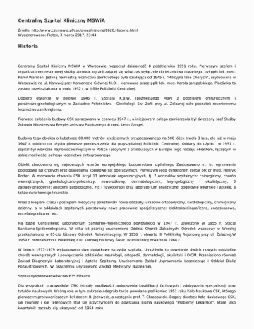 Centralny Szpital Kliniczny MSWiA Źródło: http://www.cskmswia.pl/csk/o-nas/historia/8620,Historia.html Wygenerowano: Piątek, 3 marca 2017, 23:44 Historia Centralny Szpital Kliniczny MSWiA w Warszawie rozpoczął działalność 8 października 1951 roku. Pierwszym szefem i organizatorem resortowej służby zdrowia, ograniczającej się wówczas wyłącznie do lecznictwa otwartego, był ppłk lek. med. Kamil Warman. Jedyną namiastką lecznictwa zamkniętego była działająca od 1945 r. "Milicyjna Izba Chorych", usytuowana w Warszawie na ul. Karowej przy Komendzie Głównej M.O. i kierowana przez ppłk lek. med. Karola Jampolskiego. Placówka ta została przekształcona w maju 1952 r. w II filię Polikliniki Centralnej. Dopiero otwarcie w połowie 1946 r. Szpitala K.B.W. (późniejszego MBP) z oddziałem chirurgicznym i położniczo-ginekologicznym w Zakładzie Położnictwa i Ginekologii Św. Zofii przy ul. Żelaznej dało początek resortowemu lecznictwu zamkniętemu. Pierwsze założenia budowy CSK opracowano w czerwcu 1947 r., a inicjatorem całego zamierzenia był ówczesny szef Służby Zdrowia Ministerstwa Bezpieczeństwa Publicznego dr med. Leon Gangel. Budowa tego obiektu o kubaturze 80.000 metrów sześciennych przystosowanego na 500 łóżek trwała 3 lata, ale już w maju 1947 r. oddano do użytku pierwsze pomieszczenia dla przyszpitalnej Polikliniki Centralnej. Oddany do użytku w 1951 r. szpital był wówczas najnowocześniejszym w Polsce i jedynym z przodujących w Europie tego rodzaju obiektem, łączącym w sobie możliwości pełnego lecznictwa zintegrowanego. Obiekt zbudowano wg najnowszych wzorów europejskiego budownictwa szpitalnego Zastosowano m. in. ogrzewanie podłogowe sal chorych oraz oświetlenia kopułowe sal operacyjnych. Pierwszym jego dyrektorem został płk dr med. Henryk Rotter. W momencie otwarcia CSK liczył 13 jednostek organizacyjnych, tj. 7 oddziałów szpitalnych: chirurgiczny, chorób wewnętrznych, ginekologiczno-położniczy, noworodkowy, dermatologiczny, laryngologiczny i okulistyczny, 3 zakłady-pracownie: anatomii patologicznej, rtg i fizykoterapii oraz laboratorium analityczne, pogotowie lekarskie i aptekę, a także dwie komisje lekarskie. Wraz z biegiem czasu i postępem medycyny powstawały nowe oddziały: urazowo-ortopedyczny, kardiologiczny, chirurgiczny dzienny, a w oddziałach szpitalnych powstawały nowe pracownie specjalistyczne: elektrokardiograficzna, endoskopowa, encefalograficzna, etc. Na bazie Centralnego Laboratorium Sanitarno-Higienicznego powołanego w 1947 r. utworzono w 1955 r. Stację Sanitarno-Epidemiologiczną. W kilka lat później uruchomiono Oddział Chorób Zakaźnych. Ośrodek wczasowy w Wesołej przekształcono w 85-cio łóżkowy Ośrodek Rehabilitacyjny. W 1956 r. otwarto III Poliklinikę Rejonową przy ul. Żelaznej.W 1959 r. przeniesiono II Poliklinikę z ul. Karowej na Nowy Świat, IV Poliklinikę otwarto w 1968 r.. W latach 1977-1979 wybudowano dwa dodatkowe skrzydła szpitala. Umożliwiło to powstanie dwóch nowych oddziałów chorób wewnętrznych i powiększenie oddziałów: neurologii, ortopedii, dermatologii, okulistyki i OIOM. Przeniesiono również Zakład Diagnostyki Laboratoryjnej i Aptekę Szpitalną. Uruchomiono Zakład Usprawniania Leczniczego i Oddział Dializ Pozaustrojowych. W przyziemiu usytuowano Zakład Medycyny Nuklearnej. Szpital dysponował wówczas 635 łóżkami. Dla wszystkich pracowników CSK, istniały możliwości podnoszenia kwalifikacji fachowych i zdobywania specjalizacji oraz tytułów naukowych. Ważną rolę w tym zakresie odegrało także powołane pod koniec 1951 raku Koło Naukowe CSK, którego pierwszym przewodniczącym był docent B. Jochweds, a następnie prof. T. Chrapowicki. Bogaty dorobek Koła Naukowego CSK, jak również i kół terenowych stał się przyczynkiem do powstania pisma naukowego "Problemy Lekarskie", które jako kwartalnik zaczęło się ukazywać od 1954 roku. Wyrazem zwiększających się aspiracji i rozwoju Centralnego Szpitala Klinicznego było Zarządzenie Ministra Sprawa Wewnętrznych z grudnia 1982 roku ustanawiające 12 stanowisk Głównych Specjalistów w poszczególnych specjalnościach, będących odpowiednikami funkcji Konsultantów Krajowych w społecznej służbie zdrowia. W zespole tym znalazło się 6 członków z grona kadry lekarskiej CSK. Dalszym etapem rozwoju CSK było powstanie na jego bazie w 1988 roku Instytutu Medycyny Klinicznej MSW, pod kierownictwem ppłk prof. dr hab. n. med. R. J. Żochowskiego, który powołał Radę Naukową z Przewodniczącym płk prof. dr hab. n. m. W. Ramotowskim. Na uwagę zasługuje też fakt wydania wiosną 1990 roku przez Ministra Spraw Wewnętrznych gen. Broni Cz. Kiszczaka zarządzenia o budowie w każdej placówce lecznictwa zamkniętego Służby Zdrowia MSW, rzymskokatolickiej kaplicy. W Centralnym Szpitalu Klinicznym, kaplicę otworzono 7 sierpnia 1990 roku. Pierwsze nabożeństwo celebrował J. E. Prymas Polski kardynał Józef Glemp, dokonując jednocześnie jej poświęcenia. W dziesiątą rocznicę (4 sierpnia 2000 roku) powstania Duszpasterstwa Chorych w CSK, została odprawiona msza również pod przewodnictwem J. E. Ks. Kardynała Józefa Glempa, Prymasa Polski. Wtedy to kaplica szpitalna otrzymała tytuł "Miłosierdzia Bożego". Zasadnicze zmiany nastąpiły po uzyskaniu przez CSK w dniu 1 października 1998 r. osobowości prawnej. Pierwszym Dyrektorem, został dr n. med. Maciej Kisiel, którego zastąpił z dniem 1.12.1998 r. dr n. med. Marek Durlik. Możliwość prowadzenia na własny rachunek działalności gospodarczej pozwoliła na przeznaczenie uzyskanych środków na rozwój zakładu. Pierwszym tego wyrazem była odnowa bazy aparaturowej. W miejsce wysłużonego sprzętu medycznego zakupiono nowoczesną aparaturę diagnostyczną. Wymienić tu należy: spiralny tomograf komputerowy najnowszej generacji, zestaw do badań hemodynamicznych serca, rezonans magnetyczny, densytom
