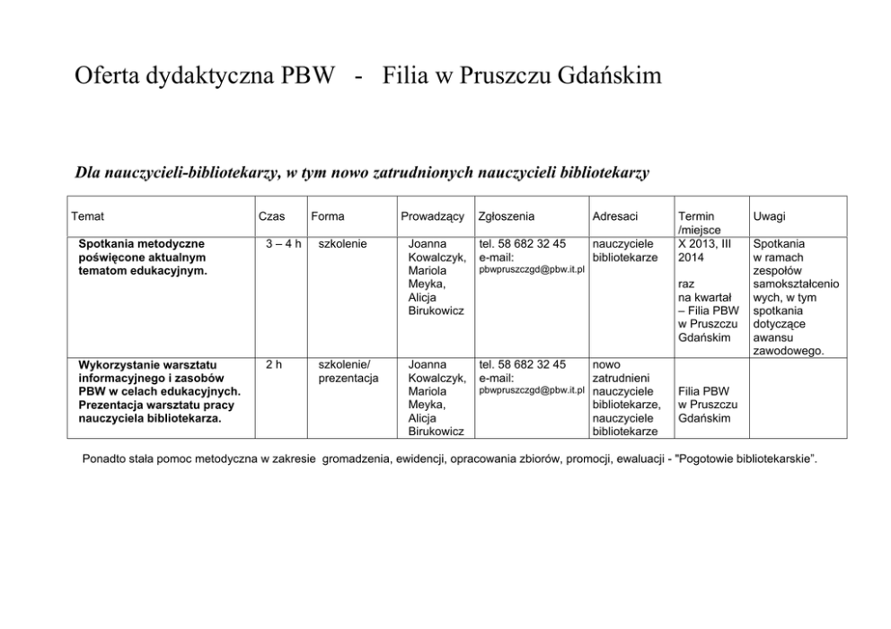 Oferta dydaktyczna PBW - Filia w Pruszczu Gdańskim