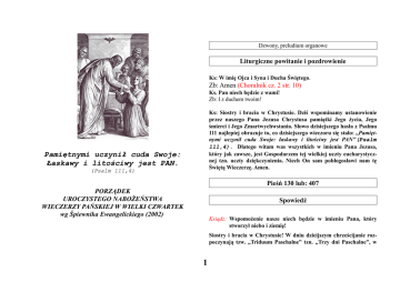 Dzwony, preludium organowe Liturgiczne powitanie i pozdrowienie Ks: W imię Ojca i Syna i Ducha Świętego. Zb: Amen (Choralnik cz. 2 str. 10) Ks. Pan niech będzie z wami! Zb: I z duchem twoim! Ks: Siostry i bracia w Chrystusie. Dziś wspominamy ustanowienie przez naszego Pana Jezusa Chrystusa pamiątki Jego życia, Jego śmierci i Jego Zmartwychwstania. Słowo dzisiejszego hasła z Psalmu 111 najlepiej obrazuje to, co dzisiejszego wieczoru się stało: „Pamiętnymi uczynił cuda Swoje: łaskawy i litościwy jest PAN”(Psalm 111,4). Dlatego witam was wszystkich w imieniu Pana Jezusa, który jak zawsze, jest Gospodarzem tej wielkiej uczty eucharystycznej tzn. uczty dziękczynienia. Niech On sam pobłogosławi nam tę Świętą Wieczerzę. Amen. Pamiętnymi uczynił cuda Swoje: Łaskawy i litościwy jest PAN. (Psalm 111,4) Pieśń 130 lub: 407 PORZĄDEK UROCZYSTEGO NABOŻEŃSTWA WIECZERZY PAŃSKIEJ W WIELKI CZWARTEK wg Śpiewnika Ewangelickiego (2002) Spowiedź Ksiądz: Wspomożenie nasze niech będzie w imieniu Pana, który stworzył niebo i ziemię! Siostry i bracia w Chrystusie! W dniu dzieijszym chrześcijanie rozpoczynają tzw. „Triduum Paschalne” tzn. „Trzy dni Paschalne”, w 1 czasie których wspominamy to co wielkiego stało się dla naszego zbawienia. Pamiątkę tego w dzisiejszy wieczór Pan Jezus ustanowił jako ustanowienie wieczne. Dlatego mamy tę pamiątkę wspominać i być jej uczestnikami tak długo aż On powtórnie przyjdzie. Penitenci: .Żałuję. Radując się z Jego obecności wśród nas jednocześnie uświadamiamy sobie, że nie jesteśmy godni tak wielkiej łaski, bo jesteśmy grzeszni, obraziliśmy Boga i naszych bliźnich niejednokrotnie słowem, myślą, uczynkiem i zaniedbaniem. Sami siebie od grzechów uwolnić nie jesteśmy w stanie. Dlatego wznieśmy swe serca do Pana i wspólnie wyznajmy Panu nasze grzechy: Penitenci: Wierzę. Ksiądz: Czy wierzysz w odpuszczenie grzechów i pojednanie z Bogiem przez Jezusa Chrystusa? Jeśli tak, odpowiedz: wierzę. Ksiądz: Czy pragniesz z pomocą Ducha Świętego poprawić życie swoje? Jeśli jest to twoim szczerym pragnieniem, odpowiedz: pragnę. Penitenci: Pragnę! (Ksiądz i zbór klękają i razem głośno spowiadają się:) Absolucja: Wszechmogący Boże, miłosierny Ojcze!* Ja biedny, nędzny, grzeszny człowiek* wyznaję przed Tobą wszystkie grzechy i przewinienia moje,* popełnione myślą, mową i uczynkiem,* którymi zasłużyłem na Twe doczesne i wieczne kary.* Żałuję za nie szczerze i z całego serca,* i proszę Cię dla niezgłębionego miłosierdzia Twego* i dla niewinnej i gorzkiej męki i śmierci* umiłowanego Syna Twego Jezusa Chrystusa,* bądź mnie niegodnemu, grzesznemu człowiekowi łaskaw i miłościw,* odpuść mi wszystkie grzechy moje* i dopomóż łaskawie przez moc Ducha Twego Świętego* do poprawy życia mego.* Amen. Boże, bądź miłościw mnie grzesznemu! Amen. Ksiądz: Jak wierzysz, tak niechaj ci się stanie! Tak rzekł nasz Pan Jezus Chrystus do swoich apostołów: „Którymkolwiek grzechy odpuścicie, są im odpuszczone, a którymkolwiek zatrzymacie, są im zatrzymane”. (J 20, 23) Przeto jako powołany i ustanowiony sługa Pana naszego Jezusa Chrystusa i Jego świętej Ewangelii, zwiastuję wszystkim pokutującym łaskę Bożą i z rozkazu Pańskiego odpuszczam wam grzechy wasze: W imię Ojca i Syna, i Ducha † Świętego. Amen. Sam Bóg pokoju niech was w pełni uświęci, aby cały wasz duch, dusza i ciało zostały zachowane bez zarzutu na ponowne przyjście naszego Pana Jezusa Chrystusa. Wierny jest Ten, który was powołuje, On tego dokona. Amen. (1 Ts 5,23-24) (Ksiądz zwraca się do penitentów:) Ksiądz: Bóg słyszał nasze wołanie, dlatego przed obliczem Boga wszechmogącego pytam się każdego z was: Czy żałujesz za grzechy swoje? Jeśli tak, odpowiedz: żałuję. Pieśń 398 Liturgia Wstępna: Choralnik cz. 2: str. 12-13 2 Zbór: Introitus 41: Ks: Panie, kto spożywa Ciało Twoje i pije Krew Twoją Zb: Ten ma żywot wieczny! Ks: Pamiętnymi uczyniłeś cuda Swoje; Zb: Łaskawy i litościwy jesteś, Panie! Ks: Dajesz pożywienie tym, którzy się Ciebie boją. Zb: Na wieki pamiętasz o Swoim przymierzu. A na ziemi pokój ludziom w których ma upodobanie. (Łk 2,14) [Zbór lub Chór:] Chwalimy Cię. Błogosławimy Cię. Wielbimy Cię. Wysławiamy Cię. Dzięki Ci składamy, Bo wielka jest chwała Twoja. Panie Boże, Królu nieba, Boże Ojcze wszechmogący. Panie, Synu Jednorodzony, Jezu Chryste. Panie Boże, Baranku Boży, Synu Ojca. Który gładzisz grzechy świata, Zmiłuj się nad nami. Który gładzisz grzechy świata Przyjm błaganie nasze. Który siedzisz po prawicy Ojca, Zmiłuj się nad nami. Albowiem tylko Tyś jest święty. Tylko Tyś jest Panem. Tylko Tyś Najwyższy, Jezu Chryste. Z Duchem Świętym w chwale Boga Ojca. Amen. Kyrie – Panie, zmiłuj się! (Choralnik cz. 2 Dział A – st r. 16 Wersja C – Zaolzie, Józef Podola). W Polsce Choralnik cz.2 str. 14 i 15. Ks: Panie, zmiłuj się! Lub: Kyrie eleison! Zb: Panie, zmiłuj się! Ks: Chryste, zmiłuj się! Lub: Christe eleison! Zb: Chryste, zmiłuj się! Ks: Panie, zmiłuj się! Lub: Kyrie eleison! Zb: Panie, zmiłuj się [nad nami!] Gloria in excelsis – Chwała na wysokościach Kolekta: (Dzwonią po raz ostatni wszystkie dzwony) (Choralnik cz. 2 Dział A - str. 17) Ks: Ks: Módlmy się. Chwała Bogu na wysokościach! Zbór: Na wysokościach Bogu cześć i dzięki łasce Jego! Już nam nie może zguby nieść moc i potęga złego. Upodobanie Bóg w nas ma I pokój już bez przerwy trwa, Waśń wszelka się skończyła. Panie Jezu Chryste, który nam zostawiłeś w cudownym Sakramencie Ciała i Krwi Swojej pamiątkę Swej śmierci / i polecasz nam opowiadać zbawczą śmierć Twoją tak długo, aż powtórnie przyjdziesz, / prosimy Cię, spraw, abyśmy godnie czcili świętą tajemnicę Ciała i Krwi Twojej, / i tak przyjmowali ten Sakrament, byśmy w sobie skutecznie odczuwali po