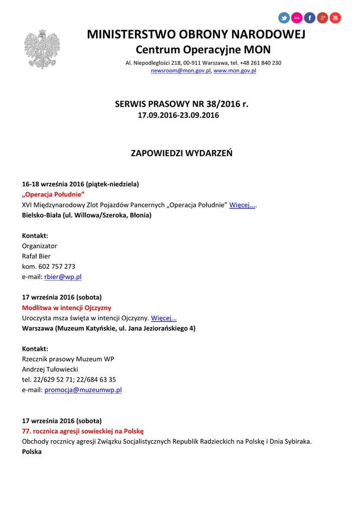 MINISTERSTWO OBRONY NARODOWEJ Centrum Operacyjne MON Al. Niepodległości 218, 00-911 Warszawa, tel. +48 261 840 230 [email protected], www.mon.gov.pl SERWIS PRASOWY NR 38/2016 r. 17.09.2016-23.09.2016 ZAPOWIEDZI WYDARZEŃ 16-18 września 2016 (piątek-niedziela) „Operacja Południe” XVI Międzynarodowy Zlot Pojazdów Pancernych „Operacja Południe” Więcej.... Bielsko-Biała (ul. Willowa/Szeroka, Błonia) Kontakt: Organizator Rafał Bier kom. 602 757 273 e-mail: [email protected] 17 września 2016 (sobota) Modlitwa w intencji Ojczyzny Uroczysta msza święta w intencji Ojczyzny. Więcej... Warszawa (Muzeum Katyńskie, ul. Jana Jeziorańskiego 4) Kontakt: Rzecznik prasowy Muzeum WP Andrzej Tułowiecki tel. 22/629 52 71; 22/684 63 35 e-mail: [email protected] 17 września 2016 (sobota) 77. rocznica agresji sowieckiej na Polskę Obchody rocznicy agresji Związku Socjalistycznych Republik Radzieckich na Polskę i Dnia Sybiraka. Polska Kontakt: Rzecznik prasowy DGRSZ ppłk Szczepan Głuszczak kom. 722 387 212 e-mail: [email protected] Inowrocław, Dęblin, Nisko, Głogów Oficer prasowy 2 Pinż kpt. Sylwester Ludwiczak tel. 261 436 243 e-mail: [email protected] Elbląg, Zamość, Chełm, Siedlce, Braniewo, Giżycko, Orzysz, Bartoszyce, Morąg, Węgorzewo, Suwałki, Gołdap Oficer prasowy 16 PDZ mjr Zbigniew Tuszyński tel. 55/ 230 22 31, kom. 693 168 261 e-mail: [email protected] Opole Oficer prasowy 10 Blog por. Piotr Płuciennik tel. 261 625 611, kom. 669 924 221 e-mail: [email protected] Szczecin (Cmentarz Centralny) Oficer Sekcji Prasowej 12 SDZ por. Błażej Łukaszewski tel. 695 301 720 e-mail: [email protected] Słupsk Oficer prasowy 7 BOW kpt. Karolina Krzewina-Hyc tel. 721 890 408 e-mail: [email protected] Poznań (Garnizon Poznań, ul. Wojska Polskiego) Oficer prasowy CSWL kpt. Piotr Wójcik tel. 261 575 227, kom. 785 402 919 e-mail: [email protected] Wrocław (Centrum Szkolenia Wojsk Inżynieryjnych i Chemicznych) Oficer prasowy CSWliChem kpt. Marek Gwóźdź Tel. 261 657 283, kom. 723 694 403 e-mail: [email protected] 17-18 września 2016 (sobota-niedziela) Rocznica bitwy pod Olszewem Obchody rocznicy bitwy pod Olszewem. Olszewo Kontakt: Oficer prasowy 15 BZ kpt. Edyta Kowalska kom. 723 251 615 e-mail: [email protected] 18 września 2016 (niedziela) Uroczystość patriotyczna Uroczystość patriotyczna poświęcona pomordowanym przez hitlerowców mieszkańcom Pomorza we wrześniu 1939 roku. Mniszek Kontakt: Oficer prasowy CSLog kpt. Daniel Chądzyński tel. 261 484 379; kom. 727 012 236 e-mail: [email protected] 21-30 września 2016 Zgrupowanie 9 Warmińskiego Pułku Rozpoznawczego Zgrupowanie wydzielonych sił 9 Warmińskiego Pułku Rozpoznawczego z udziałem pododdziałów rozpoznania patrolowego i dalekiego rozpoznania. OSPG Trzcianiec Kontakt: Oficer prasowy 9 pr mjr Sylwester Tabaka tel. 261 317 375 e-mail: [email protected] 22-23 września 2016 (czwartek-piątek) Ćwiczenie 21 Brygady Strzelców Podhalańskich Pokonanie przeszkody wodnej przez pododdziały 21 Brygady Strzelców Podhalańskich. Radomyśl nad Sanem Kontakt: Oficer prasowy 21 BSP kpt. Konrad Radzik kom. 691 677 515 23 września 2016 (piątek) Święto 21 Batalionu Logistycznego Uroczyste obchody święta 21 Batalionu Logistycznego. Rzeszów Kontakt: Oficer prasowy 21 BSP kpt. Konrad Radzik kom. 691 677 515 KRONIKA 9 września 2016 (piątek) Sekretarz stanu na MSPO Wiceminister obrony narodowej Bartosz Kownacki uczestniczył w spotkaniach sekretarzy i podsekretarzy stanu różnych resortów z całego świata z przedstawicielami przemysłu obronnego podczas XXIV Międzynarodowego Salonu Przemysłu Obronnego (MSPO), który w piątek 9 września zakończył się w Kielcach. Więcej... 9 września 2016 (piątek) Zwierzchnik Sił Zbrojnych na MSPO Prezydent RP Andrzej Duda wizytował 9 września Wystawę Sił Zbrojnych Rzeczypospolitej Polskiej podczas XXIV Międzynarodowego Salonu Przemysłu Obronnego w Kielcach oraz wręczył Nagrodę Prezydenta RP dla produktu najlepiej służącego podniesieniu poziomu bezpieczeństwa żołnierzy Sił Zbrojnych. Więcej... 10 września 2016 (sobota) Promocja na pierwszy stopień oficerski Jako rząd, państwo i jako naród jesteśmy z Was niezwykle dumni. Mamy nadzieję, że do tych wielkich wartości, jakie armia przedstawia, wy tchniecie nowego ducha, umiejętności, nową wiedzę i determinację służenia Polsce – powiedział minister obrony narodowej Antoni Macierewicz podczas uroczystej promocji absolwentów Wyższej Szkoły Oficerskiej Wojsk Lądowych. Więcej... 13 września 2016 (wtorek) VI runda Dialogu Strategicznego We wtorek, 13 września br., podsekretarz stanu w MON Tomasz Szatkowski wziął udział w VI rundzie Dialogu Strategicznego z Rumunią. Więcej... 15 września 2016 (czwartek) „Środowisko bezpieczeństwa – szanse i zagrożenia” W czwartek, 15 września br., w ramach Strategicznego Przeglądu Obronnego odbyła się konferencja pt. „Środowisko bezpieczeństwa – szanse i zagrożenia”, w której uczestniczył podsekretarz stanu Tomasz Szatkowski. Więcej... 15 września 2016 (czwartek) Nowy kapelan w służbie dla wojsk OT 2 września 2016 roku Jego Ekscelencja Biskup Polowy Wojska Polskiego Józef Guzdek mianował księdza ppłk. Piotra Majkę kapelanem Biura ds. Utworzenia Obrony Terytorialnej. Kapelan pełni nowe obwiązki od 5 września. Więcej... 15 września 2016 (czwartek) Konferencja prasowa podkomisji smoleńskiej Zdecydowałem o odtajnieniu i udostępnieniu opinii publicznej materiałów dotyczących katastrofy smoleńskiej - poinformował minister Antoni Macierewicz podczas konferencji podkomisji wyjaśniającej okoliczności katastrofy smoleńskiej. Więcej... 16 września 2016 (piątek) ORP Gen. T. Kościuszko kończy misję i wraca do Gdyni Fregata rakietowa ORP Gen. T. Kościuszko kończy swoją dwumiesięczną misję na Morzu Śródziemnym, Egejskim oraz Czarnym, której celem była ochrona południowych granic NATO. W