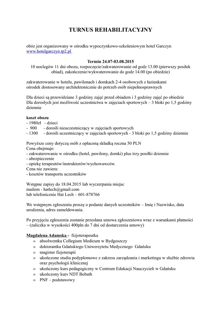 TURNUS REHABILITACYJNY obóz jest organizowany w ośrodku wypoczynkowo-szkoleniowym hotel Garczyn www.hotelgarczyn.tp2.pl Termin 24.07-03.08.2015 10 noclegów 11 dni obozu, rozpoczęcie/zakwaterowanie od godz 13.00 (pierwszy posiłek obiad), zakończenie/wykwaterowanie do godz 14.00 (po obiedzie) zakwaterowanie w hotelu, pawilonach i domkach 2-4 osobowych z łazienkami ośrodek dostosowany architektonicznie do potrzeb osób niepełnosprawnych Dla dzieci są przewidziane 3 godziny zajęć przed obiadem i 3 godziny zajęć po obiedzie Dla dorosłych jest możliwość uczestnictwa w zajęciach sportowych – 3 bloki po 1,5 godziny dziennie koszt obozu - 1980zł - dzieci - 900 - dorośli nieuczestniczący w zajęciach sportowych - 1300 - dorośli uczestniczący w zajęciach sportowych - 3 bloki po 1,5 godziny dziennie Powyższe ceny dotyczą osób z opłaconą składką roczna 50 PLN Cena obejmuje: - zakwaterowanie w ośrodku (hotel, pawilony, domki) plus trzy posiłki dziennie - ubezpieczenie - opiekę terapeutów/instruktorów/wychowawców. Cena nie zawiera: - kosztów transportu uczestników Wstępne zapisy do 18.04.2015 lub wyczerpania miejsc mailem - [email protected] lub telefonicznie Hat Lech – 601-878766 We wstępnym zgłoszeniu proszę o podanie danych uczestników – Imię i Nazwisko, data urodzenia, adres zameldowania. Po przyjęciu zgłoszenia zostanie przesłana umowa zgłoszeniowa wraz z warunkami płatności – (zaliczka w wysokości 400pln do 7 dni od dostarczenia umowy) Magdalena Adamska - fizjoterapeutka • absolwentka Collegium Medicum w Bydgoszczy • doktorantka Gdańskiego Uniwersytetu Medycznego Gdańsku • magister fizjoterapii • ukończone studia podyplomowe z zakresu zarządzania i marketingu w służbie zdrowia oraz psychologii klinicznej • ukończony kurs pedagogiczny w Centrum Edukacji Nauczycieli w Gdańsku • ukończony kurs NDT Bobath • PNF – podstawowy • • • • • • • • kinesiotaping – podstawowy szkolenie z zastosowania kombinezonu Dunag 02 Chiropraktyka Nowoczesne Systemy Dynamicznej Analizy Ruchu i Postawy Ciała w Praktyce Diagnostycznej masaż tensengracyjny terapia Masters fizjoterapeuta w Polskim Stowarzyszeniu na Rzecz Osób z Uposledzeniem Umysłowym Koło w Gdańsku Maciej Gajda – fizjoterapeuta • mgr fizjoterapii- absolwent Collegium Medicum w Bydgosczy • terapeuta NDT Bobath • kinesiotaping – podstawowy • PNF –podstawowy • Metoda Halwick • Watsu 1, 2 • Moulligan 1,2 • Fizjoterapeuta w Polskim Stowarzyszeniu Na Rzecz Osób z Uposledzeniem Umysłowym Koło w Gdańsku Propozycja ćwiczeń: Cwiczenia metodą NDT Bobath Cwiczenia metodą PNF Terapia tkanek miękkich- masaż Cwiczenia w kombinezonach Dunag 02 do rozważenia, mogę pożyczyć z pracy Kinesiotaping Hipoterapia NDT-Bobath – jedna z wiodących metod neurokinezjologicznych stworzonych dla potrzeb rehabilitacji niemowląt i dzieci. Istotą terapii jest szczegółowa analiza głównego problemu pacjenta z uwzględnieniem ograniczeń ruchowych, zmysłowych, percepcyjnych i poznawczych, w kierunku ustalenia głównych celów terapeutycznych: krótkoterminowych i długoterminowych. PNF- metoda rehabilitacyjna mająca na celu przywrócenie utraconej (lub jeszcze nie osiągniętej) funkcji t.j. czworakowanie lub chód przy użyciu specjalnych technik fizjoterapeutycznych. Terapia przeprowadzana jest w taki sposób, aby jak najbardziej wspomagać czynności dnia codziennego, np. jedzenie, samoobsługa. Kombinezony Dunag 02- terapia w kombinezonie Dunag 02 oddziaływuje na układ proprioceptywny człowieka, powodując optymalne ustawienie poszczególnych części ciała względem siebie i utrwalając prawidłowy wzorzec ruchowy. Poprzez docisk budowane jest też napięcie mięśniowe w centrum ciała, co umożliwia zwiększoną kontrolę poszczególnych części ciała. Masaż leczniczy – to indywidualnie dobrany masaż w zależności od wskazań medycznych pacjenta. Bazuje na pracy na tkankach miękkich różnymi technikami mającymi na celu rozluźnienie lub pobudzenie danych mięśni. Często wspomagany różnymi terapiami tkanek miękkich np. terapią powięziową. Działanie masażu jest przeciwbólowe, korekcyjne, przeciwobrzękowe. Kinesiology taping – jest to metoda terapii polegająca na sensorycznym oddziaływaniu plastra na organizm człowieka. Specjalny rodzaj aplikacji, dobrany indywidualnie dla potrzeb pacjenta może skutecznie pomóc w likwidacji bólu, korekcji wad postawy, a także wspomagać pracę mięśni lub działać przeciwobrzękowo. Polecana dla niemowląt, dzieci i osób dorosłych w przypadku: • nieprawidłowego ustawienia poszczególnych elementów aparatu ruchu ( np. stopy i kolana koślawe lub szpotawe, skośne ustawienie miednicy, pochylenie głowy do jednego barku, odstające łopatki); • zespołów bólowych ( np. zespół bolesnego barku, bóle kręgosłupa); • zmian obrzękowych ( np. po urazach, zabiegach ); • zaburzeń neurologicznych (np. stopa opadająca, uszkodzenie splotu ramiennego).