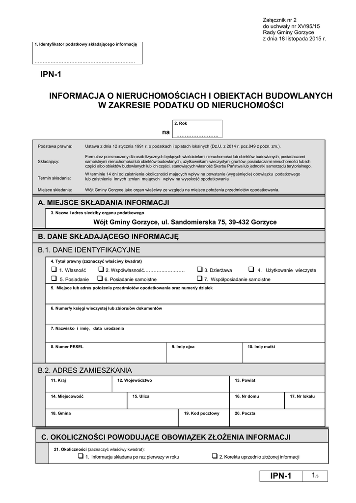 Załącznik nr 2 do uchwały nr XV/95/15 Rady Gminy Gorzyce z dnia 18 listopada 2015 r. 1. Identyfikator podatkowy składającego informację ……………………………………………………… IPN-1 INFORMACJA O NIERUCHOMOŚCIACH I OBIEKTACH BUDOWLANYCH W ZAKRESIE PODATKU OD NIERUCHOMOŚCI 2. Rok na ……………………. Podstawa prawna: Ustawa z dnia 12 stycznia 1991 r. o podatkach i opłatach lokalnych (Dz.U. z 2014 r. poz.849 z późn. zm.). Składający: Formularz przeznaczony dla osób fizycznych będących właścicielami nieruchomości lub obiektów budowlanych, posiadaczami samoistnymi nieruchomości lub obiektów budowlanych, użytkownikami wieczystymi gruntów, posiadaczami nieruchomości lub ich części albo obiektów budowlanych lub ich części, stanowiących własność Skarbu Państwa lub jednostki samorządu terytorialnego. W terminie 14 dni od zaistnienia okoliczności mających wpływ na powstanie (wygaśnięcie) obowiązku podatkowego lub zaistnienia innych zmian mających wpływ na wysokość opodatkowania . Wójt Gminy Gorzyce jako organ właściwy ze względu na miejsce położenia przedmiotów opodatkowania. Termin składania: Miejsce składania: A. MIEJSCE SKŁADANIA INFORMACJI 3. Nazwa i adres siedziby organu podatkowego Wójt Gminy Gorzyce, ul. Sandomierska 75, 39-432 Gorzyce B. DANE SKŁADAJĄCEGO INFORMACJĘ B.1. DANE IDENTYFIKACYJNE 4. Tytuł prawny (zaznaczyć właściwy kwadrat) 1. Własność 5. Posiadanie 2. Współwłasność………….…….…… 6. Posiadanie samoistne 3. Dzierżawa 4. Użytkowanie 7. Współposiadanie samoistne wieczyste 5. Miejsce lub adres położenia przedmiotów opodatkowania oraz numer/y działek 6. Numer/y księgi wieczystej lub zbioru/ów dokumentów 7. Nazwisko i imię, data urodzenia 9. Imię ojca 8. Numer PESEL 10. Imię matki B.2. ADRES ZAMIESZKANIA 12. Województwo 11. Kraj 14. Miejscowość 13. Powiat 15. Ulica 18. Gmina 16. Nr domu 19. Kod pocztowy 17. Nr lokalu 20. Poczta C. OKOLICZNOŚCI POWODUJĄCE OBOWIĄZEK NANA ZŁOŻENIA INFORMACJI 21. Okoliczności (zaznaczyć właściwy kwadrat): 1. Informacja składana po raz pierwszy w roku 2. Korekta uprzednio złożonej informacji IPN-1 1/3 D. DANE DOTYCZĄCE PRZEDMIOTÓW OPODATKOWANIA (łącznie ze zwolnionymi) D.1. POWIERZCHNIA GRUNTÓW Podstawa opodatkowania 1. Grunty związane z prowadzeniem działalności gospodarczej, 22. bez względu na sposób zakwalifikowania w ewidencji gruntów i budynków ……….……..m2 2. Grunty pod wodami powierzchniowymi stojącymi lub wodami 23. powierzchniowymi płynącymi jezior i zbiorników sztucznych od 1 ha powierzchni ……….……..ha 3. Grunty niezabudowane objęte obszarem rewitalizacji, o którym mowa 24. w ustawie z dnia 9 października 2015 r. o rewitalizacji i położone na terenach, dla których m.p.z.p. przewiduje przeznaczenie pod zabudowę mieszkaniową, usługową lub zabudowę o przeznaczeniu mieszanym obejmującym wyłącznie te rodzaje zabudowy, jeżeli od dnia wejścia w życie tego planu w odniesieniu do tych gruntów upłynął okres 4 lat, a w tym czasie nie zakończono budowy zgodnie z przepisami prawa budowlanego. ……….……..m2 4. Grunty pozostałe, w tym zajętych na prowadzenie odpłatnej statutowej 25. działalności pożytku publicznego przez organizacje pożytku publicznego. ……….……..m2 D.2. POWIERZCHNIA BUDYNKÓW LUB ICH CZĘŚCI Do powierzchni użytkowej budynków lub ich części należy zaliczyć powierzchnię mierzoną po wewnętrznej długości ścian na wszystkich kondygnacjach z wyjątkiem powierzchni klatek schodowych oraz szybów dźwigowych. Za kondygnację uważa się również garaże podziemne, piwnice, sutereny i poddasza użytkowe. m2 m2 Podstawa opodatkowania Za kondygnację uważa się również garaże podziemne, piwnice, suteryny i poddasza użytkowe. 26. 1. Budynki mieszkalne - OGÓŁEM - powyżej 2,20 m w tym kondygnacji o wysokości: - od 1,40 do 2,20 m 2. Budynki związane z prowadzeniem działalności gospodarczej oraz budynki mieszkalne lub ich części zajęte na prowadzenie działalności gospodarczej – OGÓŁEM w tym kondygnacji o wysokości: - powyżej 2,20 m - od 1,40 do 2,20 m 3. Budynki zajęte na prowadzenie działalności gospodarczej w zakresie obrotu kwalifikowanym materiałem siewnym - OGÓŁEM w tym kondygnacji o wysokości: - powyżej 2,20 m - od 1,40 do 2,20 m 4. Budynki związane z udzielaniem świadczeń zdrowotnych w rozumieniu przepisów o działalności leczniczej, zajęte przez podmioty udzielające tych świadczeń - OGÓŁEM w tym kondygnacji o wysokości: tym kondygnacji o wysokości: 28. ……….……..m2 29. ……….……..m2 30. ……….……..m2 31. ……….……..m2 32. ……….……..m2 33. ……….……..m2 34. ……….……..m2 35. ……….……..m2 - od 1,40 do 2,20 m 37. - od 1,40 do 2,20 m ……….……..m2 38. ……….……..m2 39. ……….……..m2 40. ……….……..m2 41. 5 b. Garaże ……….……..m2 w tym kondygnacji o wysokości: IPN-1 ……….……..m2 36. - powyżej 2,20 m m2 27. - powyżej 2,20 m 5 a. Budynki gospodarcze murowane ……….……..m2 2/3 - powyżej 2,20 m - od 1,40 do 2,20 m 42. ……….……..m2 43. ……….……..m2 D.3. WARTOŚĆ BUDOWLI LUB ICH CZĘŚCI ZWIĄZANYCH Z PROWADZENIEM DZIAŁALNOŚCI GOSPODARCZEJ Podstawa opodatkowania w pełnych złotych 1. Budowle (wartość, o której mowa w przepisach o podatkach dochodowych) 44. ……….……..zł E. INFORMACJA O PRZEDMIOTACH ZWOLNIONYCH (podać powierzchnię gruntów lub budynków oraz wartość budowli przedmiotów zwolnionych i przepis prawny, z tytułu którego występuje zwolnienie) F. OŚWIADCZENIE I PODPIS SKŁADAJĄCEGO / OSOBY REPREZENTUJĄCEJ SKŁADAJĄCEGO Oświadczam, że podane przeze mnie dane są zgodne z prawdą. 45. Imię 47. Data wypełnienia informacji (DD-MM-RRR) 46. Nazwisko 48. Numer telefonu 49. Podpis składającego / osoby reprezentującej składa