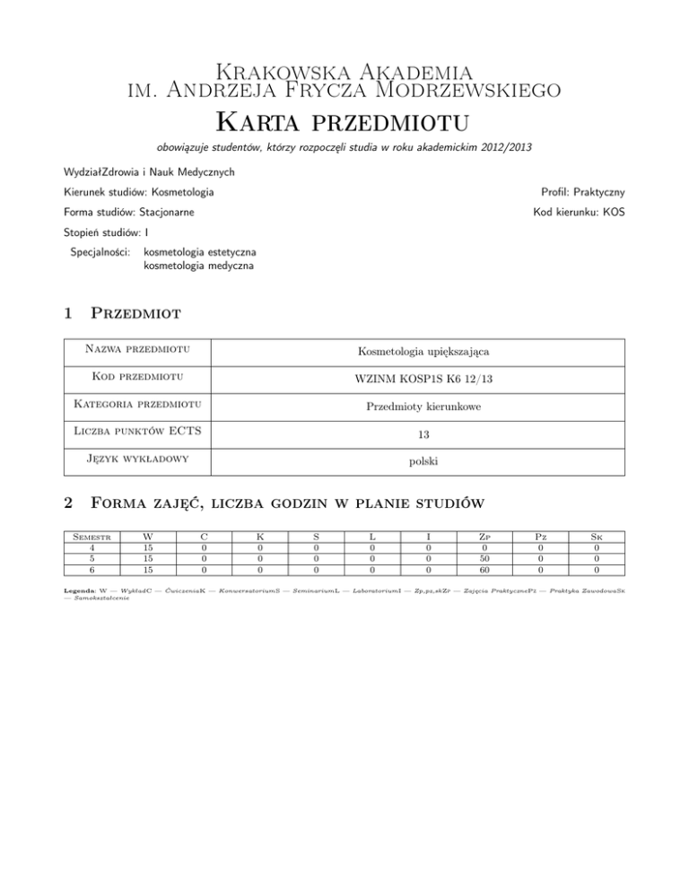 Krakowska Akademia im. Andrzeja Frycza Modrzewskiego Karta przedmiotu obowiązuje studentów, którzy rozpoczęli studia w roku akademickim 2012/2013 WydziałZdrowia i Nauk Medycznych Kierunek studiów: Kosmetologia Profil: Praktyczny Forma studiów: Stacjonarne Kod kierunku: KOS Stopień studiów: I Specjalności: 1 2 kosmetologia estetyczna kosmetologia medyczna Przedmiot Nazwa przedmiotu Kosmetologia upiększająca Kod przedmiotu WZINM KOSP1S K6 12/13 Kategoria przedmiotu Przedmioty kierunkowe Liczba punktów ECTS 13 Język wykładowy polski Forma zajęć, liczba godzin w planie studiów Semestr 4 5 6 W 15 15 15 C 0 0 0 K 0 0 0 S 0 0 0 L 0 0 0 I 0 0 0 Zp 0 50 60 Pz 0 0 0 Sk 0 0 0 Legenda: W — WykładC — ĆwiczeniaK — KonwersatoriumS — SeminariumL — LaboratoriumI — Zp,pz,sk Zp — Zajęcia PraktycznePz — Praktyka ZawodowaSk — Samokształcenie Krakowska Akademia im. Andrzeja Frycza Modrzewskiego 3 Cele przedmiotu Cel 1 Podstawowym celem kształcenia jest przygotowanie do pracy w gabinecie kosmetycznym o pełnym zakresie świadczonych usług w zakresie zabiegów pielęgnacyjnych, upiększających i wspomagających leczenie chorób skóry oraz umiejętność poprawnego wykonania zabiegu kosmetycznego: pielęgnacyjnego, upiększającego i wspomagającego leczenie chorób skóry, z uwzględnieniem wskazań i przeciwwskazań. Cel 2 Przygotowanie do obsługi aparatów i urządzeń stosowanych w kosmetologii pielęgnacyjnej i upiększającej oraz nabycie umiejętności weryfikacji innowacji (w tym technologicznych) wprowadzanych na rynek oraz przygotowanie do współpracy z lekarzem dermatologiem. 4 Wymagania wstępne 1 Wiedza zdobyta w ramach przedmiotu "Kosmetologia pielęgnacyjna". 5 Modułowe efekty kształcenia MW1 znajomość podstawowych technik i metod upiększania, znajomość działania poszczególnych kategorii kosmetyków stosowanych w kosmetologii upiększającej, znajomość charakterystyki kosmetyków upiększających i stosowania zgodnie z rozpoznaniem, znajomość rodzajów zabiegów kosmetycznych upiększających i stosowania kosmetyków zgodnie z rozpoznaniem, znajomość charakterystyki zabiegów kosmetycznych upiększających (z zastosowaniem specjalistycznego sprzętu i aparatury) MW2 znajomość aparatów, narzędzi oraz materiałów zabiegowych właściwych dla zabiegów upiększających, znajomość wskazań i przeciwwskazań do wykonania zabiegów kosmetycznych upiększających (z zastosowaniem specjalistycznego sprzętu i aparatury), znajomość składników czynnych kosmetyków i zastosowania kosmetyków i ich kategorii zgodnie z przeznaczeniem MU3 rozpoznawania zmian na skórze i określenia rodzajów zmian na skórze zorganizowania stanowiska pracy do wykonywania zabiegów upiększających oraz odpowiedniego doboru sprzętu i narzędzi pracy doboru kosmetyków zgodnie z rozpoznanymi zmianami na skórze zastosowania zasad profilaktyki zmian skórnych wykonania zabiegów zmniejszających nadmiar tkanki tłuszczowej wykonania zabiegów redukujących rozstępy skórne wykonania zabiegów antycellulitowych planowania schematów zabiegów upiększających i stosowania kosmetyków zgodnie z przeznaczeniem wykonywanie zabiegów z zakresu kosmetyki upiększającej, z uwzględnieniem wskazań i przeciwwskazań do ich wykonania MK4 potrafi skutecznie i taktownie komunikować się z klientami, zna i stosuje ogólnie przyjęte normy etyczne oraz zasady etyki zawodowej, umie określić i rozpoznać potrzeby i oczekiwania klienta, potrafi być taktowny i skutecznie zasugerować klientowi potrzebę konsultacji medycznej (np. dermatologicznej, fizjoterapeutycznej), okazuje szacunek dla klienta, potrafi taktownie i skutecznie odmówić wykonania zabiegu kosmetycznego w przypadku rozpoznania schorzeń, które stanowią przeciwwskazanie do jego wykonania, potrafi zapewniać pełen komfort psychiczny i fizjonomiczny podczas wykonywania zabiegów kosmetycznych 6 Treści programowe Strona 2/6 Krakowska Akademia im. Andrzeja Frycza Modrzewskiego Lp W1 Wykład Tematyka zajęć Opis szczegółowy bloków tematycznych Przenikanie składników czynnych kosmetyków przez skórę. Fizykalne metody wspomagania transportu transkomórkowego i epidermalnego. Czasowe techniki usuwania nadmiernego owłosienia z uwzględnieniem wskazań i przeciwwskazań. Trwałe techniki usuwania nadmiernego owłosienia z uwzględnieniem wskazań i przeciwwskazań. Peelingi klasyfikacja, wskazania, przeciwwskazania . Podział peelingów w zależności od zastosowanej metody i w zależności od głębokości niszczenia tkanek. Peelingi chemiczne wskazania, przeciwskzania, powikłania. Substancje wykorzystywane w peelingach chemicznych. Peelingi mechaniczne wskazania, przeciwskzania, powikłania. Peelingi fizyczne wskazania, przeciwskzania, powikłania. Peelingi ziołowe wskazania, przeciwskzania, powikłania. Mezoterapia. Mezoterapia bezigłowa (NNM). Wykorzystanie różnych rodzajów energii w kosmetyce. Światło, prąd elektryczny, ultradźwięki, zabiegi ciepło zimno, masaże ręczne w przebiegu różnych stanów kosmetycznych. Zabiegi kosmetyczne z wykorzystaniem fal radiowych. Thermage, Radiage - profesjonalne zabiegi kosmetyczne z wykorzystaniem fal radiowych. Zabiegi kosmetyczne z wykorzystaniem światła. Lampy kosmetyczne. Zabiegi kosmetyczne z wykorzystaniem prądów. Zabiegi kosmetyczne z wykorzystaniem ultradźwięków. Zabiegi kosmetyczne z wykorzystaniem laserów. Nadmierne pocenie typy i etiopatogeneza. Dezodoranty, antyperspiranty, zabiegi gabinetowe i lecznicze w nadmiernej potliwości. Przebarwienia skórne klasyfikacja, przyczyny powstawania. Zabiegi kosmetyczne redukujące hiperpigmentacje - substancje czynne. Profesjonalne zabiegi kosmetyczne redukujące przebarwienia. Środki przyspieszające opalanie i samoopalacze. Solaria. Cellulit etiopatogeneza, klasyfikacja. Profesjonalne zabiegi kosmetyczne antycellulitowe i redukujące cellulit. Postępowanie profilaktyka i pielęgnacja