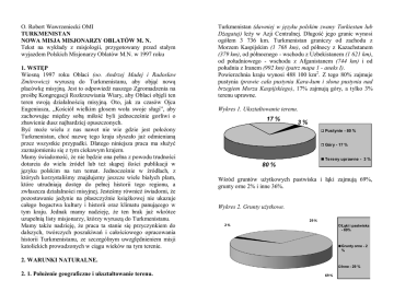 O. Robert Wawrzeniecki OMI TURKMENISTAN NOWA MISJA MISJONARZY OBLATÓW M. N. Tekst na wykłady z misjologii, przygotowany przed stałym wyjazdem Polskich Misjonarzy Oblatów M.N. w 1997 roku 1. WSTĘP Wiosną 1997 roku Oblaci (oo. Andrzej Madej i Radosław Zmitrowicz) wyruszą do Turkmenistanu, aby objąć nową placówkę misyjną. Jest to odpowiedź naszego Zgromadzenia na prośbę Kongregacji Rozkrzewiania Wiary, aby Oblaci objęli ten teren swoją działalnością misyjną. Oto, jak za czasów Ojca Eugeniusza, „Kościół wielkim głosem woła swoje sługi”, aby zachowując między sobą miłość byli jednocześnie gorliwi o zbawienie dusz najbardziej opuszczonych. Być może wielu z nas nawet nie wie gdzie jest położony Turkmenistan, choć nazwę tego kraju słyszało już odmienianą przez wszystkie przypadki. Dlatego niniejsza praca ma służyć zaznajomieniu się z tym ciekawym krajem. Mamy świadomość, że nie będzie ona pełna z powodu trudności dotarcia do wielu źródeł lub też skąpej ilości publikacji w języku polskim na ten temat. Jednocześnie w źródłach, z których korzystaliśmy znajdujemy jeszcze wiele białych plam, które utrudniają dostęp do pełnej historii tego regionu, a zwłaszcza działalności misyjnej. Jesteśmy również świadomi, że pozostawanie jedynie na płaszczyźnie książkowej nie ukazuje całego bogactwa kultury i historii oraz klimatu panującego w tym kraju. Jednak mamy nadzieję, że ten brak już wkrótce uzupełnią listy misjonarzy, którzy wyruszą do Turkmenistanu. Mamy także nadzieję, że praca ta stanie się przyczynkiem do dalszych, twórczych poszukiwań i całościowego opracowania historii Turkmenistanu, ze szczególnym uwzględnieniem misji katolickich prowadzonych w ciągu wieków na tym terenie. Turkmenistan (dawniej w języku polskim zwany Turkiestan lub Dżagataj) leży w Azji Centralnej. Długość jego granic wynosi ogółem 3 736 km. Turkmenistan graniczy od zachodu z Morzem Kaspijskim (1 768 km), od północy z Kazachstanem (379 km), od północnego - wschodu z Uzbekistanem (1 621 km), od południowego - wschodu z Afganistanem (744 km) i od południa z Iranem (992 km) (patrz mapa 1 - aneks I). Powierzchnia kraju wynosi 488 100 km2. Z tego 80% zajmuje pustynia (prawie cała pustynia Kara-kum i słona pustynia nad brzegiem Morza Kaspijskiego), 17% zajmują góry, a tylko 3% terenu uprawne. Wykres 1. Ukształtowanie terenu. 17 % 3% Pustynie - 80 % Góry - 17 % Tereny upraw ne - 3 % 80 % Wśród gruntów użytkowych pastwiska i łąki zajmują 69%, grunty orne 2% i inne 36%. Wykres 2. Grunty użytkowe. 29 % 2% Łąki i pastwiska - 69% Grunty orne - 2 % 2. WARUNKI NATURALNE. Inne - 29 % 2. 1. Położenie geograficzne i ukształtowanie terenu. 69 % Na większości terenu brak powierzchniowej sieci rzecznej. Rzeki (Amu-daria, Murgab, Tedżen i Artek) znajdują się najczęściej przy granicy i odwadniają południowo - wschodnią część kraju. Jednak obecnie prowadzone są działania w celu wykorzystania rzek do nawadniania terenów uprawnych. Służy temu m.in. kanał karakumski nawadniający pustynię. Z większych zbiorników wodnych, oprócz Morza Kaspijskiego, mamy jeszcze jezioro Sarykamyskie. 2. 2. Klimat i roślinność. Turkmenistan leży na pograniczu klimatu podzwrotnikowego i umiarkowanego ciepłego, a klimat jego jest określany jako wybitnie kontynentalny suchy. Opady są bardzo niskie i czasami suma rocznych opadów na tym terenie wynosi tyle, ile jednorazowy deszcz w Europie. W związku z warunkami naturalnymi dominuje roślinność pustynna, choć w górach, które poprzecinane są licznymi wąwozami, można spotkać skrawki lasów liściastych oraz jałowiec. 2. 3. Bogactwa naturalne. Na pustyni Kara - kum odkryto znaczne zasoby ropy naftowej i gazu ziemnego. Będąc jedną z republik byłego ZSRR Turkmenistan pokrywał 11 % wydobycia gazu ziemnego w ZSRR (65,2 mld m3 rocznie). Roczne wydobycie ropy naftowej wynosi 5,3 mln ton. Jak wyliczyli naukowcy złoża te starczą na około 40 lat. W związku z posiadaniem w/w surowców oraz bogatych złóż siarki, soli glauberskiej, jodu, magnezu, a także dzięki samowystarczalności energetycznej, Turkmenistan może liczyć na szybki rozwój. 3. ZALUDNIENIE. 3. 1. Ludność i struktura narodowościowa. Teren Turkmenistanu zamieszkuje 4 075 316 ludności (wg badań w roku 2010 będzie ich około 6 000 000 ludności). Wykres 3. Przyrost liczby ludności. 6000000 5000000 4000000 3600000 3000000 2000000 4075316 1000000 6000000 0 1991 1995 2010 Ludność stanowi prawdziwą mozaikę narodowościową: Turkmenii (73,3%), Rosjanie (9,8 %), Uzbecy (9%), Kazachowie (2%) oraz inne narodowości (5,3 %): Tatarzy, Ukraińcy, Azerbejdżanie, Ormianie, Białorusini oraz osoby polskiego pochodzenia (ok. 2000). Wykres 4. Struktura narodowościowa ludności. 100 % 10000% Turkm enii - 73,3 % Rosjanie - 9,8 % 50 % 1000% Uzbecy - 9 % Inne narodow ości - 5,25 % 100% 0 % 73,3% Polskiego pochodzenia - 0,05 % 9% 0,05% Gęstość zaludnienia wynosi 7,8 / km2,a przy obecnym przyroście naturalnym 1,97%, w roku 2010 osiągnie poziom 12,3 / km2. Średnia wieku przedstawia się następująco: 0 - 15 lat (40%), od 16 - 65 lat (56%) i powyżej 65 lat (4 %). Jak więc z tego wynika jest to społeczeństwo bardzo młode i rozwijające się. Wykres 5. Średnia wieku społeczeństwa. 50 40 30 0 - 15 lat - 40 % 20 16 - 65 lat - 56 % 10 pow yżej 65 lat - 4 % 0 40% 56% 4% 3. 2. Zajęcia ludności. Większość (ok. 70%) pędzi życie osiadłe i zajmuje się rolnictwem oraz hodowlą zwierząt. Dlatego przeważnie ludność skupiona jest w dużych oazach w dolinach rzek oraz na wybrzeżu Morza Kaspijskiego. Zatrudnienie w przemyśle i budownictwie znajduje 20%, w rolnictwie i leśnictwie 44%, a w innych 36% obywateli Turkmenistanu. Wykres 6. Zatrudnienie. 36 % 20 % Przemysł i budownictwo - 20 % Rolnictwo i leśnictwo - 44 % Inne - 36 % 44 % 3. 3. Tradycyjne stosunki międzyludzkie. Ludz
