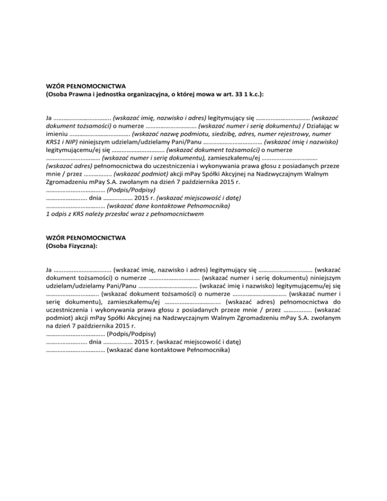 WZÓR PEŁNOMOCNICTWA (Osoba Prawna i jednostka organizacyjna, o której mowa w art. 33 1 k.c.): Ja …………………………….. (wskazać imię, nazwisko i adres) legitymujący się …………………………… (wskazać dokument tożsamości) o numerze …………………………. (wskazać numer i serię dokumentu) / Działając w imieniu ………………………………. (wskazać nazwę podmiotu, siedzibę, adres, numer rejestrowy, numer KRS1 i NIP) niniejszym udzielam/udzielamy Pani/Panu ……………………………… (wskazać imię i nazwisko) legitymującemu/ej się ………………………….. (wskazać dokument tożsamości) o numerze …………………………… (wskazać numer i serię dokumentu), zamieszkałemu/ej ……………………………. (wskazać adres) pełnomocnictwa do uczestniczenia i wykonywania prawa głosu z posiadanych przeze mnie / przez …………….. (wskazać podmiot) akcji mPay Spółki Akcyjnej na Nadzwyczajnym Walnym Zgromadzeniu mPay S.A. zwołanym na dzień 7 października 2015 r. ……………………………… (Podpis/Podpisy) ……………………. dnia ……………… 2015 r. (wskazać miejscowość i datę) ……………………………… (wskazać dane kontaktowe Pełnomocnika) 1 odpis z KRS należy przesłać wraz z pełnomocnictwem WZÓR PEŁNOMOCNICTWA (Osoba Fizyczna): Ja …………………………….. (wskazać imię, nazwisko i adres) legitymujący się …………………………… (wskazać dokument tożsamości) o numerze …………………………. (wskazać numer i serię dokumentu) niniejszym udzielam/udzielamy Pani/Panu ……………………………… (wskazać imię i nazwisko) legitymującemu/ej się ………………………….. (wskazać dokument tożsamości) o numerze …………………………… (wskazać numer i serię dokumentu), zamieszkałemu/ej ……………………………. (wskazać adres) pełnomocnictwa do uczestniczenia i wykonywania prawa głosu z posiadanych przeze mnie / przez …………….. (wskazać podmiot) akcji mPay Spółki Akcyjnej na Nadzwyczajnym Walnym Zgromadzeniu mPay S.A. zwołanym na dzień 7 października 2015 r. ……………………………… (Podpis/Podpisy) ……………………. dnia ……………… 2015 r. (wskazać miejscowość i datę) ……………………………… (wskazać dane kontaktowe Pełnomocnika)