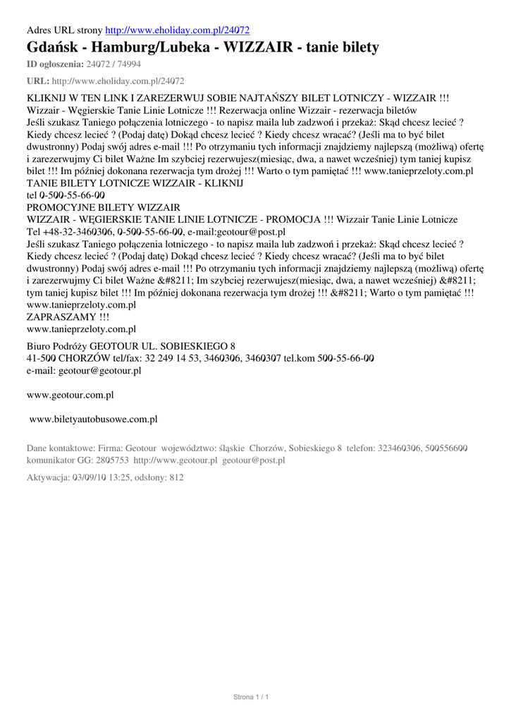 Adres URL strony http://www.eholiday.com.pl/24072 Gdańsk - Hamburg/Lubeka - WIZZAIR - tanie bilety ID ogłoszenia: 24072 / 74994 URL: http://www.eholiday.com.pl/24072 KLIKNIJ W TEN LINK I ZAREZERWUJ SOBIE NAJTAŃSZY BILET LOTNICZY - WIZZAIR !!! Wizzair - Węgierskie Tanie Linie Lotnicze !!! Rezerwacja online Wizzair - rezerwacja biletów Jeśli szukasz Taniego połączenia lotniczego - to napisz maila lub zadzwoń i przekaż: Skąd chcesz lecieć ? Kiedy chcesz lecieć ? (Podaj datę) Dokąd chcesz lecieć ? Kiedy chcesz wracać? (Jeśli ma to być bilet dwustronny) Podaj swój adres e-mail !!! Po otrzymaniu tych informacji znajdziemy najlepszą (możliwą) ofertę i zarezerwujmy Ci bilet Ważne Im szybciej rezerwujesz(miesiąc, dwa, a nawet wcześniej) tym taniej kupisz bilet !!! Im później dokonana rezerwacja tym drożej !!! Warto o tym pamiętać !!! www.tanieprzeloty.com.pl TANIE BILETY LOTNICZE WIZZAIR - KLIKNIJ tel 0-500-55-66-00 PROMOCYJNE BILETY WIZZAIR WIZZAIR - WĘGIERSKIE TANIE LINIE LOTNICZE - PROMOCJA !!! Wizzair Tanie Linie Lotnicze Tel +48-32-3460306, 0-500-55-66-00, e-mail:[email protected] Jeśli szukasz Taniego połączenia lotniczego - to napisz maila lub zadzwoń i przekaż: Skąd chcesz lecieć ? Kiedy chcesz lecieć ? (Podaj datę) Dokąd chcesz lecieć ? Kiedy chcesz wracać? (Jeśli ma to być bilet dwustronny) Podaj swój adres e-mail !!! Po otrzymaniu tych informacji znajdziemy najlepszą (możliwą) ofertę i zarezerwujmy Ci bilet Ważne – Im szybciej rezerwujesz(miesiąc, dwa, a nawet wcześniej) – tym taniej kupisz bilet !!! Im później dokonana rezerwacja tym drożej !!! – Warto o tym pamiętać !!! www.tanieprzeloty.com.pl ZAPRASZAMY !!! www.tanieprzeloty.com.pl Biuro Podróży GEOTOUR UL. SOBIESKIEGO 8 41-500 CHORZÓW tel/fax: 32 249 14 53, 3460306, 3460307 tel.kom 500-55-66-00 e-mail: [email protected] www.geotour.com.pl www.biletyautobusowe.com.pl Dane kontaktowe: Firma: Geotour województwo: śląskie Chorzów, Sobieskiego 8 telefon: 323460306, 500556600 komunikator GG: 2805753 http://www.geotour.pl [email protected] Aktywacja: 03/09/10 13:25, odsłony: 812 Strona 1 / 1