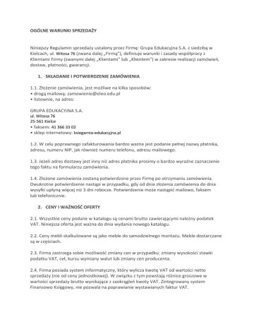 OGÓLNE WARUNKI SPRZEDAŻY Niniejszy Regulamin sprzedaży ustalony przez Firmę: Grupa Edukacyjna S.A. z siedzibą w Kielcach, ul. Witosa 76 (zwana dalej „Firmą”), definiuje warunki i zasady współpracy z Klientami Firmy (zwanymi dalej „Klientami” lub „Klientem”) w zakresie realizacji zamówień, dostaw, płatności, gwarancji. 1. SKŁADANIE I POTWIERDZENIE ZAMÓWIENIA 1.1. Złożenie zamówienia, jest możliwe na kilka sposobów: • drogą mailową: [email protected] • listownie, na adres: GRUPA EDUKACYJNA S.A. ul. Witosa 76 25-561 Kielce • faksem: 41 366 33 02 • sklep internetowy: ksiegarnia-edukacyjna.pl 1.2. W celu poprawnego zafakturowania bardzo ważne jest podanie pełnej nazwy płatnika, adresu, numeru NIP, jak również numeru telefonu, adresu mailowego. 1.3. Jeżeli adres dostawy jest inny niż adres płatnika prosimy o bardzo wyraźne zaznaczenie tego faktu na formularzu zamówienia. 1.4. Złożone zamówienia zostaną potwierdzone przez Firmę po otrzymaniu zamówienia. Dwukrotne potwierdzenie nastąpi w przypadku, gdy od dnia złożenia zamówienia do dnia wysyłki upłyną więcej niż 3 dni robocze. Potwierdzenie może nastąpić mailowo, faksem lub telefonicznie. 2. CENY I WAŻNOŚĆ OFERTY 2.1. Wszystkie ceny podane w katalogu są cenami brutto zawierającymi należny podatek VAT. Niniejsza oferta jest ważna do dnia wydania nowego katalogu. 2.2. Ceny mebli skalkulowane są jako meble do samodzielnego montażu. Meble dostarczane są w częściach. 2.3. Firma zastrzega sobie możliwość zmiany cen w przypadku: zmiany wysokości stawki podatku VAT, ceł, kursu wymiany walut lub zmiany cen producenta. 2.4. Firma posiada system informatyczny, który wylicza kwotę VAT od wartości netto sprzedaży (nie od ceny jednostkowej). W związku z tym powstają różnice groszowe w wartości sprzedaży brutto wynikające z zaokrągleń kwoty VAT. Zintegrowany system Finansowo Księgowy, nie pozwala na poprawianie wystawianych faktur VAT. 2.5. Firma zastrzega sobie prawo do wycofania produktu z oferty bez uprzedniego zawiadomienia. 2.6. Firma zastrzega sobie prawo do wprowadzenia zmian technicznych, kolorystycznych w czasie obowiązywania niniejszego katalogu. Zmiany wynikają z potrzeby i chęci ciągłego udoskonalania produktów. 2.7. Produkt dostarczony może nieznacznie różnic się wyglądem od przedstawionych na zdjęciach w katalogu. 2.8. Firma nie ponosi odpowiedzialności za wszelkie błędy powstałe podczas składu i druku niniejszego katalogu (np. pomyłka w indeksie, cenie, opisie zawartości, rozmiarów itp.) 3. KOSZTY DOSTAWY 3.1. Wszystkie paczki wysyłamy wyłącznie za pośrednictwem firmy kurierskiej. 3.2. Koszty dostawy do miejsc znajdujących się na terytorium RP zależą od wartości zamówienia: • zamówienie do 500 zł – doliczane jest 25 zł brutto • zamówienie od 500 zł – bezpłatny transport Za koszty dostawy do miejsc znajdujących się poza terytorium RP uważa się koszty rzeczywiście poniesione. 3.3. Koszt dostawy umieszczany jest na fakturze. 4. WARUNKI PŁATNOŚCI 4.1. Placówkom publicznym (szkoły, przedszkola, ośrodki szkolno-wychowawcze, PSOUU) i stałym Klientom oferujemy 7-dniowy termin płatności, ewentualnie płatność przy odbiorze. 4.2. W przypadku nieuregulowania płatności w przewidzianym terminie, zostaną naliczone ustawowe odsetki. 4.3. W przypadku opóźnień w płatnościach, za każde upomnienie/wezwanie do zapłaty Firma będzie naliczać i obciążać Klienta dodatkowo kwotą 50,00zł (pięćdziesięciu złotych) kosztów manipulacyjnych. 4.4. Do czasu wypełnienia wszelkich zobowiązań Klienta towar pozostaje własnością Firmy. 4.5. W przypadku zamówień od klientów indywidualnych, stowarzyszeń, fundacji, firm możliwe są dwie standardowe formy płatności: • przedpłata (100% wartości) na konto przed realizacją zamówienia (wybierając tę opcję, klient dokonuje przelewu na podstawie dokumentu proforma, którą otrzymuje na skrzynkę mailową), • za pobraniem (płatność przy odbiorze przesyłki) 4.6. Do każdej dostawy wystawiamy fakturę VAT, którą umieszczamy w przesyłce lub przesyłamy listownie. 5. REALIZACJA ZAMÓWIENIA 5.1. Dostawa powinna nastąpić w terminie od 3 do 14 dni od daty potwierdzenia złożenia zamówienia. 5.2. W przypadku produktów z kategorii wyposażenia wnętrz (np. mebli) dostawa powinna nastąpić do 6 tygodni. 5.3. W przypadku dużej ilości zamówień, terminy mogą ulec wydłużeniu. 5.4. Zastrzegamy sobie prawo do odmowy realizacji zamówienia z przyczyn technicznych lub wyczerpania zapasów magazynowych. 5.5. W przypadku wystąpienia okoliczności niezależnych od Firmy uniemożliwiających całkowicie lub czasowo realizację złożonego zamówienia, Firma zastrzega sobie prawo do wstrzymania realizacji zamówienia oraz zobowiązuje się niezwłocznie powiadomić o zaistniałej sytuacji Klienta. 6. ODBIÓR PRZESYŁKI 6.1. W chwili otrzymania przesyłki prosimy o dokładne sprawdzenie ilości dostarczonego towaru, a także stanu opakowań. Weryfikacji dostarczonych ilości można dokonać porównując zawartość przesyłki z załączoną fakturą lub listem przewozowym. 6.2. Jeżeli zostały stwierdzone jakiekolwiek niezgodności (brak paczki, uszkodzenie paczki) należy wpisać szczegółowe uwagi w liście przewozowym (bądź spisać protokół szkody) w obecności kuriera. Adnotacje są niezbędne do wszczęcia procedury reklamacyjnej. 7. REKLAMACJE 7.1. Reklamacje przyjmowane są tylko i wyłącznie w formie pisemnej lub faksem, e-mailem oraz listownie na formularzu reklamacyjnym. 7.2. Reklamacje jakościowe przyjmowane są w terminie nie dłuższym niż 7 dni od daty otrzymania przesyłki. 7.3. Reklamacje nie ujęte w liście przewozowym, bądź protokole szkody, w przypadku gdy podczas odbioru zostały stwierdzone jakiekolwiek niezgodności (pkt. 6.2.) nie będą rozpatrywane. 7.4. Reklamacje ilościowe w zrealizowanych zamówieniach n
