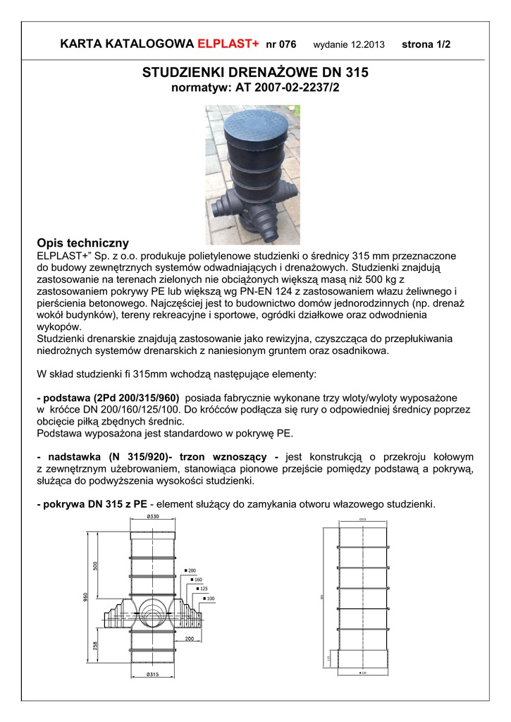 KARTA KATALOGOWA ELPLAST+ nr 076 wydanie 12.2013 strona 1/2 STUDZIENKI DRENAŻOWE DN 315 normatyw: AT 2007-02-2237/2 Opis techniczny ELPLAST+” Sp. z o.o. produkuje polietylenowe studzienki o średnicy 315 mm przeznaczone do budowy zewnętrznych systemów odwadniających i drenażowych. Studzienki znajdują zastosowanie na terenach zielonych nie obciążonych większą masą niż 500 kg z zastosowaniem pokrywy PE lub większą wg PN-EN 124 z zastosowaniem włazu żeliwnego i pierścienia betonowego. Najczęściej jest to budownictwo domów jednorodzinnych (np. drenaż wokół budynków), tereny rekreacyjne i sportowe, ogródki działkowe oraz odwodnienia wykopów. Studzienki drenarskie znajdują zastosowanie jako rewizyjna, czyszcząca do przepłukiwania niedrożnych systemów drenarskich z naniesionym gruntem oraz osadnikowa. W skład studzienki fi 315mm wchodzą następujące elementy: - podstawa (2Pd 200/315/960) posiada fabrycznie wykonane trzy wloty/wyloty wyposażone w króćce DN 200/160/125/100. Do króćców podłącza się rury o odpowiedniej średnicy poprzez obcięcie piłką zbędnych średnic. Podstawa wyposażona jest standardowo w pokrywę PE. - nadstawka (N 315/920)- trzon wznoszący - jest konstrukcją o przekroju kołowym z zewnętrznym użebrowaniem, stanowiąca pionowe przejście pomiędzy podstawą a pokrywą, służąca do podwyższenia wysokości studzienki. - pokrywa DN 315 z PE - element służący do zamykania otworu włazowego studzienki. O315 200 160 115 100 920 125 330 KARTA KATALOGOWA ELPLAST+ nr 076 wydanie 12.2013 strona 2/2 Studzienki drenarskie Ø315 firmy Elplast+ posiadają wiele zalet wyróżniających nas na rynku spośród innych producentów. Zalety studzienek drenażowych DN 315 Elplast + : uniwersalność studzienek możliwość podłączenia bez żadnych redukcji wszystkich średnic rur drenarskich DN100 , DN125 , DN160 , DN200 brak potrzeby stosowania uszczelek gumowych jeden wyrób 3 zastosowania studnia rewizyjna , czyszcząca , osadnikowa mały ciężar wyrobu i elementów możliwość prostego dostosowania wysokości wyrobu bezpośrednio na budowie – dzięki nadstawce H=1000 mm jedyne narzędzie potrzebne do odpowiedniego zamontowania studni to najzwyklejsza piłka ręczna np. do metalu elastyczność odporność na korozję chemiczną bardzo duża odporność na działanie agresywnych ścieków, agresywnych oraz zanieczyszczonych wód gruntowych nietoksyczność dla środowiska najwyższa odporność na ścieranie niski koszt inwestycji szybki i łatwy montaż możliwość montażu studzienek bez konieczności użycia ciężkiego sprzętu, co obniża koszty inwestycji Dokumenty związane: Aprobata Techniczna IBDiM AT/2007-02-2237/2 Deklaracja zgodności nr 12b Cennik – ceny wg indywidualnych uzgodnień