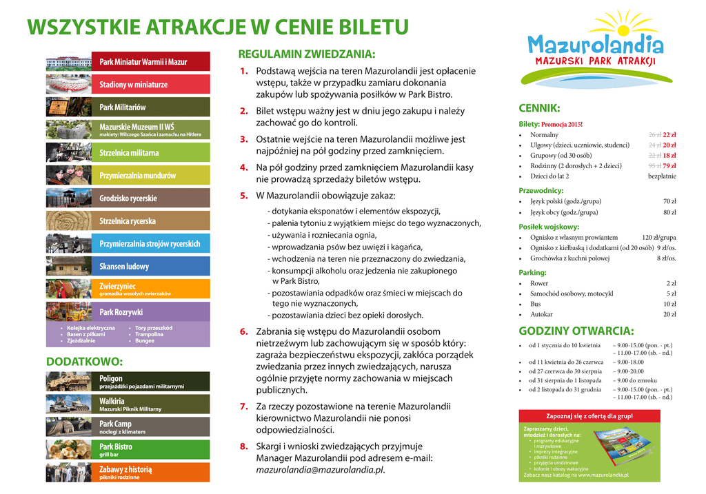 WSZYSTKIE ATRAKCJE W CENIE BILETU Park Miniatur Warmii i Mazur Stadiony w miniaturze Park Militariów REGULAMIN ZWIEDZANIA: 1. Podstawą wejścia na teren Mazurolandii jest opłacenie wstępu, także w przypadku zamiaru dokonania zakupów lub spożywania posiłków w Park Bistro. Mazurskie Muzeum II WŚ 2. Bilet wstępu ważny jest w dniu jego zakupu i należy zachować go do kontroli. Strzelnica militarna 3. Ostatnie wejście na teren Mazurolandii możliwe jest najpóźniej na pół godziny przed zamknięciem. Przymierzalnia mundurów 4. Na pół godziny przed zamknięciem Mazurolandii kasy nie prowadzą sprzedaży biletów wstępu. makiety: Wilczego Szańca i zamachu na Hitlera Grodzisko rycerskie Strzelnica rycerska Przymierzalnia strojów rycerskich Skansen ludowy Zwierzyniec gromadka wesołych zwierzaków Park Rozrywki • Kolejka elektryczna • Basen z piłkami • Zjeżdżalnie • Tory przeszkód • Trampolina • Bungee DODATKOWO: Poligon przejażdżki pojazdami militarnymi Walkiria Mazurski Piknik Militarny Park Camp noclegi z klimatem Park Bistro grill bar Zabawy z historią pikniki rodzinne 5. W Mazurolandii obowiązuje zakaz: - dotykania eksponatów i elementów ekspozycji, - palenia tytoniu z wyjątkiem miejsc do tego wyznaczonych, - używania i rozniecania ognia, - wprowadzania psów bez uwięzi i kagańca, - wchodzenia na teren nie przeznaczony do zwiedzania, - konsumpcji alkoholu oraz jedzenia nie zakupionego w Park Bistro, - pozostawiania odpadków oraz śmieci w miejscach do tego nie wyznaczonych, - pozostawiania dzieci bez opieki dorosłych. 6. Zabrania się wstępu do Mazurolandii osobom nietrzeźwym lub zachowującym się w sposób który: zagraża bezpieczeństwu ekspozycji, zakłóca porządek zwiedzania przez innych zwiedzających, narusza ogólnie przyjęte normy zachowania w miejscach publicznych. 7. Za rzeczy pozostawione na terenie Mazurolandii kierownictwo Mazurolandii nie ponosi odpowiedzialności. 8. Skargi i wnioski zwiedzających przyjmuje Manager Mazurolandii pod adresem e-mail: [email protected]. CENNIK: Bilety: Promocja 2015! • • • • • Normalny Ulgowy (dzieci, uczniowie, studenci) Grupowy (od 30 osób) Rodzinny (2 dorosłych + 2 dzieci) Dzieci do lat 2 26 zł 22 zł 24 zł 20 zł 22 zł 18 zł 95 zł 79 zł bezpłatnie Przewodnicy: • Język polski (godz./grupa) 70 zł • Język obcy (godz./grupa) 80 zł Posiłek wojskowy: • • • Ognisko z własnym prowiantem 120 zł/grupa Ognisko z kiełbaską i dodatkami (od 20 osób) 9 zł/os. Grochówka z kuchni polowej 8 zł/os. Parking: • • • • Rower Samochód osobowy, motocykl Bus Autokar 2 zł 5 zł 10 zł 20 zł GODZINY OTWARCIA: • • • • • od 1 stycznia do 10 kwietnia od 11 kwietnia do 26 czerwca od 27 czerwca do 30 sierpnia od 31 sierpnia do 1 listopada od 2 listopada do 31 grudnia – 9.00-15.00 (pon. - pt.) – 11.00-17.00 (sb. - nd.) – 9.00-18.00 – 9.00-20.00 – 9.00 do zmroku – 9.00-15.00 (pon. - pt.) – 11.00-17.00 (sb. - nd.) Zapoznaj się z ofertą dla grup! Zapraszamy dzieci, młodzież i dorosłych na: • programy edukacyjne i rozrywkowe • imprezy integracyjne • pikniki rodzinne • przyjęcia urodzinowe • kolonie i obozy wakacyjne Zobacz nasz katalog na www.mazurolandia.pl
