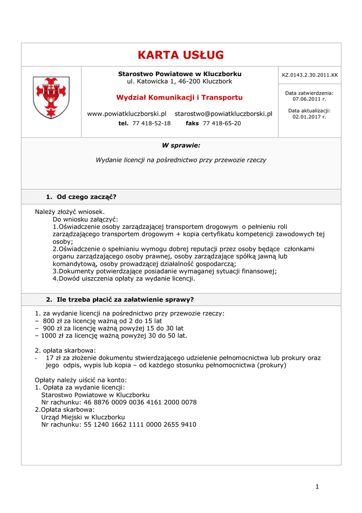 KARTA USŁUG Starostwo Powiatowe w Kluczborku ul. Katowicka 1, 46-200 Kluczbork Wydział Komunikacji i Transportu www.powiatkluczborski.pl tel. 77 418-52-18 [email protected] KZ.0143.2.30.2011.KK Data zatwierdzenia: 07.06.2011 r. Data aktualizacji: 02.01.2017 r. faks 77 418-65-20 W sprawie: Wydanie licencji na pośrednictwo przy przewozie rzeczy 1. Od czego zacząć? Należy złożyć wniosek. Do wniosku załączyć: 1.Oświadczenie osoby zarządzającej transportem drogowym o pełnieniu roli zarządzającego transportem drogowym + kopia certyfikatu kompetencji zawodowych tej osoby; 2.Oświadczenie o spełnianiu wymogu dobrej reputacji przez osoby będące członkami organu zarządzającego osoby prawnej, osoby zarządzające spółką jawną lub komandytową, osoby prowadzącej działalność gospodarczą; 3.Dokumenty potwierdzające posiadanie wymaganej sytuacji finansowej; 4.Dowód uiszczenia opłaty za wydanie licencji. 2. Ile trzeba płacić za załatwienie sprawy? 1. za wydanie licencji na pośrednictwo przy przewozie rzeczy: – 800 zł za licencję ważną od 2 do 15 lat – 900 zł za licencję ważną powyżej 15 do 30 lat – 1000 zł za licencję ważną powyżej 30 do 50 lat. 2. opłata skarbowa: - 17 zł za złożenie dokumentu stwierdzającego udzielenie pełnomocnictwa lub prokury oraz jego odpis, wypis lub kopia – od każdego stosunku pełnomocnictwa (prokury) Opłaty należy uiścić na konto: 1. Opłata za wydanie licencji: Starostwo Powiatowe w Kluczborku Nr rachunku: 46 8876 0009 0036 4161 2000 0078 2.Opłata skarbowa: Urząd Miejski w Kluczborku Nr rachunku: 55 1240 1662 1111 0000 2655 9410 1 • 3. Wydział odpowiedzialny za załatwienie sprawy: Wydział Komunikacji i Transportu (tel. 77 418-52-18 wew. 137) 4. Jak długo czeka się na załatwienie sprawy? Zgodnie z art. 35 kpa załatwienie sprawy następuje niezwłocznie. W przypadku sprawy wymagającej postępowania wyjaśniającego załatwienie następuje nie później niż w ciągu miesiąca a sprawy szczególnie skomplikowanej - nie później niż w ciągu dwóch miesięcy od dnia wszczęcia postępowania. 5. W jaki sposób odebrać dokument kończący sprawę? Odbioru dokumentów pełnomocnictwo. dokonuje osobiście wnioskodawca lub osoba posiadająca 6. Przepisy prawne obowiązujące przy postępowaniu w danej sprawie: 1. Ustawa z dnia 6 września 2001 r. o transporcie drogowym 2. Ustawa z dnia 16 listopada 2006 r. o opłacie skarbowej 3. Rozporządzenie Ministra Transportu, Budownictwa i Gospodarki Morskiej z dnia 6 sierpnia 2013r.w sprawie wysokości opłat za czynności administracyjne związane z wykonywaniem przewozu drogowego oraz za egzaminowanie i wydawanie certyfikatu kompetencji zawodowych 4. Rozporządzenie Ministra Transportu, Budownictwa i Gospodarki Morskiej z dnia 18 czerwca 2013 r. w sprawie wzorów zezwolenia na wykonywanie zawodu przewoźnika drogowego i wzorów licencji na wykonywanie transportu drogowego oraz wypisów z tych dokumentów 7. O czym wnioskodawca wiedzieć powinien? Przedsiębiorca musi udokumentować sytuację finansową zapewniającą podjęcie i prowadzenie działalności gospodarczej w zakresie transportu drogowego określonej dostępnymi środkami finansowymi lub majątkiem w wysokości 50.000 euro. Wymóg potwierdza się: 1) rocznym sprawozdaniem finansowym; 2) dokumentami potwierdzającymi: a) dysponowanie środkami pieniężnymi w gotówce lub na rachunkach bankowych lub dostępnymi aktywami, b) posiadanie akcji, udziałów lub innych zbywalnych papierów wartościowych, c) udzielenie gwarancji lub poręczeń bankowych, d) własność nieruchomości. Przy ocenie sytuacji finansowej stosuje się kurs średni ogłaszany przez Narodowy Bank Polski, obowiązujący w ostatnim dniu roku poprzedzającego rok, w którym ocena ta jest dokonywana. 8. Co przysługuje wnioskodawcy? § § Skarga, Na podstawie art. 127 § 2 i art. 129 kpa stronie służy prawo wniesienia odwołania do Samorządowego Kolegium Odwoławczego w Opolu za pośrednictwem Starosty Kluczborskiego w terminie 14 dni od dnia doręczenia decyzji. 9. Wzór wniosku do pobrania: W Wydziale Komunikacji i Transportu, pokój nr 08 oraz na stronie internetowej powiatu kluczborskiego pod adresem: www.powiatkluczborski.pl. 2 • DODATKOWE UWAGI: Wymaganych opłat można dokonać w Punkcie Kasowym zlokalizowanym na parterze obok Wydziału Komunikacji i Transportu. Godziny otwarcia Punktu Kasowego: Poniedziałek: 8.00 – 15.30 Wtorek – Piątek: 7.30 – 14.30 Godziny przyjmowania Interesantów w Wydziale Komunikacji i Transportu: Poniedziałek – Piątek godz. 8.00 – 15.00 Opracowała: Kornelia Krakowiak Zatwierdził: Norbert Barcz 3 •
