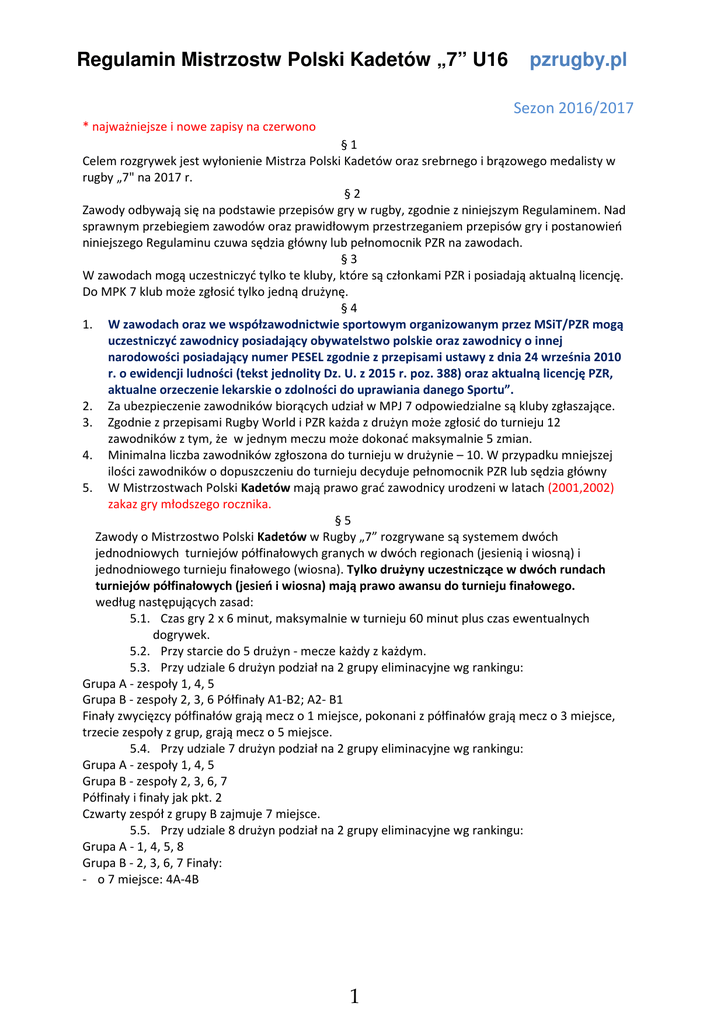 Regulamin Mistrzostw Polski Kadetów „7” U16 pzrugby.pl Sezon 2016/2017 * najważniejsze i nowe zapisy na czerwono §1 Celem rozgrywek jest wyłonienie Mistrza Polski Kadetów oraz srebrnego i brązowego medalisty w rugby „7" na 2017 r. §2 Zawody odbywają się na podstawie przepisów gry w rugby, zgodnie z niniejszym Regulaminem. Nad sprawnym przebiegiem zawodów oraz prawidłowym przestrzeganiem przepisów gry i postanowień niniejszego Regulaminu czuwa sędzia główny lub pełnomocnik PZR na zawodach. §3 W zawodach mogą uczestniczyć tylko te kluby, które są członkami PZR i posiadają aktualną licencję. Do MPK 7 klub może zgłosić tylko jedną drużynę. §4 1. W zawodach oraz we współzawodnictwie sportowym organizowanym przez MSiT/PZR mogą uczestniczyć zawodnicy posiadający obywatelstwo polskie oraz zawodnicy o innej narodowości posiadający numer PESEL zgodnie z przepisami ustawy z dnia 24 września 2010 r. o ewidencji ludności (tekst jednolity Dz. U. z 2015 r. poz. 388) oraz aktualną licencję PZR, aktualne orzeczenie lekarskie o zdolności do uprawiania danego Sportu”. 2. Za ubezpieczenie zawodników biorących udział w MPJ 7 odpowiedzialne są kluby zgłaszające. 3. Zgodnie z przepisami Rugby World i PZR każda z drużyn może zgłosić do turnieju 12 zawodników z tym, że w jednym meczu może dokonać maksymalnie 5 zmian. 4. Minimalna liczba zawodników zgłoszona do turnieju w drużynie – 10. W przypadku mniejszej ilości zawodników o dopuszczeniu do turnieju decyduje pełnomocnik PZR lub sędzia główny 5. W Mistrzostwach Polski Kadetów mają prawo grać zawodnicy urodzeni w latach (2001,2002) zakaz gry młodszego rocznika. §5 Zawody o Mistrzostwo Polski Kadetów w Rugby „7” rozgrywane są systemem dwóch jednodniowych turniejów półfinałowych granych w dwóch regionach (jesienią i wiosną) i jednodniowego turnieju finałowego (wiosna). Tylko drużyny uczestniczące w dwóch rundach turniejów półfinałowych (jesień i wiosna) mają prawo awansu do turnieju finałowego. według następujących zasad: 5.1. Czas gry 2 x 6 minut, maksymalnie w turnieju 60 minut plus czas ewentualnych dogrywek. 5.2. Przy starcie do 5 drużyn - mecze każdy z każdym. 5.3. Przy udziale 6 drużyn podział na 2 grupy eliminacyjne wg rankingu: Grupa A - zespoły 1, 4, 5 Grupa B - zespoły 2, 3, 6 Półfinały A1-B2; A2- B1 Finały zwycięzcy półfinałów grają mecz o 1 miejsce, pokonani z półfinałów grają mecz o 3 miejsce, trzecie zespoły z grup, grają mecz o 5 miejsce. 5.4. Przy udziale 7 drużyn podział na 2 grupy eliminacyjne wg rankingu: Grupa A - zespoły 1, 4, 5 Grupa B - zespoły 2, 3, 6, 7 Półfinały i finały jak pkt. 2 Czwarty zespół z grupy B zajmuje 7 miejsce. 5.5. Przy udziale 8 drużyn podział na 2 grupy eliminacyjne wg rankingu: Grupa A - 1, 4, 5, 8 Grupa B - 2, 3, 6, 7 Finały: - o 7 miejsce: 4A-4B 1 Regulamin Mistrzostw Polski Kadetów „7” U16 pzrugby.pl - o 5 miejsce: 3A-3B - o 3 miejsce: 2A-2B - o 1 miejsce: 1A-1B Jeżeli do turnieju półfinałowego zgłosi się więcej niż 8 drużyn o sposobie jego rozegrania zadecyduje pełnomocnik PZR lub sędzia główny. §6 O kolejności miejsc w grupach decydują: 1. Suma dużych punktów (3 pkt. za wygraną, 2 pkt. za remis, 1 pkt. za porażkę). 2. Wynik bezpośredniego spotkania (w przypadku trzech i więcej drużyn sporządza się małą tabelę dotyczącą wyników drużyn zainteresowanych). 3. Lepsza różnica małych punktów. 4. Więcej zdobytych punktów. 5. Mniejsza liczba wykluczeń (ze wszystkich meczów). 6. Mniejsza liczba upomnień (ze wszystkich meczów). 7. Losowanie. 8. Warunkiem udziału w turnieju finałowym Mistrzostw Polski Kadetów jest uczestnictwo w obydwu turniejach półfinałowych (jesień i wiosna) §7 Zespoły, które przystępują do turnieju otrzymują numery zgodnie z miejscami zajętymi w Mistrzostwami Polski Kadetów „7" z roku 2016 następnie wg miejsc zajętych w Turnieju Finałowym o Mistrzostwo Polski Kadetów w Rugby 15. Jeżeli zgłoszą się drużyny, które nie uczestniczyły w/w rozgrywkach ich numery będą losowane. §8 W przypadku remisu w meczach, w których musi być wyłoniony zwycięzca (finały, półfinały, itp.), zarządzana jest dogrywka 5 min. do pierwszych punktów. Jeżeli i ona nie da rozstrzygnięcia to zarządza się kolejną aż do skutku: §9 1. Podział drużyn w turniejach półfinałowych: Podział na grupy określi Polski Związek Rugby na wniosek Komisarza rozgrywek po zamknięciu listy zgłoszeń. 2. Do turnieju finałowego prawo awansu ma 8 zespołów wyłonionych w turniejach półfinałowych . 3. Liczba drużyn uzyskujących awans z poszczególnych półfinałów do turnieju finałowego uzależniona jest od liczby zespołów rywalizujących turniejach półfinałowych. 4. W razie rezygnacji którejś drużyny z gry w turnieju finałowym jej miejsce zajmuje drużyna, która zajęła kolejną pozycję w tym półfinale, z którego ona awansowała. 5. Rezygnacja z gry w turnieju może nastąpić nie później niż na 7 dni przed jego rozpoczęciem, w innym przypadku na klub zostanie nałożona kara finansowa w wysokości 1000 zł. 6. Trener prowadzący drużynę (wpisany do protokółu turniejowego) musi posiadać ważną licencję trenerską PZR. Wykaz licencji trenerskich - http://pzrugby.pl/download/13/type/page 7. Brak uprawnień powoduje odmowe dopuszczenia drużyny do meczu/turnieju oraz przyznanie walkowera drużynie przeciwnej. O odmowie dopuszczenia decyduje sędzia główny zawodów. § 11 System rozgrywania turnieju finałowego - dwie grupy A i B - w grupach mecze każdy z każdym - mecze finałowe o miejsca Grupa A - 1, 4, 5, 8 Grupa B - 2, 3, 6, 7 Finały: 2 Regulamin Mistrzostw Polski Kadetów „7” U16 - pzrugby.pl o 7 miejsce: 4A-4B o 5 miejsce: 3A-3B o 3 miejsce: 2A-2B o 1 miejsce: 1A-1B § 12 1. Zwycięzca turnieju finałowego otrzymuje tytuł Mistrza Polski Kadetów w rugby 7 na 2017 