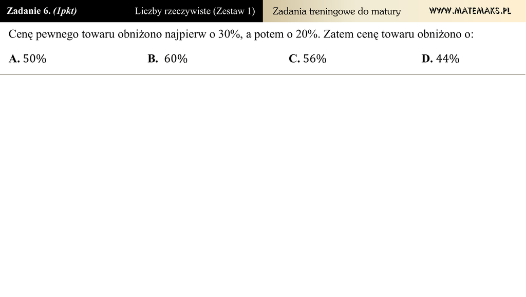 Zadanie 6. (1pkt) Liczby rzeczywiste (Zestaw 1) Zadania treningowe do matury www.matemaks.pl Cenę pewnego towaru obniżono najpierw o 30%, a potem o 20%. Zatem cenę towaru obniżono o: A.50% B. 60% C.56% D.44% Zadanie 6. (1pkt) Liczby rzeczywiste (Zestaw 1) Zadania treningowe do matury www.matemaks.pl Cenę pewnego towaru obniżono najpierw o 30%, a potem o 20%. Zatem cenę towaru obniżono o: A.50% B. 60% C.56% D.44%