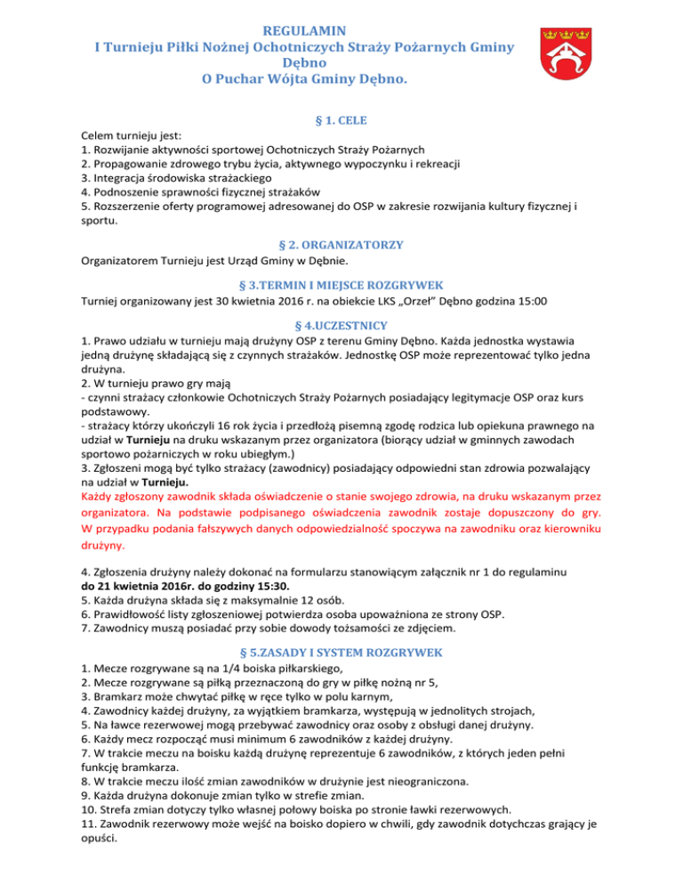 REGULAMIN I Turnieju Piłki Nożnej Ochotniczych Straży Pożarnych Gminy Dębno O Puchar Wójta Gminy Dębno. § 1. CELE Celem turnieju jest: 1. Rozwijanie aktywności sportowej Ochotniczych Straży Pożarnych 2. Propagowanie zdrowego trybu życia, aktywnego wypoczynku i rekreacji 3. Integracja środowiska strażackiego 4. Podnoszenie sprawności fizycznej strażaków 5. Rozszerzenie oferty programowej adresowanej do OSP w zakresie rozwijania kultury fizycznej i sportu. § 2. ORGANIZATORZY Organizatorem Turnieju jest Urząd Gminy w Dębnie. § 3.TERMIN I MIEJSCE ROZGRYWEK Turniej organizowany jest 30 kwietnia 2016 r. na obiekcie LKS „Orzeł” Dębno godzina 15:00 § 4.UCZESTNICY 1. Prawo udziału w turnieju mają drużyny OSP z terenu Gminy Dębno. Każda jednostka wystawia jedną drużynę składającą się z czynnych strażaków. Jednostkę OSP może reprezentować tylko jedna drużyna. 2. W turnieju prawo gry mają - czynni strażacy członkowie Ochotniczych Straży Pożarnych posiadający legitymacje OSP oraz kurs podstawowy. - strażacy którzy ukończyli 16 rok życia i przedłożą pisemną zgodę rodzica lub opiekuna prawnego na udział w Turnieju na druku wskazanym przez organizatora (biorący udział w gminnych zawodach sportowo pożarniczych w roku ubiegłym.) 3. Zgłoszeni mogą być tylko strażacy (zawodnicy) posiadający odpowiedni stan zdrowia pozwalający na udział w Turnieju. Każdy zgłoszony zawodnik składa oświadczenie o stanie swojego zdrowia, na druku wskazanym przez organizatora. Na podstawie podpisanego oświadczenia zawodnik zostaje dopuszczony do gry. W przypadku podania fałszywych danych odpowiedzialność spoczywa na zawodniku oraz kierowniku drużyny. 4. Zgłoszenia drużyny należy dokonać na formularzu stanowiącym załącznik nr 1 do regulaminu do 21 kwietnia 2016r. do godziny 15:30. 5. Każda drużyna składa się z maksymalnie 12 osób. 6. Prawidłowość listy zgłoszeniowej potwierdza osoba upoważniona ze strony OSP. 7. Zawodnicy muszą posiadać przy sobie dowody tożsamości ze zdjęciem. § 5.ZASADY I SYSTEM ROZGRYWEK 1. Mecze rozgrywane są na 1/4 boiska piłkarskiego, 2. Mecze rozgrywane są piłką przeznaczoną do gry w piłkę nożną nr 5, 3. Bramkarz może chwytać piłkę w ręce tylko w polu karnym, 4. Zawodnicy każdej drużyny, za wyjątkiem bramkarza, występują w jednolitych strojach, 5. Na ławce rezerwowej mogą przebywać zawodnicy oraz osoby z obsługi danej drużyny. 6. Każdy mecz rozpocząć musi minimum 6 zawodników z każdej drużyny. 7. W trakcie meczu na boisku każdą drużynę reprezentuje 6 zawodników, z których jeden pełni funkcję bramkarza. 8. W trakcie meczu ilość zmian zawodników w drużynie jest nieograniczona. 9. Każda drużyna dokonuje zmian tylko w strefie zmian. 10. Strefa zmian dotyczy tylko własnej połowy boiska po stronie ławki rezerwowych. 11. Zawodnik rezerwowy może wejść na boisko dopiero w chwili, gdy zawodnik dotychczas grający je opuści. 12. Jeśli zawodnik rezerwowy wejdzie na boisko za wcześnie może zostać ukarany żółtą kartką. 13. Do prowadzenia zawodów organizator wyznacza sędziów, którzy odpowiadają za przebieg i bezpieczeństwo w czasie gry. 14. Rozstrzygnięciom sędziowskim podlegają również przewinienia dokonywane podczas chwilowej przerwy w grze oraz gdy piłka jest poza grą, a także po zakończeniu meczu. 15. Jurysdykcji sędziów podlegają również zawodnicy rezerwowi oraz osoby obsługi drużyny. 16. Za nieprawidłowe i niesportowe zachowanie osoby z obsługi drużyny mogą zostać usunięci z ławki rezerwowych. 17. Rozstrzygnięcia sędziów dotyczące faktów związanych z grą są ostateczne. 18. Sędzia ma prawo nie dopuścić do gry zawodnika wówczas, gdy zawodnik nie zachowuje się sportowo lub jest w stanie wskazującym po spożyciu alkoholu. 19. Ukaranie zawodnika czerwoną kartką skutkuje wykluczeniem zawodnika do końca trwania meczu. 20. W trakcie meczów nie obowiązują przepis o spalonym 21. Auty boczne wykonywane będą z linii bocznej, a piłka wprowadzana będzie do gry nogą. 22. Aut boczny musi zostać wykonany w ciągu 6 sekund. W przeciwnym wypadku sędzia odgwizduje aut dla drużyny przeciwnej. 23. Po wyjściu piłki za linię końcową boiska bramkarz wznawia grę rękoma. Czas trzymania piłki w ręku wynosi maksymalnie 6 sekund. Po wypuszczeniu piłki na nawierzchnię, bramkarz nie może jej ponownie dotknąć rękoma. Z chwilą ustawienia piłki na nawierzchni gra zostaje wznowiona. 24. Bramkarz nie może chwytać piłki w ręce po podaniu od zawodników swojej drużyny. 25. W czasie wykonywania rzutów wolnych, z autu, z rogu, zawodnik drużyny przeciwnej musi zachować odległość 5metrów od piłki. 26. Rzut karny wykonywany będzie z odległości 9 metrów od linii bramkowej. § 6.PUNKTACJA 1. Za wygrany mecz drużyna otrzymuje 3 punkty, za remis 1 punkt, za przegraną 0 punktów. 2. O kolejności miejsc w grupie decyduje większa liczba zdobytych punktów. 3. W przypadku uzyskania równej liczby punktów przez dwie drużyny o kolejności decydują kolejno: 1) wynik bezpośredniego spotkania; 2) lepsza różnica bramek w całym turnieju; 3) większa liczba zdobytych w całym turnieju bramek. 4. W przypadku uzyskania równej liczby punktów przez więcej niż dwie drużyny przeprowadza się dodatkową punktację pomocniczą spotkań wyłącznie pomiędzy zainteresowanymi drużynami (tzw. „mała tabela”), kierując się kolejno zasadami podanymi w ust. 3 w punktach.1, 2 i 3. 5. W przypadku remisu w meczach, które muszą wyłonić zwycięzcę, przeprowadza się serię trzech rzutów karnych. 6. W przypadku remisu po karnych, o których mowa w ust. 5, rzuty karne strzelane są na przemian, aż do wyłonienia zwycięzcy. § 7.NAGRODY I WYRÓŻNIENIA 1. Drużyny zajmujące miejsca I – III otrzymują puchary. Wszystkie drużyny otrzymują dyplomy. 2. Stosowanie innych wyróżnień, nagród, pucharów oraz meda